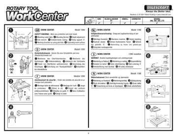Always the Better Idea. Rockford, IL 61109 • Patent Pending • www.milescraft.com GMC ✔ 1 WORK CENTER Model 1098 AXMINSTER ✔ ✔ Model 1098 DREMEL 398, 395, 285, 275 ✔ 5 Veiligheidswaarschuwing: Draag een oogbescherming en een stofmasker. WorkCenter 2 EINHELL WORK CENTER SAFETY WARNING: Wear eye protection and dust mask. 1 Mounting router table 2 Mounting the tool 3 Depth adjustment 4 Use wrench 5 Outside/inside routing 6 Using support 'A' 7 Working direction by using pilot bits 8 Expanding work surface WORK CENTER BLACK & DECKER RT ✔ 1 Montage freestafel 2 Monteren machine 3 Diepte-instelling 4 Gebruik sleutel 5 Binnen-/buitenwerks frezen 6 Gebruik van geleider ‘A’ 7 Werkrichting bij frezen met geleide-pen 8 Vergroten werkoppervlak Modell 1098 Sicherheitshinweis: Setzen Sie eine Schutzbrille und eine Staubschutzmaske auf. WORK CENTER 1098-modellen VARNING! Använd skyddsglasögon och andningsmask. 1 Montieren des Oberfräsentisches 2 Montieren des Werkzeuges 3 Tiefeneinstellung 4 Gebrauch des Schlüssels 5 Fräsen von Oberflächen außenen/innen 6 Anwendung des Anschlages 7 Einrichtung von “Rundspitzfräsern” 8 Vergrößern 6 1 Montering av fräsbord 2 Montering av verktyg 3 Djupinställning 4 Använd en nickel 5 Inner-/ytterfräsning 6 Med underlag ‘A’ 7 Arbetsriktning med styrbitar 8 Att utöka arbetsytan der Arbeitsfläche WORK CENTER WORK CENTER 3 Modèle 1098 Modell 1098 Sikkerhetsvarsel: Bruk vernebriller og støvmaske. Avertissement de sécurité : Porter des lunettes de sécurité et un masque anti-poussière. 1 Montering av fresebord 2 Monteringsverktøy 3 Dybdejustering 4 Bruk skrunøkkel 5 Utvendig/innvendig fresing 6 Bruke støtte ‘A’ 7 Freseretning ved bruk av styretapper 8 Utvide arbeidsflaten 1 Montage table de défonceuse 2 Montage de l’outil 3 Jauge de profondeur 4 Utilisez la clé 5 Fraiser des surfaces extérieurs/intérieurs 6 Utilisation du guide ‘A’ 7 Sens d’utilisation avec fraises avec guide 8 Elargir la table 4 7 8 1 Always the Better Idea. Rockford, IL 61109 • Patent Pending • www.milescraft.com GMC ✔ 1 WORK CENTER Malli 1097 WORK CENTER Varoitus: Käytä silmä- ja hengityssuojusta. WorkCenter 2 Model 1097 ✔ ✔ Modello 1097 DREMEL 398, 395, 285, 275 ✔ 5 della superficie di lavoro WORK CENTER 1 Montering af fræsebord 2 Montering af værktøj 3 Dybdejustering 4 Brug skruenøgle 5 Udvendig/indvendig fræsning 6 Brug underlag ‘A’ 7 Arbejdsretning for styrebits 8 Udvidelse af arbejdsområdet 3 AXMINSTER 1 Montaggio della tavola di fresatura 2 Installazione dell’utensile 3 Regolazione della profondita 4 Utilizzare la chiave 5 Fresatura di superfici esterne/interne 6 Utilizzo della guida ‘A’ 7 Direzione di lavorazione con uso di frees guida 8 Estensione Sikkerhedsadvarsel: Vi anbefaler brug af beskyttelsesbriller og støvmaske. WORK CENTER EINHELL Avvertenza sulla sicurezza: indossare occhiali protettivi e maschere antipolvere. 1 Jyrsinpöydän asentaminen 2 Työkalun asentaminen 3 Syvyyden säätäminen 4 Käytä avainta 5 Sisä-/ulkopuolinen jyrsintä 6 ‘A’-tuen käyttäminen 7 Työskentelysuunta ohjausterää käytettäessä 8 Työskentelyalan suurentaminen WORK CENTER BLACK & DECKER RT ✔ Modelo 1097 6 Advertência de segurança: Utilize protecção ocular e máscara contra poeiras. 1 Montagem de mesa da debastadora 2Montagem da ferramenta 3 Regulação de profundidade 4 Utilize a chave de porcas 5 Desbaste de superficies exteriors/interiors 6 Forma de utilização da guia ‘A’ 7 Direcção de trabalho utilizando brocas com guias 8 Expandir a superfície de trabaliho Modelo 1097 Advertencia de seguridad: use protección ocular y mascarilla contra el polvo. WORK CENTER 1 Montaje mesa buriladora 2 Montaje de la herramienta 3 Ajuste de profundidad 4 Utilice llave 5 Fresar de superficies exteriors/interiors 6 Forma de empleo de la guia ‘A’ 7 Dirección de trabajo usando guias 8 Agrandar la mesa Μοντέλο 1098 7 Προειδοποίηση ασφαλείας: Γυαλιά προστασίας και προσωπίδα με φίλτρο σκόνης. 1Προσδεοη τραπεζας ϕρεζαρισματος 2Προσδεοη εργαλειου 3Ρυθμιοη βαθους 4Χρηοη κλειδιου (εργαλειου) 5Εξωτερικο/Εοωτερικο ϕρεζαρισμα 6Χρηοη υποστηριξης ‘A’ 7Κατευθυνοη εργασιας χρησιμοποιωντας πιλοτικο τρυπανι 8Διευρυνοη επιφρανειας εργασιας 4 2 8