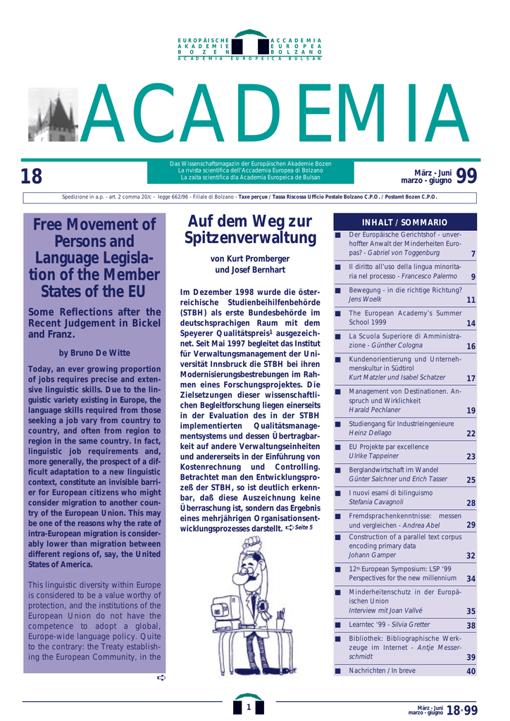 A C C A DE MI A E U R O P E A B O L Z A N O E U R OP Ä I S C H E A K A D E M I E B O Z E N A C A D E M I A E U R O P E I C A B U L S A N ACADEMIA Das Wissenschaftsmagazin der Europäischen Akademie Bozen La rivista scientifica dell'Accademia Europea di Bolzano La zaita scientifica dla Academia Europeica de Bulsan 18 März - Juni marzo - giugno 99 Spedizione in a.p. - art. 2 comma 20/c - legge 662/96 - Filiale di Bolzano - Taxe perçue / Tassa Riscossa Ufficio Postale Bolzano C.P.O. / Postamt Bozen C.P.O. Free Movement of Persons and Language Legislation of the Member States of the EU Some Reflections after the Recent Judgement in Bickel and Franz. by Bruno De Witte Today, an ever growing proportion of jobs requires precise and extensive linguistic skills. Due to the linguistic variety existing in Europe, the language skills required from those seeking a job vary from country to country, and often from region to region in the same country. In fact, linguistic job requirements and, more generally, the prospect of a difficult adaptation to a new linguistic context, constitute an invisible barrier for European citizens who might consider migration to another country of the European Union. This may be one of the reasons why the rate of intra-European migration is considerably lower than migration between different regions of, say, the United States of America. Auf dem Weg zur Spitzenverwaltung von Kurt Promberger und Josef Bernhart Im Dezember 1998 wurde die österreichische Studienbeihilfenbehörde (STBH) als erste Bundesbehörde im deutschsprachigen Raum mit dem Speyerer Qualitätspreis1 ausgezeichnet. Seit Mai 1997 begleitet das Institut für Verwaltungsmanagement der Universität Innsbruck die STBH bei ihren Modernisierungsbestrebungen im Rahmen eines Forschungsprojektes. Die Zielsetzungen dieser wissenschaftlichen Begleitforschung liegen einerseits in der Evaluation des in der STBH implementierten Qualitätsmanagementsystems und dessen Übertragbarkeit auf andere Verwaltungseinheiten und andererseits in der Einführung von Kostenrechnung und Controlling. Betrachtet man den Entwicklungsprozeß der STBH, so ist deutlich erkennbar, daß diese Auszeichnung keine Überraschung ist, sondern das Ergebnis eines mehrjährigen Organisationsentwicklungsprozesses darstellt. ➪Seite 5 This linguistic diversity within Europe is considered to be a value worthy of protection, and the institutions of the European Union do not have the competence to adopt a global, Europe-wide language policy. Quite to the contrary: the Treaty establishing the European Community, in the ➪ 1 INHALT / SOMMARIO ■ ■ Der Europäische Gerichtshof - unverhoffter Anwalt der Minderheiten Europas? - Gabriel von Toggenburg 7 Il diritto all’uso della lingua minoritaria nel processo - Francesco Palermo 9 ■ Bewegung - in die richtige Richtung? Jens Woelk 11 ■ The European Academy’s Summer School 1999 14 ■ La Scuola Superiore di Amministrazione - Günther Cologna 16 ■ Kundenorientierung und Unternehmenskultur in Südtirol Kurt Matzler und Isabel Schatzer 17 ■ Management von Destinationen. Anspruch und Wirklichkeit Harald Pechlaner 19 ■ Studiengang für Industrieingenieure Heinz Dellago 22 ■ EU Projekte par excellence Ulrike Tappeiner 23 ■ Berglandwirtschaft im Wandel Günter Salchner und Erich Tasser 25 I nuovi esami di bilinguismo Stefania Cavagnoli 28 ■ ■ Fremdsprachenkenntnisse: messen und vergleichen - Andrea Abel 29 ■ Construction of a parallel text corpus encoding primary data Johann Gamper 32 ■ 12th European Symposium: LSP ‘99 Perspectives for the new millennium 34 ■ Minderheitenschutz in der Europäischen Union Interview mit Joan Vallvé 35 ■ Learntec ‘99 - Silvia Gretter ■ Bibliothek: Bibliographische Werkzeuge im Internet - Antje Messerschmidt 39 ■ Nachrichten / In breve März - Juni marzo - giugno 38 40 18•99 ACADEMIA BEREICH ETHNISCHE MINDERHEITEN UND REGIONALE AUTONOMIEN AREA SCIENTIFICA MINORANZE ETNICHE ED AUTONOMIE REGIONALI version modified by the Treaty of Maastricht in 1992, expressly holds that the EC shall respect the existing patterns of linguistic diversity. Despite this solemn p l e d g e , national linguistic policies do come, to some extent, within the scope of European Community law, namely whenever they constitute a barrier to economic integration. This connection between language use and economic integration arises with regard to each of the central principles of economic integration: the free movement of goods, the free movement of services and the free movement of persons. It is the latter principle which will be examined in this article. Free movement and non discrimination, two central EU principles The principle of the free movement of persons was proclaimed already by the EEC Treaty (as it was then called) when it was concluded in 1957, and was gradually realised in the following years and decades. It means that the EU “Member States” (a global term which comprises the public authorities at the national, regional and local level) may not adopt or apply legal measures which restrict such free movement. European citizens have, in principle, the right to enter the territory of other EU states than their own, and to remain there; their most important right, once they live in that other European country, is the right not to be discriminated by the host state on account of their nationality. This central principle of non-discrimination has implications for language legislation in the EU countries. This was acknowledged, already very early on, in a Regulation adopted by the Council of the (then) European Com- März - Juni - giugno 18•99 marzo munities in 1968 which was entirely devoted to the practical realisation of the equal treatment of migrant workers originating from other Community countries. This Regulation No.1612/68 prohibited not only direct discriminat i o n against those migrants in the field of employment (something which resulted directly f