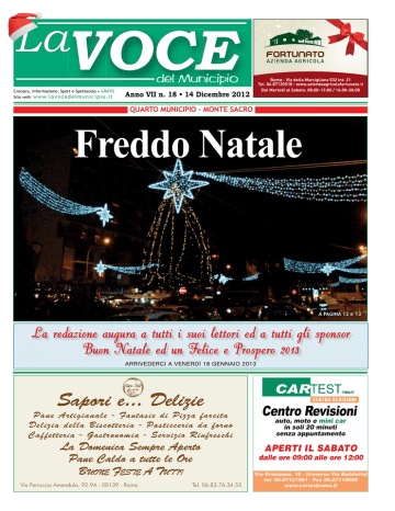 Cronaca, Informazione, Informazione, Sport Cronaca, SporteeSpettacolo Spettacolo••GRATIS GRATIS Sito web: web: w ww ww. w. l a v o c e d e l m muunniicciippiioo..iitt Sito Anno VII n. 04 18 • 14 VI n. 25 Dicembre Febbraio 2012 2011 Roma - Via della Marcigliana 532 Int. 21 Tel. 06.87120518 - www.aziendaagricolafortunato.it Dal Martedì al Sabato: 08:00-13:00 / 16:00-20:00 QUARTO QUARTOMUNICIPIO MUNICIPIO--MONTE MONTESACRO SACRO Quel pasticciaccio delle strade private Freddo Natale A PAGINA 8 A PAGINA 12 e 13 La redazione augura a tutti i suoi lettori ed a tutti gli sponsor Buon Natale ed un Felice e Prospero 2013 Costretti a farsi 14 piani a piedi Presto il prolungamento di via Ojetti A largo San Giusto 10, palazzo Ater con ascensore sempre rotto: arrivato al piano prescelto le porte non si aprono I cantieri stanno completando l’opera. Resta solo la connessione con la Nomentana nei pressi della Citroën (PAGINA 7) (PAGINA 12) Edificio occupato per farne uno studentato È in via Monte Meta 21, uno stabile di proprietà del Comune, inutilizzato da tempo. Ennesimo confronto politico (PAGINA 14) ARRIVEDERCI A VENERDÌ 18 GENNAIO 2013 Sapori Delizie “Saporie... e... Delizie” Pane Artigianale - Fantasie di farcita Pizza farcita Pane Artigianale - Fantasie di Pizza Delizia della Biscotteria --Pasticceria da forno da forno Delizia della Biscotteria Pasticceria Gastronomia - Servizio- Rinfreschi Caf fetteria - Gastronomia Servizio Rinfreschi La Domenica Sempre Aperto Pane Caldo a tutte le Ore Buone Feste A Tutti Via Giovanni Lanza, 102-104 00184 Roma Via Ferruccio Amendola, 92-94 - 00139 - Roma Tel. 06.83.51.87.20 Tel. 06.83.76.34.55 APERTI IL SABATO dalle ore 09:00 alle ore 12:00 pagina 2 Venerdì 14 Dicembre 2012 Rappresentanti del coordinamento scuola Roma in riunione al liceo “Aristofane” Docenti in assemblea per salvare la scuola pubblica Il problema più discusso è il precariato. Concorso truffa con quiz illogici. A rischio i diritti dei docenti. Ex-Aprea solo congelato I l 29 Novembre presso il liceo “Aristofane” si è tenuta un’assemblea indetta dal coordinamento scuole di Roma, per definire i punti cardine delle problematiche legate alla scuola pubblica. Le tematiche messe “in ballo” sono sempre le stesse. Che fine ha fatto il ddl Aprea-Ghizzoni? È stato messo in stand-by o definitivamente annullato? Il problema più pesante resta il precariato, aggravato dall’umiliante concorsone indetto dal ministro Profumo. Un popolo di docenti precari, se vorrà ancora sperare in una cattedra, dovrà recarsi, il prossimo 17 e 18 dicembre, ad un sorta di patibolo informatico che sfornerà quiz di logica contorta (a quel che si evince dall’eserciziario pubblicato dal Miur). Se risponderanno esattamente a 35 quiz su 50, passeranno il turno delle preselezioni e potranno affrontare la vera prova. Passi per le new entry, ma i cinquantenni in graduatoria da 15 anni che già hanno superato concorsi e ottenuto abilitazioni perché devono essere nuovamente valutati? Concorso truffa e beffa? Nel corso dell’assemblea i docenti si sono trovati in concerto su un punto fondamentale: «Non dobbiamo abbassare la guardia rispetto all’innalzamento delle ore frontali di lezioni, al ddl 953 (Aprea) e alla diminuzione dei diritti della docenza» esprimono assertivi. «Non è una protesta corporativa, ma si riferisce a quelle proposte che mettono in discussione la qualità del servizio scolastico. A questo si aggiunge il fatto che c’è un disegno di legge, per quanto emendato e corretto, l’ex Aprea, che andrebbe smantellato e riscritto, perché non dà garanzie sufficien- ti di mantenimento del carattere pubblico della scuola» commenta il professor Oneili dell’istituto “Aristofane”. Importante l’intervento di Roberto Villani, docente dell’istituto “Carlo Levi”: «La lotta sarà lunga e dura. Il fiscal compact si abbatte sulle nostre teste e indurrà il prossimo governo a fare una lunga serie di tagli. Una delle cose che dobbiamo fare è mantenere attivo questo coordinamento e potenziarlo». E per quanto riguarda la facciata delle innovazioni tecnologiche proposte dal Miur, qualcuno ha ricordato le parole del sindaco di Firenze, Matteo Renzi: «Nelle nostre scuole installano le Lim, ma stanno cascando i solai». Alba Vastano Aumentata l’offerta di trasporto pubblico, su strada la navetta Shopping 1 Il piano Tpl per le feste di Natale Agevolazioni anche sul fronte della sosta, attenzione agli orari delle Ztl I n occasione delle festività natalizie è stato predisposto un aumento dell’offerta di trasporto pubblico sia nei giorni feriali che nei giorni festivi ed è stato varato un piano integrato di potenziamento dei servizi e agevolazioni tariffarie, rinforzando anche le vigenti normative sulla Ztl che limitano l’accessibilità al trasporto privato. Inoltre, è stata prevista, come lo scorso anno, l’attivazione di una linea navetta per lo shopping (la Shopping 1) per il Via Annibale M. di Francia, 62 00138 Roma raggiungimento delle Anno VIIpasticciaccio - n.18 - 14 Dicembre 2012strade private Quel delle strade commerciali del Direttore Centro Storico, fornenNicola Sciannamè 392 912 44 74 do il collegamento con e-mail: [email protected] punti di scambio funDirettore Responsabile zionali in quell’area, Mario Baccianini quali parcheggi, fermaEditore te Metro, capolinea e Edizioni Periodiche Locali nodi di Tpl. Il periodo Edizione IV Municipio di potenziamento delle Direzione linee di TPL va dall’8 Via Radicofani, 209 - 00138 Roma al 24 Dicembre 2012. Tel. 06.8819301 L’intensificazione del Pubblicità servizio è programmata 393 99 87 284 Municipio VI_04_Municipio VI_04.qxd 24/02/2011 17.01 Pagina 1 Cronaca, Informazione, Sport e Spettacolo • GRATIS Sito web: w w w. l a v o c e d e l m u n i c i p i o . i t Anno VI n. 04 • 25 Febbraio 2011 QUARTO MUNICIPIO - MONTE SACRO A PAGINA 8 Costretti a farsi 14 piani a piedi Presto il prolungamento di via Ojetti A l