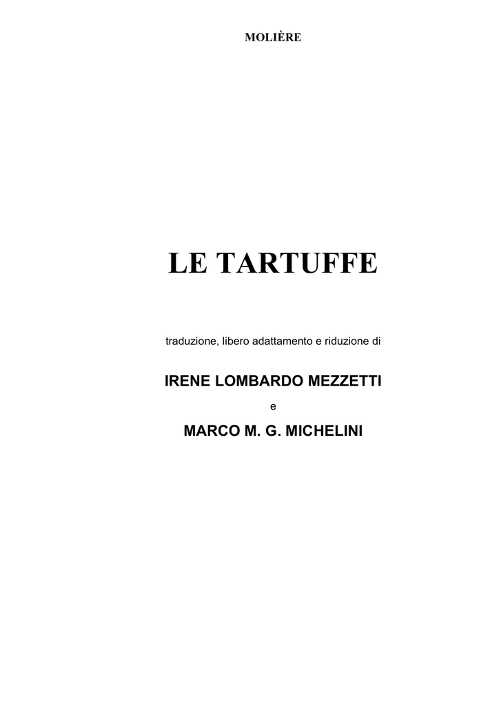 MOLIÈRE LE TARTUFFE traduzione, libero adattamento e riduzione di IRENE LOMBARDO MEZZETTI e MARCO M. G. MICHELINI Personaggi UN MENESTRELLO MADAME PERNELLE PHILIPPE ORGON ELMIRE DAMIS MARIANE CLEANTE DORINE TARTUFFE VALERE MONSIEUR LOYAL UN UFFICIALE madre di Orgon suo nipote ricco borghese sua moglie figlio di Orgon figlia di Orgon fratello di Elmire cameriera di Mariane falso credente Fidanzato di Mariane ufficiale giudiziario dei gendarmi ATTO PRIMO È in scena il menestrello. MENESTRELLO. Se gli alberi potessero pensare e le foglie sapessero parlare ai passeri sui rami raccontare il vento sempre potrebbe portare le storie allegre più belle e più rare, le dolci fiabe che fanno sognare le mammine ed i bimbi incantare. Ma oggi il mondo non va più a dovere: chi deve dare domanda d’avere, chi offende l’altro accusa poi il ferito, assolto è il ladro ed il giusto è punito; spesso il fratello sull’altro si scaglia, perché vuol l’oro che ciascuno abbaglia. Non val più lealtà, cervello ed arte, ma chi nel tradimento ha la sua parte. Rattristarvi non voglio più, a ragione. Beato a chi non manca acqua e sapone! Laviamo il mondo! Ma io sto scherzando. La storia udite or, che sta iniziando. Esce il menestrello. Entrano M.me Pernelle, Philippe, Elmire, Mariane, Cléante, Damis e Dorine. M.me PERNELLE. Philippe, chéri, andiamocene da questa casa! PHILIPPE. Perché, grand mémé? M.me PERNELLE. E non chiedere sempre il perché! Su, vieni! ELMIRE. Signora, andate così di fretta, che è difficile seguirvi. M.me PERNELLE. Non fate complimenti! Non vi disturbate! ELMIRE. Cerco di comportarmi come una nuora educata. Veramente, maman, non capisco questa vostra fretta! M.me PERNELLE. Ah, non capite? Sarò più esplicita. Non tollero questo vostro ménage! Me ne vado, molto contrariata. Qui non mi si usa il minimo riguardo. 6 ELMIRE. Ma cosa dite, maman? M.me PERNELLE. Mi si contraddice ogni volta che apro bocca; tutti parlano ad alta voce e nessuno mi ascolta! ELMIRE. Voi, però… PHILIPPE. Grand mémé, voi parlate più forte di loro! M.me PERNELLE. Taci, tu! Voi, mia cara, avete la lingua troppo lunga e siete un po’ troppo impertinente! ELMIRE. Ma io… M.me PERNELLE. Insomma, volete sempre dire l’ultima, voi! PHILIPPE. Ma, grand mémé, la zia voleva solo… M.me PERNELLE. Ti ho già detto di fare silenzio! Ci mancherebbe adesso che anche i piccoli… DAMIS. Phìlippe, non è poi così piccolo. Ha diritto ad avere una sua opinione. M.me PERNELLE. Tu, ragazzo mio, sei un asino. MARIANE. Adesso offendete mio fratello. Secondo me… M.me PERNELLE. Mon Dieu ! Ecco la sorellina, così riservata, la santarellina, che non interviene mai! Già, lo dice il proverbio: l’acqua cheta… Sappi che il tuo comportamento non è migliore di quello degli altri della casa. ELMIRE. Però… M.me PERNELLE. L’avrò detto cento volte a mio figlio, vostro padre, che tu e tuo fratello sareste diventati dei cattivi soggetti, destinati a dargli solo dispiaceri. PHILIPPE. Questo la nonna lo dice sempre anche a mio padre, (prende uno schiaffo dalla nonna) ELMIRE. Ma, maman, dopo tutto M.me PERNELLE. Mia cara, non dispiacetevi se vi dico che la vostra condotta non è affatto irreprensibile. Dovreste dare il buon esempio qui, che diamine! La loro povera mamma, quella sì, poverina… Era una santa donna! ELMIRE. Eh già! M.me PERNELLE. Vedete mia cara, voi vestite con troppo sfarzo. Siete, come dire?, troppo appariscente! CLÉANTE. Ma, signora, dopo tutto, se mia sorella ha l’approvazione del marito… PHILIPPE (in disparte ad Elmire). Io vi trovo bellissima, zia! (le dà un bacio) ELMIRE. Grazie, caro! M.me PERNELLE (a Cléante). Quanto a voi, se fossi nei panni di mio figlio, vi pregherei gentilmente di non metter piede in questa casa. CLÉANTE. Questa è bella! E perché? 7 M.me PERNELLE. Voi siete indubbiamente un uomo di cultura e come tale vi stimo, sia bene inteso; ma non vi fate riguardo di manifestare certe regole di vita che la gente perbene dovrebbe rifiutare. Scusate, se parlo con franchezza! È il mio carattere: quello che ho sulla lingua, l’ho nel cuore. DAMIS. Su questo nessuno ha dubbi. Allora, nonna, voi apprezzerete incondizionatamente il signor Tartuffe! M.me PERNELLE. Oh, senza riserve! Un sant’uomo, quello, che andrebbe sempre ascoltato. Mi rammarico ch’egli sia oggetto di critiche malevole da parte d’un pazzo come te. DAMIS. Cosa?! Dovrei sopportare che quel critico bacchettone qui dentro si comporti da tiranno, senza che noi possiamo almeno divertirci a dichiarare il nostro dissenso? DORINE. Secondo il signor Tartuffe, tutto quello che facciamo è sbagliato. Di fronte a lui, ci si sente sempre dei criminali! M.me PERNELLE. Perché non capite ch’egli agisce per il vostro bene, per la salvezza della vostra anima. Mio figlio dovrebbe ottenere con ogni mezzo che gli voleste bene. DAMIS. Eh no, cara nonna! Nessuno può obbligarmi a volergli bene, neanche mio padre! Non c’è volta che quel suo modo di comportarsi non mi faccia imbestialire. E, secondo me, non è tutto qui. Uno di questi giorni scoppierà uno scandalo. DORINE. Sì, è un vero scandalo che un estraneo sia diventato il padrone, qui! ELMIRE. Dorine, ti prego! DORINE. Lasciatemi dire, signora! Un miserabile che, quando venne, non aveva neppure le scarpe, portava un abituccio tutto buchi. Insomma, faceva pena. Ora è lui che detta la legge e pone il veto a tutti e a tutto. M.me PERNELLE. Se le sue massime fossero osservate, tutto andrebbe meglio. DORINE. Ma, signora, quello che in lui pare santità, in effetti è solo ipocrisia! M.me PERNELLE. E voi, Elmire, tollerate questa linguaccia?! DORINE. Pensate come volete! Io di lui non mi fido. M.me PERNELLE. Molto male, ragazza! Non riuscite a volergli bene, perché vi dice chiaramente il fatto vostro; se vi fa rimarcare le colpe, è a fin di bene! Ma voi non lo capite! DORINE. Allora perché non vuole che nessuno frequenti la casa? Perché ci ha proibito di ricevere vi