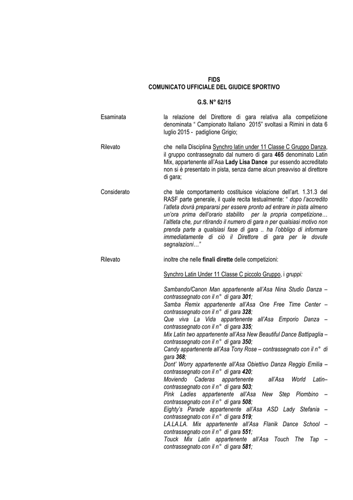 FIDS COMUNICATO UFFICIALE DEL GIUDICE SPORTIVO G.S. N° 62/15 Esaminata la relazione del Direttore di gara relativa alla competizione denominata “ Campionato Italiano 2015” svoltasi a Rimini in data 6 luglio 2015 - padiglione Grigio; Rilevato che nella Disciplina Synchro latin under 11 Classe C Gruppo Danza, il gruppo contrassegnato dal numero di gara 465 denominato Latin Mix, appartenente all’Asa Lady Lisa Dance pur essendo accreditato non si è presentato in pista, senza darne alcun preavviso al direttore di gara; Considerato che tale comportamento costituisce violazione dell’art. 1.31.3 del RASF parte generale, il quale recita testualmente: “ dopo l’accredito l’atleta dovrà prepararsi per essere pronto ad entrare in pista almeno un’ora prima dell’orario stabilito per la propria competizione… l’altleta che, pur ritirando il numero di gara n per qualsiasi motivo non prenda parte a qualsiasi fase di gara .. ha l’obbligo di informare immediatamente di ciò il Direttore di gara per le dovute segnalazioni…” Rilevato inoltre che nelle finali dirette delle competizioni: Synchro Latin Under 11 Classe C piccolo Gruppo, i gruppi: Sambando/Canon Man appartenente all’Asa Nina Studio Danza – contrassegnato con il n° di gara 301; Samba Remix appartenente all’Asa One Free Time Center – contrassegnato con il n° di gara 328; Que viva La Vida appartenente all’Asa Emporio Danza – contrassegnato con il n° di gara 335; Mix Latin two appartenente all’Asa New Beautiful Dance Battipaglia – contrassegnato con il n° di gara 350; Candy appartenente all’Asa Tony Rose – contrassegnato con il n° di gara 368; Dont’ Worry appartenente all’Asa Obiettivo Danza Reggio Emilia – contrassegnato con il n° di gara 420; Moviendo Caderas appartenente all’Asa World Latin– contrassegnato con il n° di gara 503; Pink Ladies appartenente all’Asa New Step Piombino – contrassegnato con il n° di gara 508; Eighty’s Parade appartenente all’Asa ASD Lady Stefania – contrassegnato con il n° di gara 519; LA.LA.LA. Mix appartenente all’Asa Flanik Dance School – contrassegnato con il n° di gara 551; Touck Mix Latin appartenente all’Asa Touch The Tap – contrassegnato con il n° di gara 581; C’est la Vie Man appartenente all’Asa Swing Dance - contrassegnato con il n° di gara 584; Synchro Latin Open Classe C piccolo Gruppo, i gruppi: Extreme Samba appartenente all’Asa Solero Dance – contrassegnato con il n° di gara 312; Come With Me appartenente all’Asa Sandy Club – contrassegnato con il n° di gara 320; Jubaba Ritimo De Bob Bon appartenente all’Asa Let’s Dance Club – contrassegnato con il n° di gara 366; Quando Quando appartenente all’Asa ASD Team Diablo – contrassegnato con il n° di gara 350; Candi appartenente all’Asa Tony rose – contrassegnato con il n° di gara 380; Mix latin appartenente all’Asa Full Dance Italia SSD – contrassegnato con il n° di gara 445; New Angel Mex appartenente all’Asa ASD New Angel– contrassegnato con il n° di gara 451; Hey Boyfriend appartenente all’Asa ASD Team Diablo – contrassegnato con il n° di gara 472; Remix Latin appartenente all’Asa ASD CCS Formello – contrassegnato con il n° di gara 481; Pata pata appartenente all’Asa ASD Team Diablo – contrassegnato con il n° di gara 488; No Boyfriend appartenente all’Asa ASD Sinergia e Movimento – contrassegnato con il n° di gara 513 Synchro Modern Under 11 Classe C piccolo Gruppo, i gruppi: Lovumba appartenente all’Asa The Queen of Dance – contrassegnato con il n° di gara 415; Hush appartenente all’Asa ASD Dancing Queen – contrassegnato con il n° di gara 457; Up Town Funk appartenente all’Asa Batucada Dance School – contrassegnato con il n° di gara 590; Synchro Modern Open Classe C piccolo Gruppo, i gruppi: Charlie Chaplin appartenente all’Asa Batucada Dance School – contrassegnato con il n° di gara 324; I Burattini appartenente all’Asa Passione Danza – contrassegnato con il n° di gara 398; Synchro Latin Open Classe C Gruppo Danza, i gruppi: Latin Dance appartenente all’Asa New tip Tap Club – contrassegnato con il n° di gara 415; Celebrate Mix appartenente all’Asa Procivitate Dance ASD – contrassegnato con il n° di gara 359; Mix Latin appartenente all’Asa ASD Dance Latin Jive – contrassegnato con il n° di gara 382; Choreographic Dance Under 11 Classe C Piccolo Gruppo, i gruppi: L’ombelico del Mondo appartenente all’Asa l’alma Latina – contrassegnato con il n° di gara 315; King House appartenente all’Asa World latin – contrassegnato con il n° di gara 500 Choreographic Dance Open Classe C Piccolo Gruppo, i gruppi: Buyame appartenente all’Asa D.D. Emanuel – contrassegnato con il n° di gara 490; Dont’s stop the part appartenente all’Asa GMA Dance Academy – contrassegnato con il n° di gara 498; Ballando appartenente all’Asa New Star Dance Monreale – contrassegnato con il n° di gara 579; Volare appartenente all’Asa L’alma Latina SSD a R.L. – contrassegnato con il n° di gara 580; Choreographic Dance Under 11 Classe C Gruppo Danza, i gruppi: Choreographic latin appartenente all’Asa Swing Dance – contrassegnato con il n° di gara 377; Latin Can Can appartenente all’Asa Emozioni Latine– contrassegnato con il n° di gara 392; Arabesque appartenente all’Asa Tony Rose – contrassegnato con il n° di gara 554; Choreographic Dance Open Classe C Gruppo Danza, il gruppo: Medely Balla appartenente all’Asa Procivitate ASD – contrassegnato con il n° di gara 390 sono stati richiamati i dal Direttore di gara perché presentavano tutti un’irregolarità nell’abbigliamento, contravvenendo a quanto previsto dall’art. 1.20 del RASF; DELIBERA Di infliggere all’asa Lady Lisa Dance la sanzione dell’ ammonizione con diffida di infliggere alle Asa: Nina Studio Danza One Free Time Center Emporio Danza ASD New Beautiful Battipaglia Obiettivo Danza Reggio Emi
