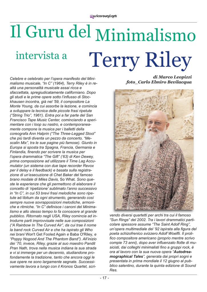 Il Guru del Minimalismo musicaround.net intervista a Terry Riley di Marco Leopizzi foto_Carlo Elmiro Bevilacqua Celebre e celebrato per l’opera manifesto del Minimalismo musicale, “In C” (1964), Terry Riley è in realtà una personalità musicale assai ricca e sfaccettata, spregiudicatamente californiano. Dopo gli studi e le prime opere sotto l’influsso di Stockhausen incontra, già nel ’59, il compositore La Monte Young, da cui assorbe la lezione, e comincia a sviluppare la tecnica delle piccole frasi ripetute (“String Trio”, 1961). Entra poi a far parte del San Francisco Tape Music Center, cominciando a sperimentare con i loop su nastro, e contemporaneamente compone la musica per i balletti della coreografa Ann Halprin (“The Three-Legged Stool” che più tardi diventa un pezzo da concerto, “Mescalin Mix”, tra le sue pagine più famose). Giunto in Europa si sposta tra Spagna, Francia, Germania e Finlandia, finendo per scrivere la musica per l’opera drammatica “The Gift” (‘63) di Ken Dewey, prima composizione ad utilizzare il Time Lag Accumulator (un sistema con due tape recorder Revox per il delay e il feedback) e basata sulla registrazione di un’esecuzione di Chet Baker del famoso brano modale di Miles Davis, So What. Sono queste le esperienze che gli permettono di elaborare il concetto di ‘ripetizione’ sublimato l’anno successivo in “In C”, in cui 53 brevi frasi melodiche sono ripetute ad libitum da ogni strumento, generando così sempre nuove sovrapposizioni melodiche, armoniche e ritmiche. “In C” definisce i canoni del Minimalismo e allo stesso tempo lo fa conoscere al grande pubblico. Ritornato negli USA, Riley comincia ad introdurre parti improvvisate nelle sue composizioni (“A Rainbow In The Curved Air”, da cui trae il nome la band rock Curved Air e che ha ispirato gli Who nei brani Won't Get Fooled Again e Baba O'Riley, e “Poppy Nogood And The Phantom Band”). All’inizio dei ’70, invece, Riley, grazie al suo maestro Pandit Pran Nath, trova nella musica indiana la sua strada e vi si immerge per un decennio, studiandone profondamente la tradizione, tanto che ancora oggi le sue opere ne sono largamente segnate. Successivamente lavora a lungo con il Kronos Quartet, scri- 17 - vendo diversi quartetti per archi tra cui il famoso “Sun Rings” del 2002. Tra i lavori drammatici particolare spessore assume “The Saint Adolf Ring”, un’opera multimediale del ’92 ispirata alla figura del poeta schizofrenico svizzero Adolf Woelfli. Il prolifico compositore americano (proprio mentre scrivo compie 73 anni), dopo aver influenzato flotte di musicisti, dai colleghi minimalisti fino a gruppi rock, è ora al lavoro con la sua nuova opera “Autodreamographical Tales”, generata dai propri sogni e presentata in prima mondiale il 12 giugno al pubblico salentino, durante la quinta edizione di Sound Res. musicaround.net sica fosse simile alla combinazione di orbite diverse. Marco Leopizzi: Per cominciare, ci parla della sua esperienza con il San Francisco Tape Music Center e con la Tape Music in generale? Terry Riley: Il San Francisco Tape Music Center fu fondato [nel 1962, ndr] da Morton Subotnick, Ramon Sender e Pauline Oliveros, e la mia esperienza con i tape loop fu quella di comporre assieme a La Monte Young le musiche per i balletti della coreografa Ann Halprin. Ho trovato me stesso. A quei tempi il nastro era l’estensione della musica suonata, ed erano tempi molto eccitanti perché non c’erano ancora i sintetizzatori e i computer ma solo un nastro. M. L.: Come si è avvicinato, invece, alla musica indiana e come ha influito sulla sua arte? T. R.: La musica indiana è arrivata nella mia vita grazie a Pandit Pran Nath, un grandissimo cantante indiano che incontrai nel 1970. Era un fantastico performer e compositore e portava con sé la più profonda ed antica tradizione della musica classica indiana, e questa tradizione aveva idee molto simili alle mie sulla mia musica. La musica indiana è molto legata al mood, agli umori, a loro volta relativi ai differenti momenti del giorno, per i quali infatti ci sono rāga diversi. È molto importante tener conto degli stati psicologici. M. L.: Fu questa esperienza ad ispirarle il concetto della ‘ripetizione’ che la portò a comporre il capolavoro “In C”? E cosa rappresenta per lei questo concetto? M. L.: Con i Kronos Quartet è invece ritornato alla dimensione ‘occidentale’ della musica. Come ha adattato ciò che aveva acquisito dalla musica indiana alle composizioni per i Kronos? T. R.: È vero, fu il lavoro con i loop a portarmi a scrivere musica basata sulla ripetizione. Cominciai a sviluppare diverse tecniche usando nastri di lunghezze differenti che giravano contemporaneamente. Ma iniziai anche a pensare alla somiglianza con il modo in cui i pianeti ruotano attorno al sole su diverse orbite. Cominciai a pensare che la mu- T. R.: Quando li incontrai i musicisti del Kronos Quartet erano molto giovani e stimolanti, e io non scrivevo più musica da dieci anni, dai ’70. Mi ero dedicato soprattutto alla musica indiana ed alle improvvisazioni per piano. Ciò che è accaduto con i Kronos è stato probabilmente un ritorno alla notazione, e un ripensamento della combinazione tra musica occidentale e musica orientale, trovando le similitudini e le divergenze. M. L.: Infine, “Autodreamographical Tales”. Ci racconti la sua nuova opera e l’esperienza di Sound Res. T. R.: “Autodreamographical Tales” è nata per la commissione di una radio californiana, che mi chiese di scrivere un pezzo di mezzora che integrasse musica e parole. A quell’epoca tenevo un diario dei sogni su cui ogni giorno annotavo ciò che avevo sognato, ho usato questa base per l’opera aggiungendoci dei suoni. Quando l’anno scorso feci ascoltare la musica ad Evan Ziporyn, [dei Bang On A Can All Stars, ndr] lui mi chiese di scrivere un pezzo intero per eseguirlo dal vivo con il sestetto. Abbiamo cercato