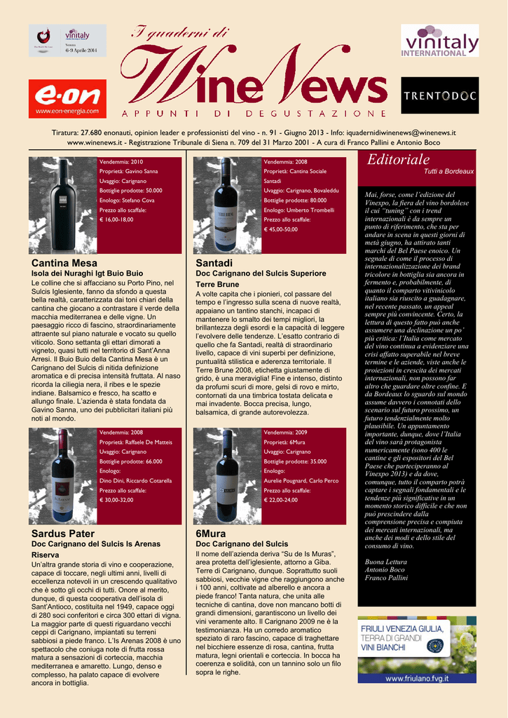 Tiratura: 27.680 enonauti, opinion leader e professionisti del vino - n. 91 - Giugno 2013 - Info: [email protected] www.winenews.it - Registrazione Tribunale di Siena n. 709 del 31 Marzo 2001 - A cura di Franco Pallini e Antonio Boco Vendemmia: 2010 Vendemmia: 2008 Proprietà: Gavino Sanna Proprietà: Cantina Sociale Uvaggio: Carignano Santadi Bottiglie prodotte: 50.000 Uvaggio: Carignano, Bovaleddu Enologo: Stefano Cova Bottiglie prodotte: 80.000 Prezzo allo scaffale: Enologo: Umberto Trombelli € 16,00-18,00 Prezzo allo scaffale: € 45,00-50,00 Cantina Mesa Santadi Isola dei Nuraghi Igt Buio Buio Doc Carignano del Sulcis Superiore Terre Brune Le colline che si affacciano su Porto Pino, nel Sulcis Iglesiente, fanno da sfondo a questa bella realtà, caratterizzata dai toni chiari della cantina che giocano a contrastare il verde della macchia mediterranea e delle vigne. Un paesaggio ricco di fascino, straordinariamente attraente sul piano naturale e vocato su quello viticolo. Sono settanta gli ettari dimorati a vigneto, quasi tutti nel territorio di Sant’Anna Arresi. Il Buio Buio della Cantina Mesa è un Carignano del Sulcis di nitida definizione aromatica e di precisa intensità fruttata. Al naso ricorda la ciliegia nera, il ribes e le spezie indiane. Balsamico e fresco, ha scatto e allungo finale. L’azienda è stata fondata da Gavino Sanna, uno dei pubblicitari italiani più noti al mondo. A volte capita che i pionieri, col passare del tempo e l’ingresso sulla scena di nuove realtà, appaiano un tantino stanchi, incapaci di mantenere lo smalto dei tempi migliori, la brillantezza degli esordi e la capacità di leggere l’evolvere delle tendenze. L’esatto contrario di quello che fa Santadi, realtà di straordinario livello, capace di vini superbi per definizione, puntualità stilistica e aderenza territoriale. Il Terre Brune 2008, etichetta giustamente di grido, è una meraviglia! Fine e intenso, distinto da profumi scuri di more, gelsi di rovo e mirto, contornati da una timbrica tostata delicata e mai invadente. Bocca precisa, lungo, balsamica, di grande autorevolezza. Vendemmia: 2008 Vendemmia: 2009 Proprietà: Raffaele De Matteis Proprietà: 6Mura Uvaggio: Carignano Uvaggio: Carignano Bottiglie prodotte: 66.000 Bottiglie prodotte: 35.000 Enologo: Enologo: Dino Dini, Riccardo Cotarella Aurelie Pougnard, Carlo Perco Prezzo allo scaffale: Prezzo allo scaffale: € 30,00-32,00 € 22,00-24,00 Sardus Pater 6Mura Doc Carignano del Sulcis Is Arenas Riserva Doc Carignano del Sulcis Un’altra grande storia di vino e cooperazione, capace di toccare, negli ultimi anni, livelli di eccellenza notevoli in un crescendo qualitativo che è sotto gli occhi di tutti. Onore al merito, dunque, di questa cooperativa dell’isola di Sant’Antioco, costituita nel 1949, capace oggi di 280 soci conferitori e circa 300 ettari di vigna. La maggior parte di questi riguardano vecchi ceppi di Carignano, impiantati su terreni sabbiosi a piede franco. L’Is Arenas 2008 è uno spettacolo che coniuga note di frutta rossa matura a sensazioni di corteccia, macchia mediterranea e amaretto. Lungo, denso e complesso, ha palato capace di evolvere ancora in bottiglia. Il nome dell’azienda deriva “Su de Is Muras”, area protetta dell’iglesiente, attorno a Giba. Terre di Carignano, dunque. Soprattutto suoli sabbiosi, vecchie vigne che raggiungono anche i 100 anni, coltivate ad alberello e ancora a piede franco! Tanta natura, che unita alle tecniche di cantina, dove non mancano botti di grandi dimensioni, garantiscono un livello dei vini veramente alto. Il Carignano 2009 ne è la testimonianza. Ha un corredo aromatico speziato di raro fascino, capace di traghettare nel bicchiere essenze di rosa, cantina, frutta matura, legni orientali e corteccia. In bocca ha coerenza e solidità, con un tannino solo un filo sopra le righe. Editoriale Tutti a Bordeaux Mai, forse, come l’edizione del Vinexpo, la fiera del vino bordolese il cui “tuning” con i trend internazionali è da sempre un punto di riferimento, che sta per andare in scena in questi giorni di metà giugno, ha attirato tanti marchi del Bel Paese enoico. Un segnale di come il processo di internazionalizzazione dei brand tricolore in bottiglia sia ancora in fermento e, probabilmente, di quanto il comparto vitivinicolo italiano sia riuscito a guadagnare, nel recente passato, un appeal sempre più convincente. Certo, la lettura di questo fatto può anche assumere una declinazione un po’ più critica: l’Italia come mercato del vino continua a evidenziare una crisi affatto superabile nel breve termine e le aziende, viste anche le proiezioni in crescita dei mercati internazionali, non possono far altro che guardare oltre confine. E da Bordeaux lo sguardo sul mondo assume davvero i connotati dello scenario sul futuro prossimo, un futuro tendenzialmente molto plausibile. Un appuntamento importante, dunque, dove l’Italia del vino sarà protagonista numericamente (sono 400 le cantine e gli espositori del Bel Paese che parteciperanno al Vinexpo 2013) e da dove, comunque, tutto il comparto potrà captare i segnali fondamentali e le tendenze più significative in un momento storico difficile e che non può prescindere dalla comprensione precisa e compiuta dei mercati internazionali, ma anche dei modi e dello stile del consumo di vino. Buona Lettura Antonio Boco Franco Pallini la Griffe allo Scaffale Vendemmia: 2004 Vendemmia: 2009 Vendemmia: 2010 Proprietà: Famiglia Boroli Proprietà: Famiglia Garofoli Proprietà: Antinori Uvaggio: Nebbiolo Uvaggio: Verdicchio Uvaggio: Chardonnay, Grechetto Bottiglie prodotte: 1.200 Bottiglie prodotte: 55.000 Bottiglie prodotte: 200.000 Enologo: Lorenzo Alluvione Enologo: Carlo Garofoli Enologo: Renzo Cotarella Prezzo allo scaffale: € Prezzo: € 12,31 Prezzo: € 30,00 50,00-55,00 Bottiglia acquistata nell’enoteca Bulzoni di Bottiglia acquistata nell’enoteca Bulzoni di Roma il 30 di maggio Roma il 30 di maggio Docg Ba