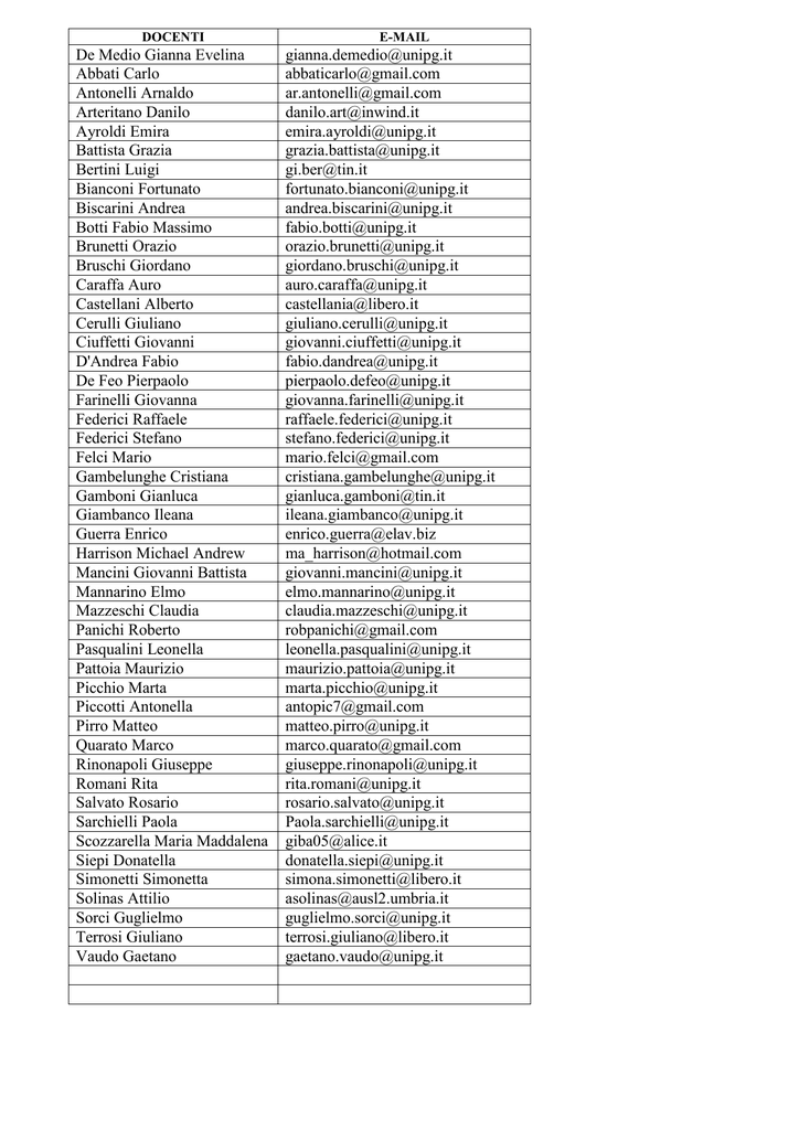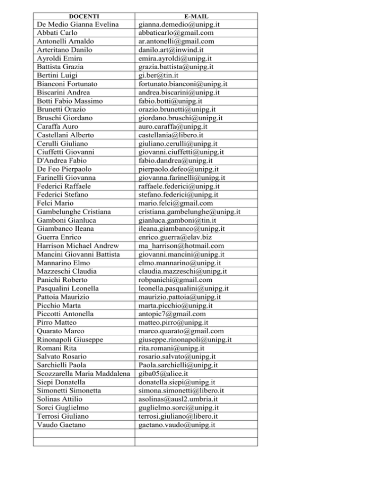 DOCENTI De Medio Gianna Evelina Abbati Carlo Antonelli Arnaldo Arteritano Danilo Ayroldi Emira Battista Grazia Bertini Luigi Bianconi Fortunato Biscarini Andrea Botti Fabio Massimo Brunetti Orazio Bruschi Giordano Caraffa Auro Castellani Alberto Cerulli Giuliano Ciuffetti Giovanni D'Andrea Fabio De Feo Pierpaolo Farinelli Giovanna Federici Raffaele Federici Stefano Felci Mario Gambelunghe Cristiana Gamboni Gianluca Giambanco Ileana Guerra Enrico Harrison Michael Andrew Mancini Giovanni Battista Mannarino Elmo Mazzeschi Claudia Panichi Roberto Pasqualini Leonella Pattoia Maurizio Picchio Marta Piccotti Antonella Pirro Matteo Quarato Marco Rinonapoli Giuseppe Romani Rita Salvato Rosario Sarchielli Paola Scozzarella Maria Maddalena Siepi Donatella Simonetti Simonetta Solinas Attilio Sorci Guglielmo Terrosi Giuliano Vaudo Gaetano E-MAIL [email protected] [email protected] [email protected] [email protected] [email protected] [email protected] [email protected] [email protected] [email protected] [email protected] [email protected] [email protected] [email protected] [email protected] [email protected] [email protected] [email protected] [email protected] [email protected] [email protected] [email protected] [email protected] [email protected] [email protected] [email protected] [email protected] [email protected] [email protected] [email protected] [email protected] [email protected] [email protected] [email protected] [email protected] [email protected] [email protected] [email protected] [email protected] [email protected] [email protected] [email protected] [email protected] [email protected] [email protected] [email protected] [email protected] [email protected] [email protected]