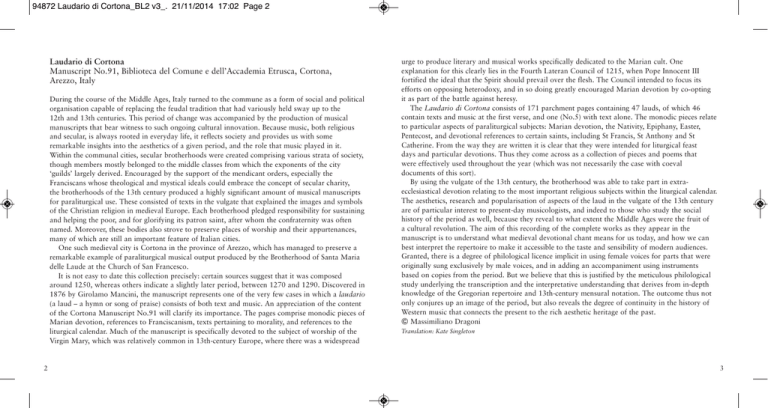 94872 Laudario di Cortona_BL2 v3_. 21/11/2014 17:02 Page 2 Laudario di Cortona Manuscript No.91, Biblioteca del Comune e dell’Accademia Etrusca, Cortona, Arezzo, Italy During the course of the Middle Ages, Italy turned to the commune as a form of social and political organisation capable of replacing the feudal tradition that had variously held sway up to the 12th and 13th centuries. This period of change was accompanied by the production of musical manuscripts that bear witness to such ongoing cultural innovation. Because music, both religious and secular, is always rooted in everyday life, it reflects society and provides us with some remarkable insights into the aesthetics of a given period, and the role that music played in it. Within the communal cities, secular brotherhoods were created comprising various strata of society, though members mostly belonged to the middle classes from which the exponents of the city ‘guilds’ largely derived. Encouraged by the support of the mendicant orders, especially the Franciscans whose theological and mystical ideals could embrace the concept of secular charity, the brotherhoods of the 13th century produced a highly significant amount of musical manuscripts for paraliturgical use. These consisted of texts in the vulgate that explained the images and symbols of the Christian religion in medieval Europe. Each brotherhood pledged responsibility for sustaining and helping the poor, and for glorifying its patron saint, after whom the confraternity was often named. Moreover, these bodies also strove to preserve places of worship and their appurtenances, many of which are still an important feature of Italian cities. One such medieval city is Cortona in the province of Arezzo, which has managed to preserve a remarkable example of paraliturgical musical output produced by the Brotherhood of Santa Maria delle Laude at the Church of San Francesco. It is not easy to date this collection precisely: certain sources suggest that it was composed around 1250, whereas others indicate a slightly later period, between 1270 and 1290. Discovered in 1876 by Girolamo Mancini, the manuscript represents one of the very few cases in which a laudario (a laud – a hymn or song of praise) consists of both text and music. An appreciation of the content of the Cortona Manuscript No.91 will clarify its importance. The pages comprise monodic pieces of Marian devotion, references to Franciscanism, texts pertaining to morality, and references to the liturgical calendar. Much of the manuscript is specifically devoted to the subject of worship of the Virgin Mary, which was relatively common in 13th-century Europe, where there was a widespread 2 urge to produce literary and musical works specifically dedicated to the Marian cult. One explanation for this clearly lies in the Fourth Lateran Council of 1215, when Pope Innocent III fortified the ideal that the Spirit should prevail over the flesh. The Council intended to focus its efforts on opposing heterodoxy, and in so doing greatly encouraged Marian devotion by co-opting it as part of the battle against heresy. The Laudario di Cortona consists of 171 parchment pages containing 47 lauds, of which 46 contain texts and music at the first verse, and one (No.5) with text alone. The monodic pieces relate to particular aspects of paraliturgical subjects: Marian devotion, the Nativity, Epiphany, Easter, Pentecost, and devotional references to certain saints, including St Francis, St Anthony and St Catherine. From the way they are written it is clear that they were intended for liturgical feast days and particular devotions. Thus they come across as a collection of pieces and poems that were effectively used throughout the year (which was not necessarily the case with coeval documents of this sort). By using the vulgate of the 13th century, the brotherhood was able to take part in extraecclesiastical devotion relating to the most important religious subjects within the liturgical calendar. The aesthetics, research and popularisation of aspects of the laud in the vulgate of the 13th century are of particular interest to present-day musicologists, and indeed to those who study the social history of the period as well, because they reveal to what extent the Middle Ages were the fruit of a cultural revolution. The aim of this recording of the complete works as they appear in the manuscript is to understand what medieval devotional chant means for us today, and how we can best interpret the repertoire to make it accessible to the taste and sensibility of modern audiences. Granted, there is a degree of philological licence implicit in using female voices for parts that were originally sung exclusively by male voices, and in adding an accompaniment using instruments based on copies from the period. But we believe that this is justified by the meticulous philological study underlying the transcription and the interpretative understanding that derives from in-depth knowledge of the Gregorian repertoire and 13th-century mensural notation. The outcome thus not only conjures up an image of the period, but also reveals the degree of continuity in the history of Western music that connects the present to the rich aesthetic heritage of the past. 훿 Massimiliano Dragoni Translation: Kate Singleton 3 94872 Laudario di Cortona_BL2 v3_. 21/11/2014 17:02 Page 4 Armoniosoincanto Founded in 1997, Armoniosoincanto is a vocal ensemble usually made up of female voices. Since its inception, the group has striven to perfect a form of vocal purity that recreates how Medieval and Renaissance music would have sounded as accurately as possible. This vocal purity is characterised by the linearity and the distinctive timbre of the singers’ voices, which transmit a precise clarity of sound that recreates the essence of prayer and the word of the ancient holy texts, amplified by the sound of ancient melodies. The singers’ research has led them to explore Carolingian