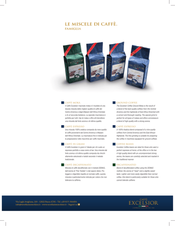 le miscele di caffè. famiglia caffè moka Il Caffè Excelsior macinato moka è il risultato di una dosata miscela delle migliori qualità di caffè del Centro America e degli Altipiani dell’Africa Orientale e di un’accurata tostatura. La speciale macinatura è perfetta per tutti i tipi di moka e offre all’intenditore una miscela dal forte aroma e di ottima qualità. ground coffee The Excelsior Coffee Ground Moka is the result of a blend of the best quality coffees from the Central America and the highlands of East Africa finisched with a correct and thorough roasting. The special grind is perfect for all types of mokas and offers connoisseurs a blend of high quality with a strong aroma. caffè espresso Una miscela 100% arabica composta da nove qualità di caffè provenienti dal Centro America e Altipiani dell’Africa Orientale. La macinatura fine è indicata per la preparazione nelle macchine per caffè macinato. caffè espresso A 100% Arabica blend composed of a nine quality coffees from Central America and the East African Highlands. The fine grinding is suitable for preparing the coffee in machines equipped for ground coffeee. caffè in grani Il Caffè Excelsior in grani è l’ideale per chi vuole un espresso perfetto a casa come al bar. Una miscela dal forte aroma e di ottima qualità composta da chicchi altamente selezionati e tostati secondo il metodo tradizionale. coffee beans Excelsior Coffee beans are ideal for those who want a perfect espresso at home, at the office or in the bar. A high quality blend with an uncompromised strong aroma, the beans are carefully selected and roasted in the traditional manner. caffè decaffeinato Miscela di caffè decaffeinato con il metodo DEMUS, dall’aroma di “Pan Tostato” e dal sapore dolce. Più leggero e digeribile rispetto al normale caffè, questa miscela è particolarmente indicata per coloro che non tollerano la caffeina. decaffeinated Blend of decaffeinated coffee using the DEMUS method, the aroma of “toast” and a slighlty sweet taste. Lighter and more easily digestible than normal coffee, this blend is particularly suitable for those who cannot tolerate caffeine. Via Laghi Avigliana, 210 - 12022 Busca (CN) - Tel. +39 0171 944454 info @ torrefazionexcelsior.it - www.torrefazionexcelsior.it - Seguici su le miscele di caffè. famiglia BOX 6 Kg (6000 g) Tempo ottimale di conservazione 24 mesi Best before end MOKA ESPRESSO GRANI DECAFFEINATO Cod. EAN Art. Nr. pezzi per pack 8019133000179 8019133000100 8019133000049 8019133000223 24 Nr. of pieces per pack Nr. Pack per pallet 90 Nr. of pack per pallet Nr. strati per pallet 10 Nr. of layers per pallet PACCHETTI DA 250 g DIMENSIONI PRODOTTO PRODUCT DIMENSIONS LXPXH DIMENSIONI PACK PACK DIMENSIONS LXPXH DIMENSIONI PALLET PALLET DIMENSIONS LXPXH PESO LORDO PALLET PALLET GROSS WEIGHT MACINATI 16 X 8 X 4,5 cm 39 X 26 X 16 cm 80 X 120 X 180 cm 610 Kg GRANI 21 X 8 X 4,5 cm 39 X 26 X 21 cm 80 X 120 X 230 cm 610 Kg Via Laghi Avigliana, 210 - 12022 Busca (CN) - Tel. +39 0171 944454 info @ torrefazionexcelsior.it - www.torrefazionexcelsior.it - Seguici su
