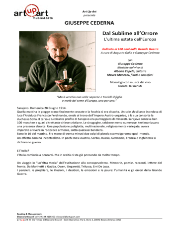 Art Up Art presenta GIUSEPPE CEDERNA Dal Sublime all’Orrore L’ultima estate dell’Europa dedicato ai 100 anni dalla Grande Guerra A cura di Augusto Golin e Giuseppe Cederna con Giuseppe Cederna Musiche dal vivo di Alberto Capelli, chitarre Mauro Manzoni, flauti e sassofoni Monologo con musica dal vivo Durata: 80 minuti “Ma il vecchio non volle saperne e trucidò il figlio e metà del seme d’Europa, uno per uno.” Sarajevo. Domenica 28 Giugno 1914. Quella mattina le piogge erano finalmente cessate e la foschia si era dissolta. Un sole sfavillante inondava di luce l’Arciduca Francesco Ferdinando, erede al trono dell’Impero Austro‐ungarico, e la sua consorte la duchessa Sofia. Il terso e luccicante profilo di Sarajevo era punteggiato di minareti. Sarajevo contava ben 100 moschee e quasi altrettante chiese cristiane. Le sinagoghe, sebbene meno numerose, testimoniavano una presenza ebraica. Una popolazione poliglotta, multinazionale, religiosamente variegata, aveva imparato a vivere in reciproca armonia, sotto qualsiasi bandiera. Sono le 10 del mattino. Fra meno di trenta minuti due colpi di pistola sconvolgeranno quel mondo. Un effetto domino incontrollato. In pochi mesi Austria, Serbia, Russia, Germania, Francia e Inghilterra si dichiarano guerra. E l’Italia? L’Italia comincia a pensarci. Ma in realtà ci sta già pensando da molto tempo. Un viaggio in “un'altra storia” dall’esaltazione alla consapevolezza. Memorie, poesie, racconti, lettere dal fronte. Da Marinetti a Gadda, Owen, Ungaretti, Trilussa, Erri De Luca. I pensieri, le preghiere, le illusioni, i desideri, le emozioni e le paure: l’umanità e gli orrori della Grande Guerra. Booking & Management: Eleonora Biscardi cel +39 334 2169260 [email protected] a r t u p a r t © Up Tempo di Eleonora Biscardi ‐ Sede Operativa: Via G. Borsi 2, 20842 Besana Brianza (Mb) Art Up Art presenta BIOGRAFIE GIUSEPPE CEDERNA. Nato nel 1957 a Roma, di origini valtellinesi, è attore di cinema e teatro. Inizia la sua carriera come attore teatrale e nel 1977 fonda la Compagnia Anfeclown, dove si metterà in luce per una comicità surreale e principalmente fisica. Da allora, Cederna non ha mai abbandonato il teatro e continua a raccontare le sue esperienze e le sue passioni dal viaggio alla montagna, alla poesia e alla letteratura. Negli Anni Ottanta inizia la sua carriera cinematografica partecipando a vari film tra cui La famiglia di E. Scola, Marrakech Express di G. Salvatores, Italia ‐ Germania 4‐3 di Andrea Barzini, Il viaggio di Capitan Fracassa E. Scola ; Mediterraneo di G. Salvatores, Il partigiano Johnny di G. Chiesa, El Alamein di E. Monteleone, Aspettando il sole di A. Panini, Diverso da chi? di U. Carteni, Nine di R. Marshall, Maschi contro femmine e Femmine contro Maschi di F. Brizzi. Nel 2012 interpreta Ardito Desio per la miniserie RAI “K2 – La Montagna degli Italiani”. Attore e viaggiatore, Cederna dalla fine degli anni Novanta si dedica anche alla scrittura: Il grande viaggio, Feltrinelli e Ticino. Le voci del fiume, storie d'acqua e di terra, Excelsior 1881. Nella primavera 2011 è uscito per Feltrinelli “Piano Americano”. AUGUSTO GOLIN Nato a Verona nel 1950, laureato in Scienze Politiche all’Università di Torino. Giornalista pubblicista, da anni si interessa di cultura e cinema di montagna. Ha curato e organizzato numerose mostre tra le quali: “Augusto Materzanini ‐ I giorni della guerra in Adamello “ ‐ “Vittorio Sella ‐ Viaggio nelle Alpi del Tirolo, 1887‐1891‐1893” ‐ “Flavio Faganello ‐ Gli eredi della solitudine, un ritorno 1973‐2003” e “Alpinismo acrobatico ‐ Le Dolomiti e l’invenzione dell’arrampicata”. Ha esperienze alpinistiche extraeuropee in Nepal/Himalaya, Sud e Centro America, Asia Centrale, Siberia e Africa con salite oltre i 6.000 metri, nonché numerose salite sulle Alpi. Dal 1998 è membro del Consiglio Direttivo del Filmfestival della Montagna "Città di Trento" e dal 2004 al 2010 ne è stato il responsabile del programma cinematografico. Ha curato alcune guide escursionistiche, il volume “Erich Abram, un alpinista bolzanino” e nel 2011 è uscito per l’editore Corbaccio il libro “La legge della montagna ‐ I più celebri casi giudiziari che hanno segnato la storia dell’alpinismo ”. Nell’ambito del TrentoFilmfestival ha curato la regia delle serate condotte da Reinhold Messner, Simone Moro, Alessandro Gogna dal 2004 al 2010; coautore dei testi e regia dello spettacolo “Il sacro e la montagna” con Giuseppe Cederna, Mauro Corona e le musiche curate da Renato Morelli. ALBERTO CAPELLI Chitarrista di estrazione jazzistica e compositore, si distingue per la grande preparazione tecnico‐espressiva e per l’attenzione dedicata alle sue produzioni. Affonda la sua ricerca musical‐culturale nel Jazz come nella musica latino‐americana; nell’improvvisazione radicale, (nuova frontiera fra musica contemporanea ed avanguardia Jazzistica), come nella tradizione gitano‐andalusa della musica flamenca. L’apparente disomogeneità della fonte non é casuale anzi, funzionale alla ricerca di modelli espressivi autentici nell’intento di definire e tuttavia discutere la funzione della musica d’arte nel nostro tempo. MAURO MANZONI Sassofonista e flautista bolognese, esordisce professionalmente sulla scena jazzistica nazionale nei primi anni 90. Numerose sono le sue collaborazioni con artisti, in particolare Alfredo Impulliti, festival ed etichette discografiche nazionale. Da alcuni anni si dedica anche alla composizione di musiche per teatro e arte visiva in genere. Booking & Management: Eleonora Biscardi cel +39 334 2169260 [email protected] a r t u p a r t © Up Tempo di Eleonora Biscardi ‐ Sede Operativa: Via G. Borsi 2, 20842 Besana Brianza (Mb)