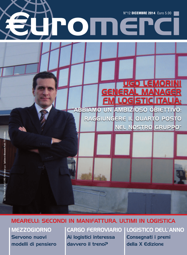 N°12 DICEMBRE 2014 Euro 5.00 UGO LEMORINI GENERAL MANAGER FM LOGISTIC ITALIA: “ABBIAMO UN AMBIZIOSO OBIETTIVO: RAGGIUNGERE IL QUARTO POSTO Aut. Trib. Roma n° 487 del 6.11.1993 - Poste Italiane s.p.a. - Spedizione in Abbonamento Postale -70% -DCB Milano NEL NOSTRO GRUPPO” MEARELLI: SECONDI IN MANIFATTURA, ULTIMI IN LOGISTICA MEZZOGIORNO CARGO FERROVIARIO LOGISTICO DELL’ ANNO Servono nuovi modelli di pensiero Ai logistici interessa davvero il treno? Consegnati i premi della X Edizione l Inspired by you. Built by Mitsubishi. qquando è tutto... Guidate oggi il futuro I nostri nuovi ca arrelli elevatori elettrici carrelli EDiA EX X da 2.5 a 3.5 tonnellate ne sono la recente. prova più recente e. I nostri ingegneri hhanno trascorso più di 2 anni studiando atti tività di ogni tipologia e attività dimensione in giro per il mondo. Il risultato? Carrelli eelevatori che vi offrono tutto ciò che ddesiderate… e anche di più… Più ù potenti... più efficienti ffi i ti di qualsiasi l i i rivale i le e più I carr carrelli rrelli EDiA EX X offrono la migliore esperienza nza di guida... sono e son no anche i più produttivi. Soltanto Soltan nto EDiA EX X vi offre prestazioni eccezionali, ali, stabilità impareggiabile impare eggiabile e la reale possibilità di lavoraree sia al chiuso che all’aperto, anche nel bagnato. SET SPEED Mitsubishi è rinomata per il design iinnovativo, ti la l ttecnologia l i e la l qualità lità senza compromessi. FFAST AST ZONEE SLOW ZONE SENSOR SEN NSOR READING Sensitive Drive System (SDS) SDS S Apprezzato dai conduttori per la ‘sensazione’ intuitiva che sperimentano, erimentano, udente e l’SDS rileva see il carrello viene guidato in modo assertivo o prudente nseguenza le prestazioni modulate e progressive più fornisce di conseguenza uttività. adatte al caso specifico. Vuole dire maggiore sicurezza e produttività. SENSITIVE DRIVE SY STEM SYSTEM m Per maggiori informazioni: www.edia-mitsubishi.com ww ww.edia-mitsubishi.com com www.mitsubishicarrelli.it www.mits subishicarrelli.it | | L’AUTOTRASPORTO nel calderone della Legge di Stabilità L’AUTOTRASPORTO È FINITO NELLA “LEGGE DI STABILITÀ”, APPROVATA IL 29 DICEMBRE. A PARTE LA VALUTAZIONE CHE SI PUÒ DARE DEL FATTO CHE UN SETTORE COSÌ DETERMINANTE PER IL NOSTRO SISTEMA LOGISTICO VENGA “INFILATO” DAL GOVERNO IN UNA LEGGE, LA NUOVA VERSIONE DELLA TRADIZIONALE “FINANZIARIA”, CHE AFFRONTA OGNI TIPO DI PROBLEMATICA, RESTANO MOLTI INTERROGATIVI. INFATTI, VENGONO ABOLITI I COSTI MINIMI (E CI MANCAVA ALTRO…) E SI RICONOSCE (COME AVVIENE IN TUTTA EUROPA) LA LIBERA CONTRATTAZIONE DEI PREZZI E DELLE CONDIZIONI DI TRASPORTO, MA SI CONFERMA UN BEN NON DEFINITO INTERVENTO DELLA PUBBLICA AMMINISTRAZIONE CHE EMANERÀ (E QUESTO NON SUCCEDE DA NESSUNA PARTE) “VALORI INDICATIVI DI RIFERIMENTO DEI COSTI DI ESERCIZIO DELL’IMPRESA DI AUTOTRASPORTO”. SEMBRA QUASI CHE IL GOVERNO CONSIDERI GLI AUTOTRASPORTATORI ADDIRITTURA NON IN GRADO DI FARSI I PROPRI CONTI. OLTRETUTTO L’AUTORITÀ ANTITRUST CONSENTE CHE VENGANO “INDICATI” VALORI DI RIFERIMENTO SOLO NEI CASI DI MERCATI RISTRETTI, COME IN QUELLO DELLA DISTRIBUZIONE DEI CARBURANTI. CI SONO ALTRE NOVITÀ RILEVANTI TRA LE QUALI LA LIMITAZIONE DELLA SUB-VEZIONE, RISTRETTA A UN SOLO PASSAGGIO, E LA SOPPRESSIONE, FINALMENTE, DELLA “SCHEDA DI TRASPORTO”, QUEST’ULTIMA PERÒ CON ALCUNI DISTINGUO. INOLTRE, È STATA INTRODOTTA A CARICO DEI COMMITTENTI LA “RESPONSABILITÀ SOLIDALE” RETRIBUTIVA, CONTRIBUTIVA E IN ALCUNI CASI ANCHE FISCALE E PER ESSERE ESONERATI OCCORRE CHE I COMMITTENTI VERIFICHINO CHE IL TRASPORTATORE ABBIA IL “DOCUMENTO UNICO DI REGOLARITÀ CONTRIBUTIVA”, IL DURC, RILASCIATO ENTRO I TRE MESI PRECEDENTI ALLA DATA DEL TRASPORTO. IN QUESTO BREVE SPAZIO, OVVIAMENTE, NON È POSSIBILE AFFRONTARE IL TEMA IN TUTTA LA SUA COMPLESSITÀ. EUROMERCI, COSÌ COME STA FACENDO ASSOLOGISTICA, APPROFONDIRÀ LE NUOVE DISPOSIZIONI. RESTA IL PROBLEMA CHE ABBIAMO SEGNALATO ALL’INIZIO, OSSIA QUELLO CHE SI CONTINUA AD AFFRONTARE LE TEMATICHE DELLA LOGISTICA, NONOSTANTE IL MINISTRO LUPI CONTINUI A PARLARE DELL’ESIGENZA DI UNA “REGIA” PER IL SETTORE, IN MANIERA “SEGMENTATA”, COMPARTO PER COMPARTO. ADESSO TOCCHERÀ, ALMENO COSÌ SI DICE, PERÒ DA OLTRE UN DECENNIO, ALLA RIFORMA DELLA PORTUALITÀ. UN METODO SBAGLIATO, CHE LASCEREBBE QUASI INTENDERE CHE NON SI VOGLIA AFFRONTARE IL SISTEMA LOGISTICO NEL SUO COMPLESSO. SI TEME DI LEDERE QUALCHE INTERESSE? DICEMBRE 1 DICEMBRE VI SEGNALIAMO Editore SERDOCKS S.r.l. Via Cornalia 19 - 20124 Milano tel. 02.669.1567 fax 02.667.142.45 [email protected] Redazione Milano Via Cornalia 19 - 20124 Milano tel. 02.669.1567 - fax 02.667.142.45 internet: www.euromerci.it e-mail: [email protected] Redazione Roma Via Panama 62 - 00198 Roma tel. 06.841.2897 - fax 06.884.4824 Internet: www.euromerci.it e-mail: [email protected] Direttore responsabile Jean Francois Daher Mezzogiorno| SERVONO NUOVI MODELLI DI PENSIERO Cover| FM LOGISTIC ITALIA, FATTURATO IN CRESCITA Intervista a Carlo Mearelli| SECONDI IN MANIFATTURA ULTIMI IN LOGISTICA Attualità| OUTSOURCING, LA VIA PER CREARE VALORE Il premio Il Logistico dell’Anno| NEL SEGNO DELLA SOSTENIBILITÀ Inchiesta sul cargo ferroviario 2| Sito www.euromerci.it a cura di Ornella Giola e-mail: [email protected] cell.331.674.6826 C’È UN VERO INTERESSE DEI LOGISTICI SUL TRENO? Stampa Mediaprint Milano LOGISTICA UNO: TRE FATTORI DI SUCCESSO Primo Piano| Pubblicità Mariarosa Mazzoleni cell.335.532.7936 [email protected] Primo Piano| IMMOBILIARE LOGISTICO: UNA FASE DI “RISVEGLIO” IL BAROMETRO DELL’ECONOMIA NEWS DALLE AZIENDE L’Osservatorio Contract Logistics del Politecnico di Milano, in collaborazione con Assologistica, ha presentato i risultati della ricerca 2014 sull’outsourcing. Sempre più aziende stanno facendo ricorso alla terziarizzazione (il servizio a pag. 35) 2 8 21 32 35 39 48 53 55 4 10 18 Prosegue la nostra inchiesta sul cargo ferroviario e s