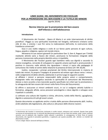 LINEE GUIDA DEL MOVIMENTO DEI FOCOLARI PER LA PROMOZIONE DEL BEN-ESSERE E LA TUTELA DEI MINORI (aprile 2014) Norme interne per la promozione del ben-essere dell’infanzia e dell’adolescenza Introduzione Il Movimento dei Focolari - Opera di Maria è un ente internazionale di diritto pontificio1. Poggia su una spiritualità incentrata nel Vangelo, nell'amore cristiano come stile di vita, e orienta i suoi fini verso la realizzazione dell'unità, la costruzione della fratellanza universale2. Esso è una realtà religiosa e civile di cui fanno parte persone di ogni cultura, lingua, popolo e religione, sparse nel mondo intero. Attraverso le sue sezioni giovanili (in particolare Gen 3, Gen 4, Ragazzi per l’Unità) mediante attività varie a favore dei minori, promuove la formazione integrale della persona riconosciuta nella propria identità unica e irripetibile. Il Movimento dei Focolari guarda ogni bambino nella sua dignità e secondo la visione evangelica, cercando di sviluppare le capacità umano-spirituali e promuovendo il positivo in ciascuno; nelle attività che riguardano i minori si ispira alla pedagogia di comunione che mette al centro della relazione la presenza di Gesù (cfr. Mt 18,20). Inoltre, recependo i principi proclamati dal Diritto Internazionale in materia di tutela dei minori, fa proprio l’impegno di prevenire ed evitare ogni abuso verso i minori, nello svolgimento di dette attività, adottando in primo luogo le seguenti cautele: a) affidare i minori a persone responsabili delle proprie azioni e comportamenti, impegnate nella vita evangelica secondo la spiritualità di comunione del Movimento, idonee a stare accanto a loro (secondo quanto specificato nei criteri per la promozione e la salvaguarda del ben-essere del minori nella Parte Prima del Documento). b) offrire e assicurare ai minori ambienti sicuri, in cui si svolgono attività ludiche e formative, adeguate all’età, senza pressioni psicologiche e dove dignità e sviluppo sono rispettati e custoditi; c) coltivare una cultura del rispetto e stima, altruismo, tutela della libertà, uguaglianza, dignità e autonomia di tutti gli esseri umani. Questo documento va applicato anche a tutela delle persone diversamente abili. Inoltre, andrà adattato alla legislazione, alla cultura e alla prassi delle diverse nazioni. 1 Il Movimento dei Focolari è riconosciuto civilmente in molte nazioni, attraverso enti nazionali. Queste linee guida serviranno di orientamento per le comunità del Movimento presenti nei vari Paesi del mondo, onde i Centri nazionali avranno cura di adattarle alle rispettive realtà culturali e giuridiche. In conseguenza, la Parte Terza di questo Documento, che riguarda le procedure giuridiche, si applicano, per quanto possibile, alle attività e ai membri del Movimento in Italia. 2 Cf art. 6 degli Statuti Generali dell’Opera di Maria. 1 PARTE PRIMA Criteri per la promozione e salvaguardia del ben-essere del minore Premesso che l’interesse primario del Movimento dei Focolari è la promozione e la tutela del ben-essere globale del minore, con questo documento si intende delineare sinteticamente una prassi già in uso e che sempre più vuole animare le attività del Movimento con i minori. Infatti, il Movimento dei Focolari ha già elaborato in alcune nazioni delle linee guida, in adempimento a quanto previsto dalle leggi locali e/o a quanto proposto dalle rispettive Conferenze episcopali, che vincolano gli appartenenti al Movimento in quelle nazioni. Alle persone adulte appartenenti al Movimento, scelte per svolgere attività con i minori si richiede che abbiano frequentato un adeguato corso preparatorio della durata di almeno sei ore3, in cui si approfondirà l'argomento della tutela dei minori dal punto di vista delle linee direttrici delle autorità ecclesiastiche e da quello giuridico, psicologico, familiare e abbiano sottoscritto una dichiarazione in cui affermano di conoscere e di voler applicare le relative norme di condotta nei confronti di minori. Inoltre dovranno dichiarare sotto la propria responsabilità di non aver subito condanne per delitti contro la moralità pubblica ed il buon costume, la morale familiare e la libertà morale. Le persone che svolgono attività con i minori devono essere scelte dal/dalla delegato/a di zona4 sentito il parere del/della responsabile del focolare o della/dell’ incaricato del territorio5 dove si trova il minore. Esse avranno cura di stabilire un rapporto e di coinvolgere per quanto possibile la famiglia del minore. Le attività che coinvolgono i minori vanno preparate con ragionevole anticipo e vanno fatte conoscere nei focolari e alle comunità del Movimento del territorio relativo (con le modalità e i mezzi possibili e opportuni), presentando un programma di massima e gli argomenti che verranno trattati, su cui informare i genitori. Per la sicurezza e per la comprovata efficacia del lavoro di gruppo nelle attività rivolte ai minori, sarà necessario che siano presenti almeno due adulti. Quando il gruppo supera il numero di otto minori, si aumenterà progressivamente la presenza di adulti (a seconda delle caratteristiche del gruppo e delle attività che si svolgono), nella proporzione, possibilmente, di un adulto ogni otto minori. Nessun adulto resterà da solo con i minori, possibilmente neppure per accompagnarli in auto. Per quanto possibile, si chiederà ai genitori di provvedere al trasporto dei propri figli; in caso di impossibilità si chiederà loro una apposita autorizzazione, sia pure informale. I colloqui con i minori vanno svolti in luoghi aperti e accessibili. 3 In un quadro di formazione permanente, ove sono previsti successivi corsi di aggiornamento biennale. La formazione permanente è prevista anche per Il/la responsabile del focolare e gli incaricati dei territori. 4 Per ‘zona’ si intende la realtà dell’Opera di Maria o Movimento dei Focolari presente in un determinato territorio (cfr. art. 115 degli Statuti generali) 5 Per 