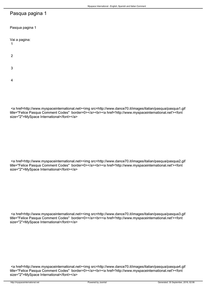 Myspace International - English, Spanish and Italian Comment Pasqua pagina 1 Pasqua pagina 1 Vai a pagina: 1 2 3 4 <a href=http://www.myspaceinternational.net><img src=http://www.dance70.it/images/italian/pasqua/pasqua1.gif title="Felice Pasqua Comment Codes" border=0></a><br><a href='http://www.myspaceinternational.net'><font size="2">MySpace International</font></a> <a href=http://www.myspaceinternational.net><img src=http://www.dance70.it/images/italian/pasqua/pasqua2.gif title="Felice Pasqua Comment Codes" border=0></a><br><a href='http://www.myspaceinternational.net'><font size="2">MySpace International</font></a> <a href=http://www.myspaceinternational.net><img src=http://www.dance70.it/images/italian/pasqua/pasqua3.gif title="Felice Pasqua Comment Codes" border=0></a><br><a href='http://www.myspaceinternational.net'><font size="2">MySpace International</font></a> <a href=http://www.myspaceinternational.net><img src=http://www.dance70.it/images/italian/pasqua/pasqua4.gif title="Felice Pasqua Comment Codes" border=0></a><br><a href='http://www.myspaceinternational.net'><font size="2">MySpace International</font></a> http://myspaceinternational.net Powered by Joomla! Generated: 30 September, 2016, 02:06 Myspace International - English, Spanish and Italian Comment <a href=http://www.myspaceinternational.net><img src=http://www.dance70.it/images/italian/pasqua/pasqua5.jpg title="Felice Pasqua Comment Codes" border=0></a><br><a href='http://www.myspaceinternational.net'><font size="2">MySpace International</font></a> <a href=http://www.myspaceinternational.net><img src=http://www.dance70.it/images/english/easter/easter83.gif title="Disney Felice Pasqua Comment Codes" border=0></a><br><a href='http://www.myspaceinternational.net'><font size="2">MySpace International</font></a> <a href=http://www.myspaceinternational.net><img src=http://www.dance70.it/images/english/easter/easter82.gif title="Disney Felice Pasqua Comment Codes" border=0></a><br><a href='http://www.myspaceinternational.net'><font size="2">MySpace International</font></a> <a href=http://www.myspaceinternational.net><img src=http://www.dance70.it/images/english/easter/easter81.jpg title="Disney Felice Pasqua Comment Codes" border=0></a><br><a href='http://www.myspaceinternational.net'><font size="2">MySpace International</font></a> http://myspaceinternational.net Powered by Joomla! Generated: 30 September, 2016, 02:06 Myspace International - English, Spanish and Italian Comment <a href=http://www.myspaceinternational.net><img src=http://www.dance70.it/images/italian/pasqua/pasqua80.jpg title="Felice Pasqua Comment Codes" border=0></a><br><a href='http://www.myspaceinternational.net'><font size="2">MySpace International</font></a> <a href=http://www.myspaceinternational.net><img src=http://www.dance70.it/images/italian/pasqua/pasqua79.jpg title="Disney Felice Pasqua Comment Codes" border=0></a><br><a href='http://www.myspaceinternational.net'><font size="2">MySpace International</font></a> Vai a pagina: 1 2 3 4 http://myspaceinternational.net Powered by Joomla! Generated: 30 September, 2016, 02:06