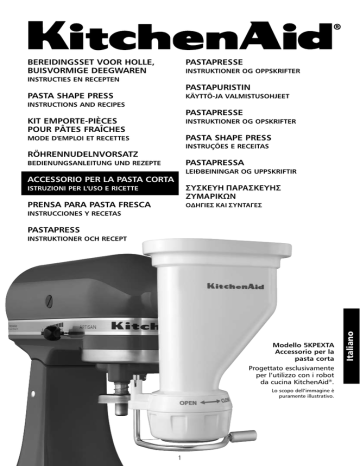 BEREIDINGSSET VOOR HOLLE, BUISVORMIGE DEEGWAREN PASTAPRESSE INSTRUKTIONER OG OPPSKRIFTER INSTRUCTIES EN RECEPTEN PASTAPURISTIN PASTA SHAPE PRESS KÄYTTÖ-JA VALMISTUSOHJEET Instructions and Recipes PASTAPRESSE KIT EMPORTE-PIÈCES POUR PÂTES FRAÎCHES Instruktioner og opskrifter Pasta Shape Press MODE D'EMPLOI ET RECETTES INSTRUÇÕES E RECEITAS RÖHRENNUDELNVORSATZ Pastapressa BEDIENUNGSANLEITUNG UND REZEPTE LEIÐBEININGAR OG UPPSKRIFTIR ACCESSORIO PER LA PASTA CORTA ΣΥΣΚΕΥΗ ΠΑΡΑΣΚΕΥΗΣ ΖΥΜΑΡΙΚΩΝ ISTRUZIONI PER L'USO E RICETTE PRENSA PARA PASTA FRESCA Οδηγίες και Συνταγές Instrucciones y recetas PASTAPRESS Modello 5KPEXTA Accessorio per la pasta corta Progettato esclusivamente per l’utilizzo con i robot da cucina KitchenAid®. Lo scopo dell’immagine è puramente illustrativo. 1 Italiano Instruktioner och recept Indice Introduzione Sicurezza dell’accessorio del robot da cucina.................................................................................... 3 Precauzioni Importanti...................................................................................................................... 3 Funzionalità e funzionamento Montaggio dell’accessorio per la pasta corta.................................................................................... 4 Trafile per la pasta corta.................................................................................................................... 6 Collegamento dell’ accessorio per la pasta corta............................................................................... 7 Utilizzare l’accessorio per la pasta corta............................................................................................ 7 Cambiare le trafile per pasta corta............................................................................................ 8 Per allentare la ghiera ferma trafila........................................................................................... 8 Manutenzione e pulizia.................................................................................................................... 9 Consigli per preparare la pasta........................................................................................................ 10 Cuocere la pasta............................................................................................................................. 11 Ricette Tagliatelle all’uovo........................................................................................................................... 11 Maccheroni con scampi e zucchine................................................................................................. 12 Penne all’arrabbiata........................................................................................................................ 12 Pasta con aglio, olio e peperoncino................................................................................................ 13 Rigatoni al tonno............................................................................................................................ 13 Informazioni relative a garanzia e assistenza Garanzia degli accessori del robot da cucina per uso domestico KitchenAid®.................................. 14 Assistenza post-vendita................................................................................................................... 14 Servizio clienti................................................................................................................................. 15 Italiano 2 Sicurezza dell’accessorio del robot da cucina La sicurezza propia e altrui è estremamente importante. In questo manuale e sull’apparecchiatura sono riportati molti importanti messaggi di sicurezza. Leggere e osservare sempre tutti i messaggi relativi alla sicurezza. Questo è il simbolo dell’allarme sicurezza. Questo simbolo segnala potenziali pericoli per l’incolumità propria e altrui. Tutte le norme di sicurezza sono riportate dopo il simbolo di avvertenza o dopo il termine “PERICOLO” o “AVVERTENZA”. Questi termini indicano quanto segue. PERICOLO AVVERTENZA La mancata osservanza immediata delle istruzioni riportate comporta il rischio di lesioni gravi o fatali. La mancata osservanza delle istruzioni riportate comporta il rischio di lesioni gravi o fatali. Tutte le norme di sicurezza indicano il potenziale rischio, come ridurre la possibilità di lesioni e le conseguenze del mancato rispetto delle istruzioni riportate. Quando si utilizzano elettrodomestici, adottare sempre le misure di sicurezza di base, incluse le seguenti precauzioni: 7.Non inserire mai l’impasto con le mani. Per spingere il cibo utilizzare l’utensile combinato. 1.Leggere tutte le istruzioni. 8.Non utilizzare il robot da cucina se il cavo o la spina sono danneggiati, dopo eventuali anomalie di funzionamento o se l’apparecchio è caduto o se è stato in qualche modo danneggiato. Consegnare il robot da cucina al centro assistenza autorizzato più vicino perché i componenti elettrici e/o meccanici siano sottoposti a revisione, riparazione o regolazione. 2.Al fine di evitare il rischio di scosse elettriche, non immergere il robot da cucina in acqua né in altri liquidi. 3. Questo apparecchio non è indicato per l’uso da parte di persone (inclusi i bambini) con capacità fisiche, mentali o sensoriali ridotte, con mancanza di esperienza e di conoscenza, senza la supervisione o le istruzioni da parte di una persona responsabile per la loro sicurezza. 9.L’uso di accessori non consigliati o venduti da KitchenAid può essere causa di incendi, scosse elettriche o lesioni. 4. I bambini vanno sempre supervisionati per accertarsi che non giochino con l’apparecchio. 10.Non utilizzare il robot da cucina all’aperto. 11.Non lasciare il cavo sospeso sul bordo del tavolo o del piano di lavoro. 5. Scollegare l’apparecchio dalla presa di rete quando non lo si utiliz