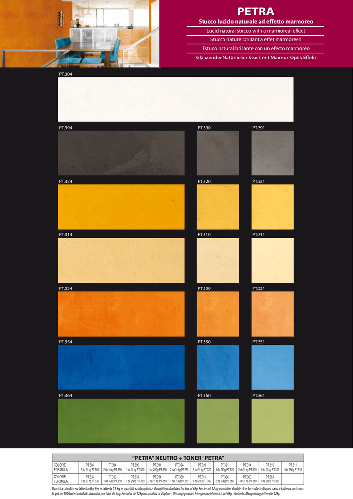 PETRA Stucco lucido naturale ad effetto marmoreo Lucid natural stucco with a marmoreal effect Stucco naturel brillant à effet marmoréen Estuco natural brillante con un efecto marmóreo Glänzender Natürlicher Stuck mit Marmor-Optik Effekt PT.304 PT.394 PT.390 PT.391 PT.324 PT.320 PT.321 PT.314 PT.310 PT.311 PT.334 PT.330 PT.331 PT.354 PT.350 PT.351 PT.364 PT.360 PT.361 “PETRA” NEUTRO + TONER “PETRA” COLORE FORMULA PT.304 2 da ½ kg PT.300 PT.394 2 da ½ kg PT.390 PT.390 PT.391 PT.324 1 da ½ kg PT.390 1 da 250g PT.390 2 da ½ kg PT.320 PT.320 1 da ½ kg PT.320 PT.321 1 da 250g PT.320 PT.314 2 da ½ kg PT.310 PT.310 1 da ½ kg PT.310 COLORE FORMULA PT.334 2 da ½ kg PT.330 PT.330 1 da ½ kg PT.330 PT.331 PT.354 PT.350 1 da 250g PT.330 2 da ½ kg PT.350 1 da ½ kg PT.350 PT.351 1 da 250g PT.350 PT.364 2 da ½ kg PT.360 PT.360 1 da ½ kg PT.360 PT.361 1 da 250g PT.360 PT.311 1 da 250g PT.310 Quantità calcolate su latte da 6kg. Per le latte da 12 kg le quantità raddoppiano. • Quantities calculated for tins of 6kg. For tins of 12 kg quantities double. • Les formules indiques dans le tableau sont pour le pot de 4000ml • Cantidad calculadas por latas de 6kg. Por latas de 12kg la cantidad se dúplica.• Die angegebenen Mengen beziehen sich auf 6kg - Gebinde. Mengen doppelten für 12kg.