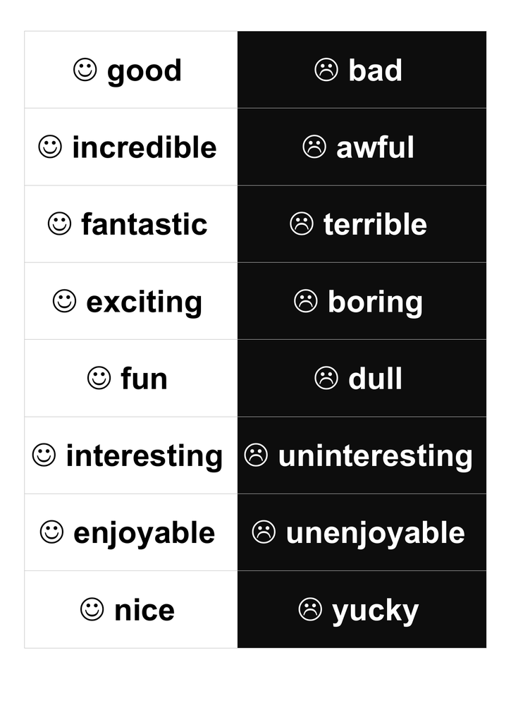 good bad incredible awful fantastic terrible exciting boring fun dull interesting uninteresting enjoyable unenjoyable nice yucky lovely horrible pleasant annoying cool silly great stupid clear confusing simple complicated easy hard relaxing tense different ordinary normal strange right wrong suitable unsuitable fast slow open closed smart stupid big small varied repetitive powerful pathetic lively tired average developing exploring inventing trying (out) using testing finishing changing leaving searching for working together finding deciding understanding agreeing learning (to) participating in solving helping succeeding praising failing criticising continuing judging explaining discussing designing bello brutto incredibile bruttissimo fantastico terribile emozionante noioso divertente non divertente interessante non interessante piacevole spiacevole carino repellente simpatico antipatico dolce fastidioso fiero sciocco forte stupido chiaro confuso semplice complicato facile difficile rilassante stressante diverso monotono normale strano giusto sbagliato adatto inadatto veloce lento aperto chiuso furbo stupido grande piccolo variato ripetitivo fortissimo patetico vivace spento normale sviluppare esplorare inventare provare usare sperimentare finire cambiare lasciare cercare collaborare trovare decidere capire mettersi d’accordo imparare partecipare risolvere aiutare riuscire complimentare fallire criticare continuare controllare spiegare discutere progettare