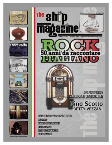 TheShipMagazine 1 SOMMARIO SOMMARIO EDITORIALE 3. UGOLINO la nascita del rock italiano Il primo numero cartaceo della rivista musicale The Ship Magazine ha come scopo quello nei pensieri di un artista “scomodo”. di rivivere tutte le emozioni che nel passare 4. ENRICO MARIA PAPES lo storico degli anni la storia della musica rock italiabatterista ci dona una testimonianza na ci ha regalato, rivivendo quelle che sono state le influenze e i movimenti musicali che dell’era beat.... hanno permesso al rock nostrano di segnare 6. ETTORE VIGO 50 anni di rock italia- l’intero panorama musicale. Questo percorso vedrà la luce attraverso le parole ed i pensieri no visti dal tastierista dei Delirium. degli artisti che sono stati i veri protagonisti 7. ALDO TAGLIAPIETRA esplora le ra- di questi ultimi 50 anni di rock, segnando prodici del rock, aspettando l’uscita del fondamente diverse generazioni, attraverso la loro musica ed i loro testi, e influenzando i cofanetto live delle Orme. pensieri, le speranze e le illusioni di migliaia 8. DIEGO GALERI il rock degli anni ‘90 di ragazzi. Forse per la prima volta su carta è segnato da una band di nome Timo- stampata, un vero e proprio esperimento in ria. cui non vi saranno articoli di giornalisti e criti- ci, ma solo dei racconti in prima persona scrit- 9. PINO SCOTTO ci regala le sue opi- ti ciascuno con il proprio personale stile, da nioni sul rock italiano. parte di chi quegli anni li ha vissuti in pieno; testimonianze di chi ha saputo portare il rock 11. BETTY VEZZANI la cantante dei italiano in pasto ad un pubblico più ampio, Modena City Ramblers si racconta ai personaggi che noi dovremmo solo ringrazianostri lettori. re per tutte le emozioni che ci hanno regalato. Direttore Jacopo Aloisi Condirettore Antonio Leoncini Redazione Maurizio Di Battista Gianni Di Sante Armando Di Sabatino Sito Internet www.theshipmagazine.com E-mail [email protected] Impaginazione e Grafica >Sara Odoardi [email protected] >Graphic In Progress graphic_in [email protected] Stampa Tipografia Rosetana Editore Associazione Eidos 2 TheShipMagazine Con la speranza di aver fatto un buon lavoro, li ringraziamo per la splendida collaborazione e vi lasciamo con la promessa di migliorare ed ampliare questa nuova proposta, rendendola sempre più interessante e ricca di contenuti. Jacopo Aloisi e Antonio Leoncini. GLI ANNI DEL ROCK di Guido Lamberti (Ugolino) Il cielo di Roma è più basso di quello di Genova. Riflettevo guardando una nuvola rossa specchiarsi al tramonto. “Stai attento al pallone!” – Era Lucio un po’ urtato con me. Gianni segnava una rete e la squadra non nostra vinceva. La sede della R.C.A. sembrava qualcosa un po’ simile a un lager. Non brutta, anzi, con palazzine pulite e giardini curati, ma il concetto era uguale; con guardiani alle porte, tesserini firmati ai cancelli o una mensa per tutti. Di un ragazzo appena arrivato da Genova era stata la prima impressione. Infatti sembrava il piazzale che l’ora d’aria si giocava al pallone. Gli echi del rock però si sentivano in ogni viale filtrate dai muri: la musica sopra le voci riempiva i pensieri. Ma io com’ero finito lì dentro? Uno dei capi, Roberto Davini, mi aveva chiamato che io al lavoro servivo al bancone. Dovevo firmare un contratto di almeno tre anni più due. “Domani l’aereo e le spese sono tutte pagate. Il disco” – diceva – “a tutti è piaciuto”. Mi sembravo volato nel sogno e la sera a incidere un coro, coinvolto da Lucio (Dalla) e da Gianni (Morandi) per la nuova colonna sonora di Ennio Morricone o forse era un altro. Che anni di folle euforia la fine degli anni sessanta! Sembrava più facile un sogno che dipingere in terra una biglia. A Milano incidevo con Detto Mariano. Suonavano “I Quelli” che poi sarebbero stati la P.F.M. (Mussida, Di Cioccio, con gli altri) non li vedo da anni, però quanto affetto conservo per loro! Ricordo che mentre cantavo era entrato Maurizio Vandelli e Mariano rideva, rideva a vedergli la faccia e diceva di me che ero un Alieno, e Vandelli mi chiese umilmente se poteva suonare per me in un brano. Non l’ho mai ringraziato, lo faccio quarant’anni in ritardo. Galleria del Corso a Milano era viva come un mercato. Si esponevano idee. E pas- sava Battisti, Teocoli, Adriano col Clan, Al Bano e Romina, la Formula Tre, Cuore Matto, e Azzurro, Rose Rosse per te, la Caselli e poi Mina, e Sorrisi e Canzoni, e Mogol. Ho assistito al primo provino di Ron che tremava i suoi quindici anni, ho visto arrivare gli occhiali di Claudio Baglioni e cantare in modo divino, ho saputo del lancio di Nada ancor prima di lei e Arbore e Boncompagni sono saliti sul palco a darmi la mano. I 45 giri giravano di festa in festa, gli L.P. cominciavano a fare raccolta. I ragazzi cercavano nel Rock un nuovo respiro o ogni nota inventava un suo gesto. Nel mio Cantagiro la folla impazzita aspettava chilometri e ore l’arrivo di Mal e l’urlo la sera arrivava a salutare anche le stelle. In tutto quel ribollire io cercavo un mondo da rifare e le regole del successo inseguivano me per adularmi e poi, magari, cambiarmi. Ma amo pensare che anche la mia resistenza è stata in quegli anni un magnifico brano di rock. » AUTOMOTIVE INTERIOR SYSTEMS Zona Industriale S. Nicolò a Tordino - 64100 TERAMO - Italy Tel. 39 0861 2070 - Fax 39 0861 2070 424 [email protected] www.industrialesud.com R Pizzeria Forno a legna - Ristorante Lungomare Trieste - tel. 085 8930371 Roseto degli Abruzzi TheShipMagazine 3 Tema: origini del rock italiano di Enrico Maria Papes Cari amici, iniziamo col dire che la mia av ve n t u ra come batterista non inizia con il Rock e tanto meno con il Beat ma bensì con il Rock’n’roll di fine anni ’50. I nostri idoli? Fats Domino, Bill Haley, Chuck Berry, Bo Diddley, Little Ricard, Jerry Lee Lewis, Gene Vincent, Eddie Cochran, Elvis Presley e tanti altri pazzi scatenati! Poi arrivarono i “Complessi” e tra quelli che più ci influenzarono ci furono “T