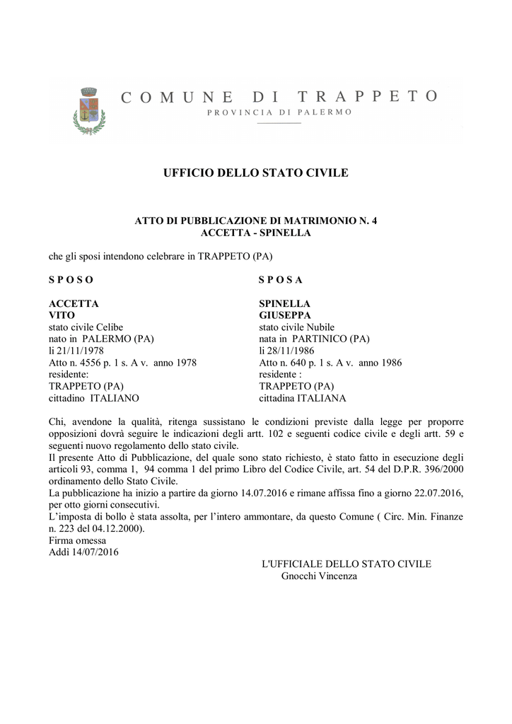 UFFICIO DELLO STATO CIVILE ATTO DI PUBBLICAZIONE DI MATRIMONIO N. 4 ACCETTA - SPINELLA che gli sposi intendono celebrare in TRAPPETO (PA) SPOSO SPOSA ACCETTA VITO stato civile Celibe nato in PALERMO (PA) li 21/11/1978 Atto n. 4556 p. 1 s. A v. anno 1978 residente: TRAPPETO (PA) cittadino ITALIANO SPINELLA GIUSEPPA stato civile Nubile nata in PARTINICO (PA) li 28/11/1986 Atto n. 640 p. 1 s. A v. anno 1986 residente : TRAPPETO (PA) cittadina ITALIANA Chi, avendone la qualità, ritenga sussistano le condizioni previste dalla legge per proporre opposizioni dovrà seguire le indicazioni degli artt. 102 e seguenti codice civile e degli artt. 59 e seguenti nuovo regolamento dello stato civile. Il presente Atto di Pubblicazione, del quale sono stato richiesto, è stato fatto in esecuzione degli articoli 93, comma 1, 94 comma 1 del primo Libro del Codice Civile, art. 54 del D.P.R. 396/2000 ordinamento dello Stato Civile. La pubblicazione ha inizio a partire da giorno 14.07.2016 e rimane affissa fino a giorno 22.07.2016, per otto giorni consecutivi. L’imposta di bollo è stata assolta, per l’intero ammontare, da questo Comune ( Circ. Min. Finanze n. 223 del 04.12.2000). Firma omessa Addì 14/07/2016 L'UFFICIALE DELLO STATO CIVILE Gnocchi Vincenza
