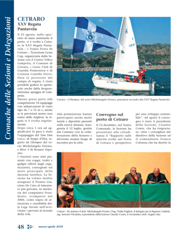 Cronache delle Sezioni e Delegazioni CETRARO XXV Regata Pantavela Il 23 agosto, nello specchio di mare antistante il porto, si è svolta a Cetraro la XXV Regata Pantavela – I Trofeo Porto Di Cetraro – Tyrrenium Lions Cup, organizzata dalla Sezione con il Centro Velico Lampetia, il Comune di Cetraro, i Lions Club di Guardia Piemontese e di Cosenza Castello Svevo. Data la posizione del campo di regata, è stato possibile godere lo spettacolo anche dalla frequentatissima spiaggia di Lampetia. Hanno preso parte alla competizione 16 equipaggi con imbarcazioni di vario tipo da 7 a 15 m e, anche se le previsioni meteo non erano delle migliori, la regata si è svolta regolarmente. Dopo circa 1 ora ad aggiudicarsi la gara è stato l’equipaggio del Tam Tam Cuccy, di Sergio d’Elia, seguito da Olympus del socio Michelangelo Ferraro, e Brise 3 di Rosario Esposito. I vincitori sono stati premiati con coppe, trofei e gadget offerti dagli organizzatori, consegnati sul molo principale della darsena turistica. La Sezione ha voluto inoltre assegnare il Premio Giacinto De Caro al timoniere più giovane, in memoria del compianto Presidente, scomparso nel 2006, come segno di attenzione e sensibilità della Lega Navale nell’avvicinare i giovani al mondo della vela. 48 Cetraro - L’Olympus, del socio Michelangelo Ferraro, piazzatosi secondo alla XXV Regata Pantavela Alla premiazione hanno partecipato anche molti turisti e diportisti presenti nella nuova darsena, inaugurata il 12 luglio, gestita dal Comune con la collaborazione della Sezione e divenuta oramai luogo di incontro per la città. Convegno sul porto di Cetraro Il 12 dicembre, nel Teatro Comunale, la Sezione ha presentato alla cittadinanza il “Rapporto sulle attività svolte nel Porto di Cetraro e prospettive per uno sviluppo sostenibile”. Ad aprire il convegno è stato il presidente della Sezione, Claudio Conte, che ha ringraziato, oltre i consiglieri del direttivo della Sezione ed il comandante Franco Colonna che ha diretto la Cetraro - Da sinistra: il dott. Michelangelo Ferraro, l’ing. Nadia Pugliese, il delegato per la Regione Calabria rag. Antonio Nicoletta, il presidente della Sezione Claudio Conte, il vicesindaco dott. Angelo Aita marzo-aprile 2010 Palmi - Il grande presepio animato allestito lo scorso Natale, nell’ambientazione della spiaggia di Marinella come doveva apparire tra la fine dell’800 e l’inizio del ’900 PALMI Si rinnova il Presepe cittadino Anche quest’anno, nel rispetto della tradizione, l’Associazione “Per Palmi” e la Sezione, con la collaborazione dell’amministrazione comunale, hanno realizzato iniziative e manifestazioni per creare, nella ricorrenza della Natività, la magica atmosfera natalizia. Per questo è stato realizzato, nell’hangar dell’ex AMA, un artistico Presepe animato elettromeccanico, interamente realizzato a mano, con movimenti ed effetti luminosi di alba, giorno, tramonto e notte, dalle dimensioni di circa 100 metri quadrati che ha avuto, come ambientazione, la spiaggia della Marinella degli anni di fine 800 ed inizio 900, con la fedele riproduzione dei fabbricati di allora, il ponticello, la caratteristica stradina serpeggiante, il vallone che incanala verso il mare l’acqua proveniente dall’Acqualive ed il selvaggio costone della Motta. Vi sono anche rappresentati i palmesi intenti ai lavori e, soprattutto, vi è il sentimento di accoglienza e solidarietà che non respinge il barcone nero che approda fra gli scogli, ma accetta ed integra i migranti africani ed asiatici, organizzando fuochi per scaldarli e sfamarli. Vi sono inoltre, tirati a secco tra i sassi, quattro modelli di antiche barche da pesca tipiche di questa costa, realizzati in legno ed in scala, perfettamente equilibrati e galleggianti: una feluca ed un lontru con cui si avvistava e si cacciava il pesce spada nella Costa Viola e nello Stretto di Messina; la lampara, con cui tuttora si pesca di notte; ed una caratteristica imbarcazione a vela, del tipo un tempo utilizzato per il commercio con la Sicilia. Quindi in un ambiente formato da grandi archi tuttora esistenti ed un tempo utilizzati per il ricovero delle barche, è stata inserita la Natività con attorno i Re Magi, pastori e marinai adoranti il Messia. Rocco Militano / Giuseppe Cricrì / Alberto Ierace CIVITAVECCHIA Vittoria agli Euro Techno 293 Domenica 3 gennaio Mattia Camboni, atleta della Sezione, ha vinto i Campionati Europei Techno 293 categoria Under 15 che si sono svolti a Cadice, in Spagna. Purtroppo la campionessa mondiale Veronica Fanciulli, ammalatasi di influenza fin dal primo giorno, ha potuto prendere parte solo alle ultime tre regate ottenendo il 24° posto. Nella flotta Under 17, la più numerosa con 100 atleti in regata, Daniele Benedetti, anch’egli socio della Sezione, si è classificato 13° mentre Daniele Guzzone, un altro nostro atleta, 34°. SENIGALLIA Telethon for Life La Sezione, in occasione della Cena Sociale organizzata il 12 dicembre, ha marzo-aprile 2010 49 Cronache delle Sezioni e Delegazioni darsena portuale, tutti coloro che hanno contribuito e reso possibile il difficile avvio delle sue attività. Questa è stata inaugurata il 12 luglio e gestita dal Comune fino al 30 novembre con la collaborazione tecnico-logistica della Sezione, alle cui competenze tecniche e di settore il Comune si è appoggiato per avviarne le attività di gestione; per questo motivo il 9 luglio Comune e Sezione hanno stipulato una convenzione “per i servizi di assistenza all’attracco e di sorveglianza delle unità ormeggiate, nonché la manutenzione ordinaria dei pontili ed il decoro dei luoghi della darsena turistica”. L’ingegnere Nadia Pugliese e il dottor Michelangelo Ferraro, nostri soci, hanno in seguito esposto i dati relativi a tutte queste attività, in termini di numero di contratti stipulati e dei relativi incassi, delle tipologie di imbarcazioni presenti, di numero di registrazioni e relativi incassi ai pontili di transito, 