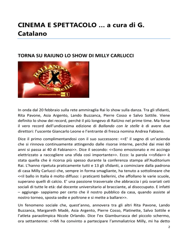 CINEMA E SPETTACOLO … a cura di G. Catalano TORNA SU RAIUNO LO SHOW DI MILLY CARLUCCI In onda dal 20 febbraio sulla rete ammiraglia Rai lo show sulla danza. Tra gli sfidanti, Rita Pavone, Asia Argento, Lando Buzzanca, Pierre Cosso e Salvo Sottile. Viene definito lo show dei record, perché il più longevo di RaiUno nel prime time. Ma forse il vero record dell’undicesima edizione di Ballando con le stelle è di avere due direttori: l’uscente Giancarlo Leone e l’entrante di fresca nomina Andrea Fabiano. Dice il primo complimentandosi con il suo successore: <<E’ il segno di un’azienda che si rinnova continuamente attingendo dalle risorse interne, perché dai miei 60 anni si passa ai 40 di Fabiano>>. Dice il secondo: <<Sono emozionato e mi accingo elettrizzato a raccogliere una sfida così importante>>. Ecco: la parola <<sfida>> è stata quella che è ricorsa più spesso durante la conferenza stampa all’Auditorium Rai. L’hanno ripetuta praticamente tutti e 13 gli sfidanti, a cominciare dalla padrona di casa Milly Carlucci che, sempre in forma smagliante, ha tenuto a sottolineare che <<il ballo in Italia è molto diffuso: i praticanti ballerini, che affollano le varie scuole, superano quelli di calcio. E’ una passione trasversale che abbraccia i più svariati ceti sociali di tutte le età: dal docente universitario al bracciante, al disoccupato. E infatti – aggiunge- sappiamo per certo che il nostro pubblico da casa, quando assiste al nostro torneo, sposta sedie e poltrone e si mette a ballare>>. Un fenomeno sociale che, quest’anno, annovera tra gli altri Rita Pavone, Lando Buzzanca, Margareth Madè, Asia Argento, Pierre Cosso, Platinette, Salvo Sottile e l’atleta paraolimpica Nicole Orlando. Dice l’ex Giamburrasca del piccolo schermo, ora settantenne: <<Mi ha convinto a partecipare l’ammaliatrice Milly, mi ha detto 2 che mi sarei divertita. E infatti sto provando una gioia immensa, nonostante un ginocchio che mi fa un po’ male. Ho accettato la sfida perché non sono mai contenta, mi voglio sempre provare in nuove cose, nuova adrenalina>>. Buzzanca accetta di ballare, ma intanto PENSA AL CINEMA: <<Dopo 56 anni di carriera, sto chiudendo il cerchio dei miei personaggi: mi mancava il ballerino, ma nel prossimo film che faccio a fine aprile sarò un gay che poi muore. Il prossimo personaggio deve essere quello del killer, così chiudo definitivamente il cerchio>>. Ma Platinette, al secolo Mauro Coruzzi, che appare dimagrito <<perché – dice – mi veniva il fiato grosso per salire una rampa di scale, quindi ho dovuto diminuire il girovita, sostituendo le regole al vizio>>, approfitta dell’occasione per fare un elogio a RaiUno: <<Sono stato escluso spesso dai programmi di prima serata e il fatto che ora io sia qui è la dimostrazione di apertura, senza pregiudizi, di questa rete nei confronti di chi non sceglie il suo orientamento sessuale, ma se lo trova addosso>>. E forse non a caso la guest star della prima puntata è la drag queen Conchita Wurst. E la simpatica Nicole Orlando, atleta polivalente che al recente Festival di Sanremo ha avuto il coraggio di dire a Gabriel Garko che <<non piace a mia madre>>, vive lo show danzante davvero come una sfida: <<Non devo mollare mai>>. 2