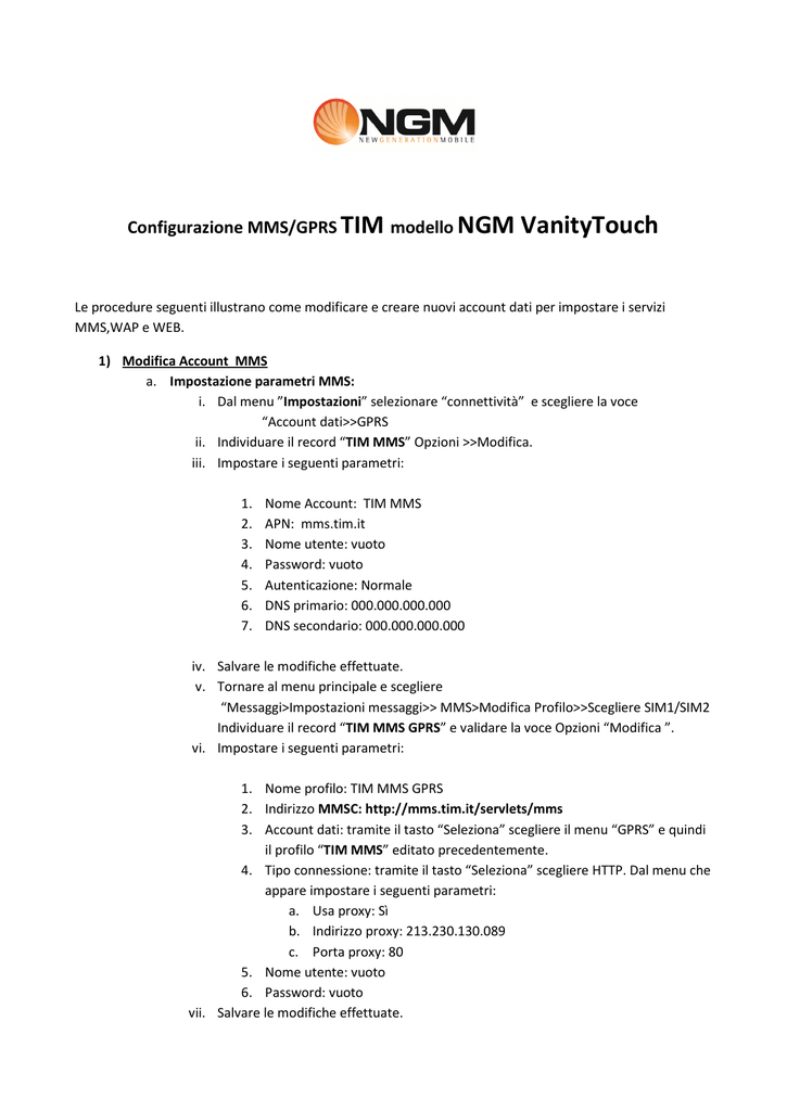 Configurazione MMS/GPRS TIM modello NGM VanityTouch