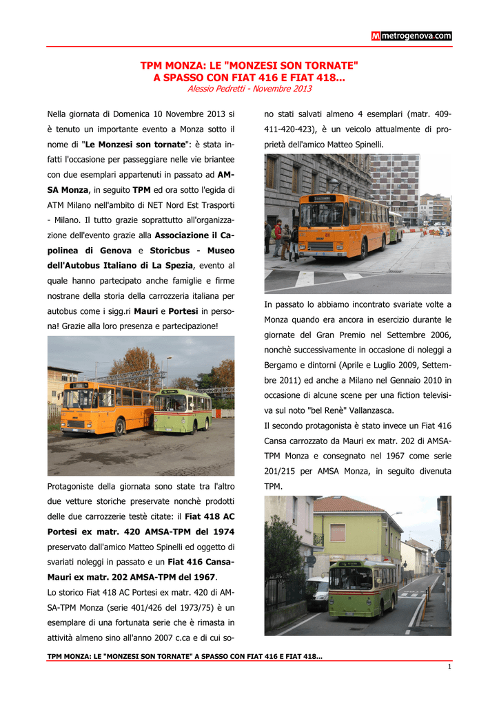 TPM MONZA: LE "MONZESI SON TORNATE" A SPASSO CON FIAT 416 E FIAT 418... Alessio Pedretti - Novembre 2013 Nella giornata di Domenica 10 Novembre 2013 si no stati salvati almeno 4 esemplari (matr. 409- è tenuto un importante evento a Monza sotto il 411-420-423), è un veicolo attualmente di pro- nome di "Le Monzesi son tornate": è stata in- prietà dell'amico Matteo Spinelli. fatti l'occasione per passeggiare nelle vie briantee con due esemplari appartenuti in passato ad AMSA Monza, in seguito TPM ed ora sotto l'egida di ATM Milano nell'ambito di NET Nord Est Trasporti - Milano. Il tutto grazie soprattutto all'organizzazione dell'evento grazie alla Associazione il Capolinea di Genova e Storicbus - Museo dell'Autobus Italiano di La Spezia, evento al quale hanno partecipato anche famiglie e firme nostrane della storia della carrozzeria italiana per autobus come i sigg.ri Mauri e Portesi in persona! Grazie alla loro presenza e partecipazione! In passato lo abbiamo incontrato svariate volte a Monza quando era ancora in esercizio durante le giornate del Gran Premio nel Settembre 2006, nonchè successivamente in occasione di noleggi a Bergamo e dintorni (Aprile e Luglio 2009, Settembre 2011) ed anche a Milano nel Gennaio 2010 in occasione di alcune scene per una fiction televisiva sul noto "bel Renè" Vallanzasca. Il secondo protagonista è stato invece un Fiat 416 Cansa carrozzato da Mauri ex matr. 202 di AMSATPM Monza e consegnato nel 1967 come serie 201/215 per AMSA Monza, in seguito divenuta Protagoniste della giornata sono state tra l'altro TPM. due vetture storiche preservate nonchè prodotti delle due carrozzerie testè citate: il Fiat 418 AC Portesi ex matr. 420 AMSA-TPM del 1974 preservato dall'amico Matteo Spinelli ed oggetto di svariati noleggi in passato e un Fiat 416 CansaMauri ex matr. 202 AMSA-TPM del 1967. Lo storico Fiat 418 AC Portesi ex matr. 420 di AMSA-TPM Monza (serie 401/426 del 1973/75) è un esemplare di una fortunata serie che è rimasta in attività almeno sino all'anno 2007 c.ca e di cui soTPM MONZA: LE "MONZESI SON TORNATE" A SPASSO CON FIAT 416 E FIAT 418... 1 tempo immemore dal servizio di trasporto pubblico urbano, nonostante i vari cambiamenti e vicissitudini dell'azienda urbana briantea. In particolare nelle foto è possibile osservare i due veicoli affiancati presso l'Autostazione e Stazione Ferroviaria, in centro presso Lgo XXV Aprile in compagnia di un più giovane Citelis di TPM - Net Milano, nei pressi di Brugherio e sulla nota e storica circolare DS ed SN ed è possibile anche osservare il piccolo e simpatico Fiat 416 Cansa - Mauri Tale gruppo di macchine venne radiato entro il colto in varie strade cittadine monzesi. 1984 ad eccezione dei due esemplari matr. 201 e 202, nel caso di quest'ultima venne ceduta al MNT Museo Nazionale dei Trasporti di La Spezia e successivamente per vie traverse ereditata dall'Associazione Il Capolinea di Genova. In passato abbiamo avuto modo di incontrare tale ex matr. 202 già durante la sua nuova carriera da "preservata" nel Settembre 2006 a Torino in occasione del Raduno ASI Show per i 40 anni di attività. Un particolare ringraziamento a chi ha avuto, ha ed avrà sempre tempo e voglia di organizzare un evento del genere, in particolare alle Associazioni Il Capolinea e Storicbus - Museo dell'Autobus Italiano per l'organizzazione e la sempre incessante voglia di organizzare manifestazioni e noleggi anche lontano dalle loro rispettive sedi operative. Grazie! Testo e immagini di Alessio Pedretti I due esemplari hanno avuto così modo di poter scorrazzare nuovamente tra le vie e strade monzesi toccando il Centro, la Stazione Ferroviaria e l'Autostazione, il deposito di Via Borgazzi (già ex tranviario interurbano di ATM Milano), nonchè i vari quartieri di S.Alessandro, S.Albino, lo Stadio, l'Ospedale ed i vari punti della rete monzese storicamente toccati da queste vetture ed ormai da TPM MONZA: LE "MONZESI SON TORNATE" A SPASSO CON FIAT 416 E FIAT 418... 2