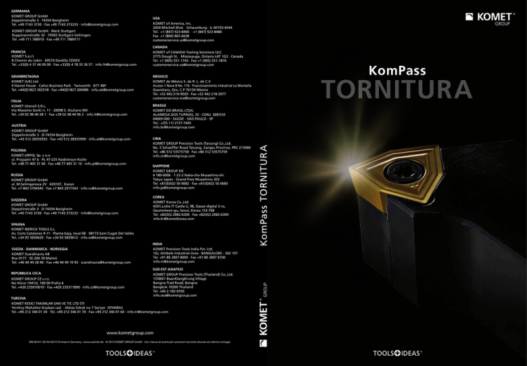Germania KOMET GROUP GmbH Zeppelinstraße 3 · 74354 Besigheim Tel. +49 7143 3730 · Fax +49 7143 373233 · [email protected] KOMET GROUP GmbH · Werk Stuttgart Ruppmannstraße 32 · 70565 Stuttgart-Vaihingen Tel. +49 711 788910 · Fax +49 711 7889111 USA KOMET of America, Inc. 2050 Mitchell Blvd. · Schaumburg · IL 60193-4544 Tel. +1 (847) 923-8400 · +1 (847) 923-8480 Fax +1 (800) 865-6638 [email protected] Canada Francia KOMET S.à.r.l. 8 Chemin du Jubin · 69574 Dardilly CEDEX Tel. +33(0) 4 37 46 09 00 · Fax +33(0) 4 78 35 36 57 · [email protected] KOMET of CANADA Tooling Solutions ULC 2775 Slough St. · Mississauga, Ontario L4T 1G2 · Canada Tel. +1 (905) 551-1743 · Fax +1 (905) 551-1876 [email protected] Granbretagna KOMET (UK) Ltd. 4 Hamel House · Calico Business Park · Tamworth · B77 4BF Tel. +44(0)1827.302518 · Fax +44(0)1827.300486 · [email protected] Messico KOMET de México S. de R. L. de C.V Acceso 1 Nave 8 No. 116 · Fraccionamiento Industrial La Montaña Querétaro, Qro. C.P 76150 México Tel. +52 442-210-9020 · Fax +52 442-218-2077 [email protected] Austria KOMET GROUP GmbH Zeppelinstraße 3 · D-74354 Besigheim Tel. +43 512 28355932 · Fax +43 512 28355999 · [email protected] Polonia KOMET-URPOL Sp. z o.o ul. Przyjaźni 47 b · PL 47-225 Kędzierzyn-Koźle Tel. +48 77 405 31 00 · Fax +48 77 405 31 10 · [email protected] Russia KOMET GROUP GmbH ul. M.Salimganova 2V · 420107, Kazan Tel. +7 843 5704345 · Fax +7 843 2917543 · [email protected] Svizzera KOMET GROUP GmbH Zeppelinstraße 3 · D-74354 Besigheim Tel. +49 7143 3730 · Fax +49 7143 373233 · [email protected] Brasile KOMET DO BRASIL LTDA. Alameda dos Tupinás, 33 - Conj. 309/310 04069-000 - Saúde - São Paulo - SP Tel.: +(55 11) 2737-7445 [email protected] Cina KOMET GROUP Precision Tools (Taicang) Co.,Ltd. No. 5 Schaeffler Road Taicang, Jiangsu Province, PRC 215400 Tel. +86 512 53575758 · Fax +86 512 53575759 [email protected] Giappone KOMET GROUP KK # 180-0006 · 1-22-2 Naka-cho Musashino-shi Tokyo Japan · Grand Preo Musashino 203 Tel. +81(0)422 50 0682 · Fax +81(0)422 50 0683 [email protected] Corea KOMET Korea Co.,Ltd. #201,Lotte IT Castle-2, 98, Gasan digital 2-ro, Geumcheon-gu, Seoul, Korea 153-768 Tel. +82(0)2.2082-6300 · Fax +82(0)2.2082-6309 [email protected] Spagna KOMET IBERICA TOOLS S.L. Av. Corts Catalanes 9-11 · Planta baja, local 6B · 08173 Sant Cugat Del Valles Tel. +34 93 5839620 · Fax +34 93 5839612 · [email protected] Svezia · Danimarca · Norvegia KOMET Scandinavia AB Box 9177 · SE-200 39 Malmö Tel. +46 40 49 28 40 · Fax +46 40 49 19 95 · [email protected] Repubblica Ceca KOMET GROUP CZ s.r.o. Na Hůrce 1041/2, 160 00 Praha 6 Tel. +420 235010010 · Fax +420 235311890 · [email protected] Tornitura India KOMET Precision Tools India Pvt. Ltd. 16J, Attibele Industrial Area · BANGALORE - 562 107 Tel. +91 80 2807 8000 · Fax +91 80 2807 8100 [email protected] Sud-est asiatico KOMET GROUP Precision Tools (Thailand) Co.,Ltd. 1558/61 BaanKlangKrung Village Bangna-Trad Road, Bangna Bangkok 10260 Thailand Tel. +66 2-182-0556 [email protected] Turchia KOMET KESICI TAKIMLAR SAN VE TIC LTD STI Yenikoy Mahallesi Koybasi cad. · Akbas Sokak no 7 Sariyer ISTANBUL Tel. +90 212 346 01 34 · Tel. +90 212 346 01 70 · Fax +90 212 346 01 64 · [email protected] www.kometgroup.com 399 04 011 02-5H-02/15 Printed in Germany www.wachter.de · © 2015 KOMET GROUP GmbH · Con riserva di eventuali variazioni tecniche dovute ad ulteriori sviluppi. KomPass Tornitura Italia KOMET Utensili S.R.L. Via Massimo Gorki n. 11 · 20098 S. Giuliano Mil. Tel. +39 02 98 40 28 1 · Fax +39 02 98 44 96 2 · [email protected] KomPass KomPass Tornitura – VANTAGGI per voi: KOMET GROUP – Competenza TORNITURA Con le sue soluzioni innovative e la progettazione di utensili per la lavorazione dei fori, il GRUPPO KOMET è leader sul mercato in tutto il mondo. I nostri sviluppi per foratura, alesatura, filettatura, fresatura e tornitura contribuiscono in gran parte al successo dei nostri clienti. Lo spirito pionieristico, un'esperienza decennale e la continua ricerca di soluzioni innovative confluiscono nel nostro programma completo di utensili per la lavorazione di esterni ed interni. Facile manovrabilità e massime esigenze di qualità formano la base per risultati di lavorazione ottimale. 2 Panoramica del programma 4–7 1 Lavorazione interna Utensili con inserti Lavorazione interna Utensili HSS e in metallo duro integrale UniTurn® 8 – 22 2 23 – 45 3 Lavorazione externa Utensili con inserti 46 – 51 4 Lavorazione externa Utensili HSS e in metallo duro integrale 52 – 55 5 Corpo di taglio 56 – 99 6 Attacchi Informazioni Codice d'ordinazione alfanumerico KOMET SERVICE® | KOMET® BRINKHAUS 100 – 119 7 120 – 139 3 Programma – Utensili con inserti 1 Lavorazione interna 6 Bareno / Scalpello rotativo a bloccaggio Adattatori E 102 – 103 W01/W29 92° x6 x8 x 10 W01/W29 93° x 12 x 16 x 20 x 25 x 32 E 10 – 11 W60/W79 93° x 10 x 12 x 16 x 20 x 25 x 32 E 12 – 13 W60/W79 107°30' x 10 x 12 x 16 x 20 x 25 x 32 E 14 – 15 W30/W57 92° x8 x 10 x 12 x 15 x 16 x 18 x 20 W30/W57 100° x8 x 10 x 12 x 16 x 20 W30/W57 90° x8 x 16 W01/W29 91° m 16 m 20 m 25 3 E8–9 E 16 – 17 E 18 – 19 E 20 – 21 m 32 m 40 E 22 x8 x 10 x 12 x 16 x 20 x 25 x 32 ABS 50 x 10 x 12 x 16 x 20 x 25 x 32 HSK-A 63 Adattatori VDI DIN 69880 NC..10 E 105 ABS-N 40 ABS-N 50 ABS-N 63 ABS-N 80 ABS-N 100 NC 30 NC 40 NC 50 NC 60 NC..20 E 106 ABS-N 50 ABS-N 63 ABS-N 80 ABS-N 100 NC 30 NC 40 NC 50 NC 60 Smorzatore vibrazioni torsionali VDI NC..20 E 107 Lavorazione externa Scalpello rotativo a bloccaggio E 49 E 46 – 48 W01/W29 93° 90° 45° Attacchi ABS 50 ABS 63 ABS 80 E 50 W60/W79 93° E 51 W04 90° 60° 45° W04 90° NC 40 NC 50 Adattatori E 104 m 12 m 16 m 20 m 25 m 32 ABS-N 40 ABS-N 50 ABS-N 63 ABS-N 80 ABS-N 100 Adattatori TC E 108 6 Sistema di bloccaggio HSK KomLoc® Flange frontali E 110 Flange da integrare E 112 Flangia breve E 