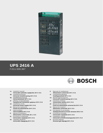 UPS 2416 A F.01U.500.367 cs da de el en es fi fr hr hu Instalační manuál Univerzální jednotka napájecího 24 V / 6 A Installationsmanual Universel strømforsyning 24 V / 6 A Installationsanleitung Universalnetzteil 24 V / 6 A Oδηγϊες σuvαρμολόγησης Τροφοδοτικό πολλαπλών χρήσεων 24 V / 6 A Installation Guide Universal Power Supply 24 V / 6 A Manual de Instalación Fuente de alimentación 24 V / 6 A Asennusohjeet Yleisvirtalähde 24 V / 6 A Manuel d’installation Alimentation universelle 24 v / 6 A Priručnik za instaliranje Univerzalno napajanje 24 V / 6 A Telepítési kézikönyv Univerzális tápegység 24 V / 6 A it nl no pl pt ro ru sl sv tr Manuale di installazione Alimentatore universale 24 V / 6 A Installatiehandleiding Voedingseenheid 24 V / 6 A Monteringsinstruksoner Universell strømforsyning 24 V / 6 A Instrukcja instalacji Uniwersalny zasilacz 24 V / 6 A Manual de Instalação Fonte de alimentação universal de 24 V / 6 A Manual de Instalara Alimentare universalć 24 V / 6 A Инструкция по установке УниверсапьньIй источник питания 24 B / 6 A Priročnik za montažo Univerzalni napajalnik 24 V / 6 A Installation manual Universell strömförsörjningsenhet 24 V / 6 A UPS 2416 A 3 UPS 2416 A ⇒ FPO-5000-PSB1 1 BCM-0000-B 24 V 24 V MAIN POWER BCM-0000-B MAIN POWER TROUBLE BATTERY 1 TROUBLE BATTERY 2 Σ TROUBLE 24 V UPS 2416 A Bosch Sicherheitssysteme GmbH F.01U.003.349 | 6.0 | 2009.03 UPS 2416 A 4 UPS 2416 A ⇒ FPO-5000-PSB1 2 4 Bosch Sicherheitssysteme GmbH 3 5 F.01U.003.349 | 6.0 | 2009.03 UPS 2416 A 5 UPS 2416 A ⇒ FPO-5000-PSB-CH 1 2 3 4 Bosch Sicherheitssysteme GmbH F.01U.003.349 | 6.0 | 2009.03 UPS 2416 A 6 PSM 0002 A PSB 0004 A HBC 0010 A HBE 0012 A HCP 0006 A PSS 0002 A Bosch Sicherheitssysteme GmbH F.01U.003.349 | 6.0 | 2009.03 cs | 7 UPS 2416 A Popis funkcí Modul UPS 2416 A v zásuvném provedení s konektorem pro rack a ústøednu je univerzální jednotka napájecího zdroje s jedním výstupem pro systém poární detekce FPA. - Modul je chráněn proti přepětí a obrácené polaritě. - Výstupní napětí je externě sledováno a regulováno. - Integrovaný zelený indikátor LED informuje o funkčnosti napájecího zdroje (stejnosměrného výstupu). - V případě výpadku hlavního napájení nebo výstupu stejnosměrného napájení, výstup na svorce FAULT (Poz. 6) klesne na 0 V. Poz. Označení Připojení 1 2 3 ACL ACN Hlavní přívod stř. napětí 4 5 6 7 8 DC+ DCFAULT RTH+ RTH- 1 2 3 4 5 6 7 8 LED 1 8 Ochranné uzemnění Výstup 26 - 29 V stejnosm. plus Výstup 0 V stejnosm. mínus Porucha napájení Teplotní senzor plus Teplotní senzor mínus Používejte napájecí zdroj jen v držácích zdroje a skříních (např. skříň ústředny) k tomuto určených! Technické údaje Vstupní napětí Vstupní frekvence Odběr proudu Účinnost Doba setrvání Výstupní napětí Maximální zatíení Stálý výstupní výkon Chlazení Krytí podle IEC 60950 / EN 60950 Přípustná provozní teplota Přípustná skladovací teplota Přípustná relativní vlhkost Materiál krytu Barva krytu Rozměry (V x Š x H) Hmotnost Bosch Sicherheitssysteme GmbH 100 V stř. - 240 V stř. (min - max) 50 Hz . . . 60 Hz Max. 1,95 A > 85 % > 16 ms při 115 V stř. 26 V stejnosm. - 29 V stejnosm. 6A 160 W Prouděním vzduchu bez ventilátoru I -5 _C . . . 50 _C -20 _C . . . 60 _C max. 95% nekondenzující Anodicky oxidovaný hliník Pololesklá černá přibl. 200 mm x 100 mm x 40 mm přibl. 780 g F.01U.003.349 | 6.0 | 2009.03 da | 8 UPS 2416 A Funktioner UPS 2416 A i plug-in design med rack- og panelkabel er en universel strømforsyningsenhedmed enkelt udgang til FPA branddetekteringssystemet. - Modellen er beskyttet mod overspænding og omvendt polaritet. - Udgangsspændingen overvåges og styres eksternt. - Den grønne on-board LED angiver, at strømforsyningen fungerer (jævnstrømsudgang). - Den åbne kollektorudgang ved fejlterminalen FAULT (Pos. 6) opretter et signal for strømfejlfunktion i tilfælde af kortslutning. Pos. Afmærkning 1 2 3 4 5 6 7 8 LED 1 8 Tilslutning 1 ACL 2 3 ACN 4 DC+ 26 V DC . . . 29 V DC udgang plus 5 DC- 0 V DC udgang minus 6 FAULT strømforsyningsfejl 7 RTH+ Temperatursensor plus 8 RTH- Temperatursensor minus Vekselsstrømsnet Beskyttelsesjording UPS 2416 A strømforsyningsenheden må kun bruges inden for de specialdesignede strømforsyningskonsoller! Tekniske specifikationer Indgangsspænding indgangsfrekvens Strømforbrug Virkningsgrad Holdetid Udgangsspænding Maksimalindlæsning Kontinuerlig udgangsstrøm Køling Sikkerhedsklasse i henhold til IEC 60950 / EN 60950 Tilladt driftstemperatur Tilladt opbevaringstemperatur Tilladt relativ luftfugtighed Husmateriale Husfarve Mål (H x B x D) Vægt Bosch Sicherheitssysteme GmbH 100 V AC . . . 240 V AC (min - max) 50 Hz . . . 60 Hz 1,95 A max. > 85 % > 16 ms ved 115 V AC 26 V DC . . . 29 V DC 6A 160 W Konvektion uden blæser I -5 _C . . . 50 _C -20 _C . . . 60 _C maks. 95% ikke kondenserende Aluminium, anodiseret halvglans sort Ca. 200 x 100 x 40 mm Ca. 780 g F.01U.003.349 | 6.0 | 2009.03 UPS 2416 A de | 9 Funktionsbeschreibung Das UPS 2416 A ist ein Plug-and-Play-Schaltnetzteil für die Spannungsversorgung der FPA Zentralen. - Das Netzteil ist gegen Verpolung und Überspannung geschützt. - Die Ausgangsspannung wird extern überwacht und geregelt. - Eine grüne LED zeigt die Funktionsfähigkeit an. - Bei Netzausfall oder Ausfall der DC-Ausgangsspannung schaltet Ausgang FAULT (Pos. 6) gegen 0 V. Pos. 1 2 3 Beschr. ACL ACN 4 5 6 7 8 DC+ DCFAULT RTH+ RTH- 1 2 3 4 5 6 7 8 LED 1 8 Anschluss Netzanschluss Schutzerde 26 V DC . . . 29 V DC Ausgang plus 0 V DC Ausgang minus Ausgang Störung Netz Temperatursensor plus Temperatursensor minus Verwenden Sie das Netzteil nur in den vorgesehenen Netzteilhalterungen und einer Brandschutzumhüllung (z.B. Zentralengehäuse)! Technische Daten Eingangsspannung