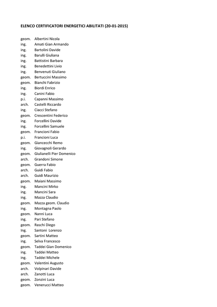 ELENCO CERTIFICATORI ENERGETICI ABILITATI (20-01-2015) geom. ing. ing. ing. ing. ing. ing. geom. geom. ing. ing. p.i. arch. ing. geom. ing. ing. geom. p.i. geom. ing. geom. arch. geom. arch. arch. geom. ing. ing. ing. geom. ing. geom. ing. geom. Ing. geom. ing. geom. ing. ing. geom. arch. arch. geom. geom. Albertini Nicola Amati Gian Armando Bartolini Davide Barulli Giuliana Battistini Barbara Benedettini Livio Benvenuti Giuliano Bertuccini Massimo Bianchi Fabrizio Biordi Enrico Canini Fabio Capanni Massimo Castelli Riccardo Ciacci Stefano Crescentini Federico Forcellini Davide Forcellini Samuele Francioni Fabio Francioni Luca Giancecchi Remo Giovagnoli Gerardo Giulianelli Pier Domenico Grandoni Simone Guerra Fabio Guidi Fabio Guidi Maurizio Maiani Massimo Mancini Mirko Mancini Sara Mazza Claudio Mazza geom. Claudio Montagna Paolo Nanni Luca Pari Stefano Raschi Diego Santoni Lorenzo Sartini Matteo Selva Francesco Taddei Gian Domenico Taddei Matteo Taddei Michele Valentini Augusto Volpinari Davide Zanotti Luca Zonzini Luca Venerucci Matteo