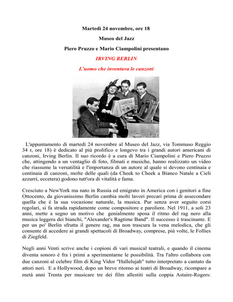 Martedì 24 novembre, ore 18 Museo del Jazz Piero Pruzzo e Mario Ciampolini presentano IRVING BERLIN L’uomo che inventava le canzoni L'appuntamento di martedì 24 novembre al Museo del Jazz, via Tommaso Reggio 34 r, ore 18) è dedicato al più prolifico e longevo tra i grandi autori americani di canzoni, Irving Berlin. Il suo ricordo è a cura di Mario Ciampolini e Piero Pruzzo che, attingendo a un ventaglio di foto, filmati e musiche, hanno realizzato un video che riassume la versatilità e l'importanza di un autore al quale si devono centinaia e centinaia di canzoni, molte delle quali (da Cheek to Cheek a Bianco Natale a Cieli azzurri, eccetera) godono tutt'ora di vitalità e fama. Cresciuto a NewYork ma nato in Russia ed emigrato in America con i genitori a fine Ottocento, da giovanissimo Berlin cambia molti lavori precari prima di assecondare quella che è la sua vocazione naturale, la musica. Pur senza aver seguito corsi regolari, si fa strada rapidamente come compositore e paroliere. Nel 1911, a soli 23 anni, mette a segno un motivo che genialmente sposa il ritmo del rag nero alla musica leggera dei bianchi, "Alexander's Ragtime Band". Il successo è trascinante. E per un po' Berlin sfrutta il genere rag, ma non trascura la vena melodica, che gli consente di accedere ai grandi spettacoli di Broadway, comprese, più volte, le Follies di Ziegfeld. Negli anni Venti scrive anche i copioni di vari musical teatrali, e quando il cinema diventa sonoro è fra i primi a sperimentarne le possibilità. Tra l'altro collabora con due canzoni al celebre film di King Vidor "Hallelujah" tutto interpretato a cantato da attori neri. E a Hollywood, dopo un breve ritorno ai teatri di Broadway, ricompare a metà anni Trenta per musicare tre dei film allestiti sulla coppia Astaire-Rogers: "Cappello a cilindo", "Seguendo la flotta" e "Girandola". Sue canzoni entrano poi nelle colonne sonore di vari film degli anni Quaranta e Cinquanta. La sua carriera si chiude praticamente con "Anna prendi il fucile" e "Call Me Madam", entrambi nati per il teatro ma trasferiti poi anche sullo schermo. Intanto una sua vecchia canzone patriottica, "God Bless America", è diventata una sorta di secondo inno nazionale degli Stati Uniti. Berlin, tra iniziative benefiche e amministrazione dei suoi beni, arriva a toccare i 101 anni. Esce di scena nel 1989. Ma molte delle sue canzoni sono ancora parte ben viva del patrimonio musicale del mondo.
