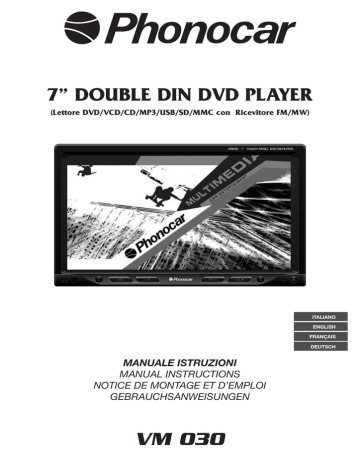 7” DOUBLE DIN DVD PLAYER (Lettore DVD/VCD/CD/MP3/USB/SD/MMC con Ricevitore FM/MW) ITALIANO ENGLISH FRANÇAIS DEUTSCH MANUALE ISTRUZIONI MANUAL INSTRUCTIONS NOTICE DE MONTAGE ET D’EMPLOI GEBRAUCHSANWEISUNGEN VM 030 Informazioni sicurezza Indice Informazioni di Sicurezza................................. Pannello di controllo......................................... Guida rapida..................................................... Telecomando.................................................... Riproduzione USB/SD/MMC MP3 ................. Funzioni Generali.............................................. - Selezione Sorgente........................................ - Radio.............................................................. - RDS................................................................ - Riproduzione DVD.......................................... - Riproduzione Video CD.................................. - Riproduzione CD............................................ - Menu MP3/MP4/PHOTO............................... - Riproduzione MP4......................................... - Riproduzione Foto.......................................... Impostazione di Sistema.................................. - SELECT Selezione Menu............................... - SETUP Menu Impostazione........................... Impostazione setup DVD.................................. - Sistema TV..................................................... - Lingua............................................................ - Audio.............................................................. - Video.............................................................. - Audio Digitale................................................. Collegamenti Elettrici....................................... Guida all’Installazione....................................... Problemi e soluzioni......................................... Specifiche Tecniche......................................... Grazie per aver acquistato il nostro Lettore. Leggere il presente Manuale, prima di utilizzare l’apparecchio. AVVERTENZE • Per ridurre i rischi d’incendio o di scosse elettriche, non esporre l’apparecchio a pioggia o umidità. • Non guardare mai filmati mentre si è alla guida, per evitare di infrangere Leggi o Codici e soprattutto, per evitare il rischio di incidenti stradali. ATTENZIONE Trattasi di un prodotto LASER CLASSE 1. Comandi, Regolazioni e Applicazioni eseguiti in maniera diversa da quanto descritto, possono dare luogo a pericolose emissioni di radiazioni. Non aprire coperchi e non cercare di riparare in proprio. Rivolgersi sempre al personale qualificato preposto per il Servizio Post-Vendita. DUE PRODOTTI LASER Lunghezza d’onda: CD: 780nm; DVD: 650nm Potenza Laser: in presenza della protezione di sicurezza, non è emessa alcuna radiazione pericolosa. Per ridurre il rischio di scosse elettriche e interferenze, utilizzare esclusivamente i componenti forniti nell’imballo. NOTE RELATIVE AI CD - CD eventualmente difettosi o sporchi possono dare luogo ad interruzioni nell’audio. - Maneggiare i CD esclusivamente come mostrato in figura - Non afferrare mai i CD dalla parte priva di etichetta - Ai CD, non attaccare mai e da nessuna parte, sigilli o etichette - Non esporre i CD al sole diretto o ad eccessivo calore - Per pulire il CD, passare un panno pulito, dal centro verso l’esterno - Non utilizzare mai solventi come Trielina o alcool. - Il presente apparecchio non è in grado di riprodurre CD da 3” (8cm). Non inserire quindi mai CD da 3” o CD dalla forma irregolare. L’apparecchio potrebbe non riuscire ad espellere tali CD. 2 2 3 3 4 6 7 7 7 8 8 9 9 10 10 10 11 11 11 13 13 14 15 15 16 17 18 19 20 Pannello di controllo IT Premere il tasto (ON/Off) per accendere/spegnere l’apparecchio. 6. Mute (silenzia l’audio) 1. Pannello touch screen -Premere per oltre 2 secondi, per accedere alla 2. Alimentazione On/Off modalità LCD OFF (spegne lo schermo). 3. Sorgente 7. Tasto di RESET - Radio 8. Apertura/Chiusura pannello Disco (se disco inserito) - Premere per oltre 2 secondi, per accedere al Menù USB (con USB collegato) del pannello SD/MMC (con carta SD/MMC inserita) - Pannello Aux - Aprire il pannello 4. Premere tasto per attivare/disattivare RDS TA - Fare uscire il Disco -Premere per oltre 2 secondi, per accedere alla - Chiudere il pannello modalità RDS PTY. - Regolare l’angolo del pannello (TILT+/-) 5. Premere i tasti per regolare il Volume Guida rapida Premere il tasto sul pannello, per aprire il frontalino. 1. Tasto di Espulsione del disco 2. Fessura di inserimento disco 3. Indicatore dello stato del Pannello Si illumina quando il frontalino viene abbassato. 4. Fessura per scheda SD/MMC 3 Telecomando Premere per accendere/spegnere l’unità. 1. Seleziona la sorgente - Radio - Disco (a disco inserito) - USB (con USB collegato) - SD/MMC (con carta SD/MMC inserita) - Aux-in 2. Espulsione Disco 3. Menù (DVD) - PBC (per VCD 2,0 o superiore) 4. Titolo (DVD) 5. Vai e cerca 6. Banda Radio (FM1/FM2/FM3/AM1/AM2) - Sistema Video PAL/NTSC/AUTO 7. Accedi al Menù SELECT 8. Impostazioni DVD 9. Chiude il pannello 10. Apre il pannello 11. Zoom (DVD/VCD) 12. Ok (conferma) 13. Cursore del Menù 14. Stop/Torna indietro 15. Area di digitazione 16. Accedi al Menù Sorgente 17. Accensione/Spegnimento 18. Angolo (DVD) 19. Sottotitoli (DVD) 20. Ripetizione A-B 21. Ripetizione 22. informazioni sullo schermo attivo 23. Indicazione orario sul display 24. Sintonizzazione Radio / Salta/Cerca traccia 25. Programma 26. Volume 27. Riproduzione / Pausa 28. Mute silenzia l’audio 29. Audio DVD VCD Audio L/R/ST 4 IT Telecomando Sostituzione della batteria al Litio. Quando le funzioni eseguibili dal Telecomando risultano ridotte o impossibili, occorre rimpiazzare la batteria al litio, con una nuova. Accertarsi che la batteria venga inserita secondo la polarità indicata. 1. Aprire il coperchio posteriore del Telecomando 2. Introdurre la batteria c