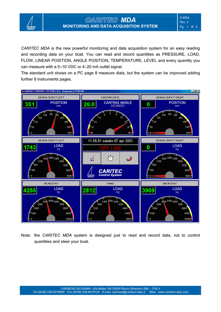 CARITEC MDA MONITORING AND DATA ACQUISITION SYSTEM S-MDA Rev. 2 Pg. 1 of 4 CARITEC MDA is the new powerful monitoring and data acquisition system for an easy reading and recording data on your boat. You can read and record quantities as PRESSURE, LOAD, FLOW, LINEAR POSITION, ANGLE POSITION, TEMPERATURE, LEVEL and every quantity you can measure with a 0÷10 VDC or 4÷20 mA outlet signal. The standard unit shows on a PC page 8 measure dials, but the system can be improved adding further 8 instruments pages. Note: the CARITEC MDA system is designed just to read and record data, not to control quantities and steer your boat. CARIBONI GIOVANNI –Via Mattei 3/A 20050 Ronco Briantino (MI) – ITALY Tel (0039) 039.6079609 Fax (0039) 039.6079128 E-mail: [email protected] Web: www.cariboni-italy.com CARITEC MDA MONITORING AND DATA ACQUISITION SYSTEM S-MDA Rev. 2 Pg. 2 of 4 SOFTWARE On a PC page you can simultaneously read 8 mesurements with both analogic and digital visualization. You can quickly and easily set for each instrument: - Name - Measure unit - Signal end of scale Instrument end of scale Alarm and prealarm limit (visual and sound alarms) Type of signal (Tension or Current) Also the data sampling frequency can be set, and the software saves automatically a daily file in chronological order. The recorded data are stored in a .xls format table for further elaboration. The data and alarm setting are protected by password. CARITEC MDA system requirements: Windows 95/98/2000 or NT. The system is available also with a touch screen control. CARIBONI GIOVANNI –Via Mattei 3/A 20050 Ronco Briantino (MI) – ITALY Tel (0039) 039.6079609 Fax (0039) 039.6079128 E-mail: [email protected] Web: www.cariboni-italy.com CARITEC MDA MONITORING AND DATA ACQUISITION SYSTEM S-MDA Rev. 2 Pg. 3 of 4 CARIBONI GIOVANNI –Via Mattei 3/A 20050 Ronco Briantino (MI) – ITALY Tel (0039) 039.6079609 Fax (0039) 039.6079128 E-mail: [email protected] Web: www.cariboni-italy.com CARITEC MDA S-MDA Rev. 2 MONITORING AND DATA ACQUISITION SYSTEM HARDWARE The interface unit is composed by the 8 analogical data inlet modules and the converter module RS485/RS232. The master unit is complete with a 16 poles connection for transducers, a serial cable for PC connection and a power supply connection. Each auxiliary unit can be connected directly to the master unit or to another auxiliary unit. Pg. 4 of 4 Interface master unit box (0.9 kg) Power supply 10÷30VDC. You can acquire both 0÷10 VDC and 4÷20 mA signals. Auxiliary unit box for each further 8 instruments module (0.4 kg) MASTER BOX UNIT Auxiliary boxes connection 8 analogic signals Serial port PC connection Supply led Supply connection Magnetotermic security reset CARIBONI GIOVANNI –Via Mattei 3/A 20050 Ronco Briantino (MI) – ITALY Tel (0039) 039.6079609 Fax (0039) 039.6079128 E-mail: [email protected] Web: www.cariboni-italy.com