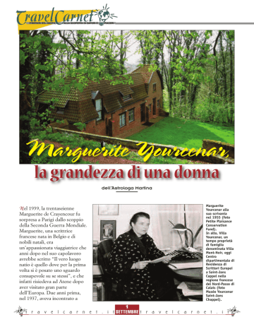 Marguerite Yourcenar, la grandezza di una donna dell'Astrologa Martina Nel 1939, la trentaseienne Marguerite de Crayencour fu sorpresa a Parigi dallo scoppio della Seconda Guerra Mondiale. Marguerite, una scrittrice francese nata in Belgio e di nobili natali, era un’appassionata viaggiatrice che anni dopo nel suo capolavoro avrebbe scritto “Il vero luogo natio è quello dove per la prima volta si è posato uno sguardo consapevole su se stessi”, e che infatti risiedeva ad Atene dopo aver visitato gran parte dell’Europa. Due anni prima, nel 1937, aveva incontrato a Marguerite Yourcenar alla sua scrivania nel 1955 (foto Petite Plaisance Conservation Fund). In alto, Villa Yourcenar, un tempo proprietà di famiglia denominata Villa Mont-Noir, oggi Centro dipartimentale di Residenza di Scrittori Europei a Saint-Jans Cappel nella regione francese del Nord-Passo di Calais (foto Musée Yourcenar Saint-Jans Chappel). 1 t r a v e l c a r n e t . i t SETTEMBRE t r a v e l c a r n e t . i t Ma rgueri te Your cena r, la gra nd ez za d i una d onna Londra Virginia Woolf, e ne aveva tradotto in francese il romanzo Le onde, ma aveva già pubblicato due romanzi brevi, Alexis e Il colpo di grazia, che avevano attirato l’attenzione dei critici per le loro qualità letterarie e per la capacità di rappresentare con grande acutezza personaggi inconsueti. La scrittrice continuò a viaggiare, e le sue esperienze di viaggio si riflettevano nelle Novelle orientali pubblicate nel 1938. La guerra, però, colse Marguerite alla sprovvista: non poteva tornare in Grecia, e disponeva di mezzi modesti. Accolse la proposta dell’amica Grace Frick, vivace e intraprendente professoressa d’inglese di Kansas City conosciuta a Parigi, di accettare per qualche mese la sua ospitalità in America, dove poi si stabilì definitivamente, fino a prendere la cittadinanza statunitense. Insegnava letteratura francese, ma continuava a scrivere, e nel 1951 In alto, il Sentiero dei Giacinti, luogo d'infanzia di Marguerite a Saint-Jans Cappel Musée Yourcenar Saint-Jans Chappel). pubblicò Memorie di Adriano, il (foto Sopra, la Casa-Museo Yourcenar Le Petite Plaisance a Northeast Harbour nel Maine, romanzo che la rese celebre con residenza della scrittrice dal 1950 al 1987 (foto Bernard Guay/Petite Plaisance Conservation Fund). lo pseudonimo che da ragazza aveva scelto insieme al padre, anagrammando il loro cognome: con sé in molti dei suoi emozioni e sentimenti dal punto Marguerite Yourcenar. frequenti viaggi anziché farle di vista di un’adolescente colta e frequentare le scuole ordinarie. appartenente a un ambiente Nata l’8 giugno 1903 a Bruxelles Da lui Marguerite apprese il internazionale ed informale. da una madre morta poco dopo latino e insieme a lui visitò, tra Scrisse versi giovanili, ma la sua il parto, Marguerite fu allevata gli altri luoghi, l’Italia e quella prima opera significativa è dalla nonna paterna e dal padre Villa Adriana a Tivoli che Alexis del 1929, che il padre Michel Cleenewerck de sarebbe stata l’ispirazione per la fece in tempo a veder Crayencour, un uomo sua opera maggiore. Dotata di pubblicato prima di morire cosmopolita e anticonformista, una raffinata capacità di nello stesso anno. Rimasta sola, Marguerite che si assunse il compito della osservazione psicologica, negli continuò a viaggiare, sua educazione conducendola anni trascorsi col padre studiò 2 t r a v e l c a r n e t . i t SETTEMBRE t r a v e l c a r n e t . i t In alto, da sinistra verso destra, Alexis, romanzo d'esordio di Marguerite Yourcenar, Feltrinelli 1989; Il colpo di grazia, romanzo scritto nel 1938 tra Capri e Sorrento, Feltrinelli 1990; Memorie di Adriano, capolavoro scritto in forma epistolare pubblicato per la prima volta nel 1951, Feltrinelli 2014. A sinistra, l'audiolibro di L'opera al nero letto da Maddalena Crippa, Emons Feltrinelli 2011. Accanto, la versione cinematografica di L'opera al nero firmata da André Delvaux nel 1988, Gian Maria Volonté nel ruolo di Zenone Ligre, dvd Dolmen Video. alimentando la sua passione per le letture e la cultura, fino al trasferimento negli Stati Uniti e al sodalizio, durato quarant’anni, con la Frick, la persona che fu a lei più vicina nonché unica traduttrice dei suoi lavori in lingua inglese. Estremamente accurata e rigorosa nello scrivere, nel suo capolavoro seppe dipingere un ritratto credibile e affascinante del grande imperatore Adriano, colto alla fine della sua vita, ottenendone un’opera insieme dotta e apprezzata dal grande pubblico, che le valse la fama e il grande privilegio di essere la prima donna ammessa all’Académie Française. Rimase comunque sempre residente negli Stati Uniti, dove morì nel 1987, dopo essersi dedicata negli ultimi anni a scrivere opere autobiografiche e saggistiche. La sua passione per il classicismo, l’umanesimo e la perfezione stilistica, associato a un’enorme cultura e all’interesse per l’Oriente e per discipline come la filosofia, la storia, l’arte, ne fanno un’attrice raffinata e inconfondibile. Marguerite Yourcenar è sepolta in un villaggio della Mount Desert Island, nel Maine, dove visse i primi anni della sua permanenza americana con Grace Frick; sulla sua tomba è riportata una frase tratta dall’ultimo suo grande romanzo, L’opera al nero del 1968, 3 t r a v e l c a r n e t . i t SETTEMBRE t r a v e l c a r n e t . i t Mar gue r ite Your cena r , la gra nd ez za d i una d onna A sinistra, Gemelli, segno zodiacale di nascita di Marguerite Yourcenar. A destra, Leone, segno zodiacale ascendente di Yourcenar. centrato sulla figura di un alchimista rinascimentale di vasta ed eterogenea cultura le cui parole accompagnano l’ultimo viaggio della grande scrittrice: “Piaccia a Colui che forse è di adeguare il cuore umano alla dimensione di tutta la vita”. Ed è entro la dimensione della riservatezza dettata dal temperamento di chi rifiuta le convenzioni, e dell’amore sconfinato per la conoscenza e la cul