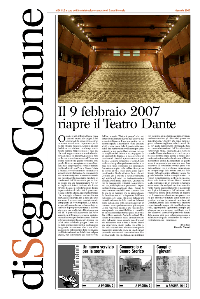 Gennaio 2007 Il 9 febbraio 2007 riapre il Teatro Dante rmai è realtà: il Teatro Dante riapre i battenti e torna alle origini. La riapertura della ormai storica struttura è un avvenimento importante per la nostra città ma non solo. Le mura di quell’edificio racchiudono una lunga storia, hanno sempre rappresentato e, oggi più che mai, rappresentano un trait d’union fondamentale fra presente, passato e futuro. La ristrutturazione stessa del Dante sintetizza molto bene questa continuità temporale: l’interno, completamente cambiato sulla base del progetto di restauro firmato dagli architetti Ugo Perut e Firouz Galdo, è proiettato verso il futuro, funzionale e versatile mentre la facciata ha conservato la sua struttura originaria a testimonianza del suo passato, della sua origine che dalla seconda metà dell’Ottocento in poi ha fatto da sfondo alla vita dei campigiani. Nel corso degli anni, infatti, insieme alla Rocca Strozzi, il Dante è considerato uno dei più importanti simboli della città. E questo non si deve soltanto alla sua imponente struttura che campeggia nel centro storico di fronte al Palazzo comunale, ma al fatto che questo teatro è sempre stato considerato dai campigiani di loro proprietà. Lo hanno sempre difeso con forza e ne hanno fatto un simbolo di progresso per tutta la collettività e non per pochi eletti. Il teatro nacque nel 1873 grazie all’Accademia dei Perseveranti cui il Comune concesse gratuitamente il terreno per l’edificazione. Fra i soci fondatori spicca il nome di Giovanni Rucellai, unico nobile del gruppo: il resto erano tutti nomi appartenenti a quella nuova borghesia ottocentesca che stava affacciandosi sul palcoscenico della storia, contraddistinta da un’incrollabile fede nel progresso, ben sintetizzata dal motto scelto O all’interno diSegnoComune MENSILE a cura dell’Amministrazione comunale di Campi Bisenzio dall’Accademia, “Volere è potere”, che sottintendeva illimitata fiducia nell’uomo e nella sua intelligenza. E questo spirito che ha contrassegnato la nascita del teatro dedicato al più grande poeta della letteratura italiana, non è mai venuto meno ed ha sempre caratterizzato la sua storia. Basti pensare che, dopo lunghi anni di chiusura, accompagnati da un inesorabile degrado, è stato proprio un comitato di cittadini a presentare una petizione al Comune per riaprire il teatro. Segno evidente che quello spirito combattivo e tenace non è mai scomparso nei campigiani. Era soltanto sopito nelle nebbie di un periodo storico in cui il teatro aveva perso la propria identità. Quella richiesta fu accolta dal Comune che è riuscito a riportare il teatro agli antichi splendori con la ristrutturazione completa dell’intero immobile. Una tenacia che ha accomunato cittadini e amministratori che, nelle legislature precedenti - in particolare il sindaco Adriano Chini - hanno dimostrato una sensibilità non comune, dando vita ad un percorso che sta già producendo frutti importanti. La riapertura del Dante è al passo con i tempi e la si può definire una sintesi fondamentale della crescita e dello sviluppo della nostra città che si inserisce in un contesto metropolitano molto più ampio. Con la riapertura di quello che fu considerato un piccolo tempio della lirica si consolida un’interazione importante: quella fra i cittadini e il loro territorio. Anche la scelta di Alessandro Benvenuti nel ruolo di direttore artistico del teatro non è casuale ma è frutto di una riflessione tesa a dare al Teatro Dante una dimensione di alto livello, che abbia radici nella toscanità ma allo stesso tempo abbia respiro nazionale grazie ad una figura di spicco del teatro e del cinema italiano. Una scelta, quindi, che è perfettamente i sintonia Un nuovo servizio per la storia A PAGINA 2 con lo spirito di modernità ed intraprendenza che caratterizza gli obiettivi di questa amministrazione. Obiettivi che sono stati raggiunti nel corso degli anni, ed è il caso di dirlo, con quella perseveranza e tenacia che hanno contraddistinto i soci dell’Accademia dei Perseveranti prima, e i cittadini, poi. Sono sicura che Alessandro Benvenuti con il suo prezioso contributo saprà gestire al meglio questo incarico riuscendo a far rivivere al Dante momenti di gloria. La riapertura di questo teatro è un passo importante ma non deve oscurare o far scivolare in secondo piano le attività culturali che si svolgono, ormai da anni, in ogni luogo della nostra città, dal PoliSpazio di San Donnino al Teatro Cesare Rugi del Gorinello. Inoltre sono già iniziati i lavori di ristrutturazione dell’ex cinema moderno nella frazione di Santa Maria. Una realtà che si inserisce in un contesto fortemente urbanizzato che svolgerà una funzione rilevante. Anche questo intervento si inserisce in una logica del recupero dell’esistente, indispensabile al fine di mantenere un legame con il passato ma allo stesso tempo necessaria per affrontare il futuro con i mezzi adeguati per andare incontro ai cambiamenti. Un futuro, quello della nostra città, che si sta concretizzando sempre più, tassello dopo tassello, aggiungendo opportunità sempre più adeguate per uno sviluppo equilibrato con il fine ultimo di costruire il puzzle del futuro della nostra città non tralasciando niente e nel rispetto di quella tenacia che, da sempre, contraddistingue i campigiani. Commercio e Centro Storico A PAGINA 3 il Sindaco Fiorella Alunni Campi e i giovani A PAGINA 16-17 2 diSegnoComune Gennaio 2007 Il Centro di Documentazione Storica diSegnoComune Mensile a cura dell’Amministrazione comunale di Campi Bisenzio registrazione Tribunale di Firenze n. 2605 del 29/9/1977 direttore Fiorella Alunni direttore responsabile Marcello Bucci redazione Alberto Fiorini David Innocenti Rossella Zara. A questo numero hanno collaborato Selene Ballerini Andrea Bianchini Brunella Bresci Nadia Canepa Circolo Culturale Larocca Maria Teresa Fallah Alessandro Fedeli Emiliano Fossi Gruppo Avventura Trekking Samanta