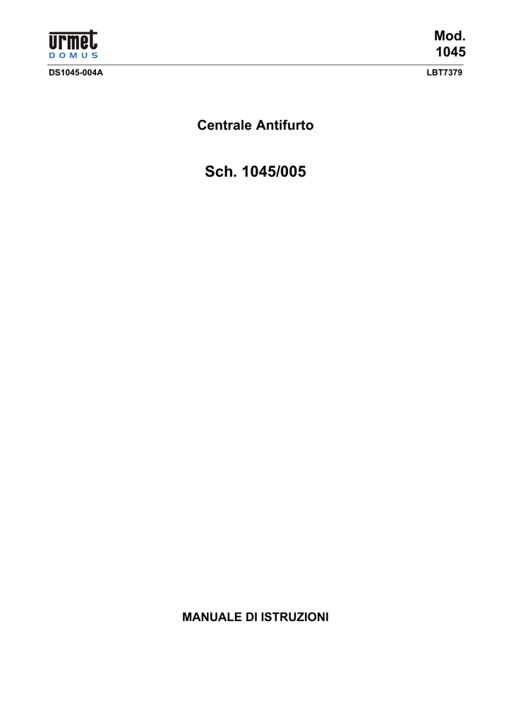 Mod. 1045 DS1045-004A LBT7379 Centrale Antifurto Sch. 1045/005 MANUALE DI ISTRUZIONI DS1045-004A 2 LBT7379 INDICE 1 2 3 4 5 6 7 8 9 10 11 DESCRIZIONE ......................................................................................................................................... 4 INSTALLAZIONE...................................................................................................................................... 5 CABLAGGI ............................................................................................................................................... 5 3.1 Collegamento inseritori 1045/030 – 1045/031 e tastiere 1045/025 ............................................. 6 DESCRIZIONE MORSETTIERE .............................................................................................................. 6 MESSA IN SERVIZIO DELLA CENTRALE.............................................................................................. 7 MESSA IN SERVIZIO DEGLI INSERITORI ............................................................................................. 8 UTILIZZO DELLA CENTRALE ................................................................................................................. 8 7.1 Segnalazione dei rivelatori in allarme .......................................................................................... 9 7.2 Segnalazione degli allarmi memorizzati....................................................................................... 9 7.3 Procedure di attivazione e disattivazione della centrale tramite chiave meccanica .................... 9 7.4 Programmazione delle chiavi elettroniche ................................................................................... 9 7.5 Procedure di attivazione e disattivazione della centrale tramite chiave elettronica................... 10 7.6 Parzializzazioni di impianto ........................................................................................................ 11 7.7 Procedura di esclusione delle linee ........................................................................................... 12 7.8 Segnalazioni di assenza rete e batteria scarica ........................................................................ 12 7.9 Uso del buzzer di segnalazione (opzionale) .............................................................................. 12 7.10 Aggiunta, sostituzione e cancellazione delle chiavi elettroniche ............................................... 13 RICERCA GUASTI E ANOMALIE .......................................................................................................... 13 SCHEMA TIPICO DI IMPIANTO ............................................................................................................ 14 CARATTERISTICHE GENERALI........................................................................................................... 15 CARATTERISTICHE TECNICHE .......................................................................................................... 15 DS1045-004A 3 LBT7379 1 DESCRIZIONE Centrale 1045/005 1. 2. 3. 4. 5. 6. 7. 8. 9. 10. 11. 12. 13. 14. 15. 16. Morsettiera per alimentazione di rete con fusibile di protezione (T200 mA, 250 V) Trasformatore alimentazione di rete Morsetti di collegamento contatti chiave meccanica Led di segnalazione di programmazione in corso Micro-interruttori programmazione tempi ingresso, allarme e associazione zone Tamper di protezione apertura contenitore Fusibile protezione alimentazione rivelatori (F2: F1 A, 250 V) Fusibile protezione alimentazione attuatore d’allarme esterno (F1: F1 A, 250 V) Morsettiere per ingressi e uscite Connettori faston per batteria tampone Vano batteria 12V - 6,5 Ah Fusibile protezione batteria interna (T1,25 A, 250 V) Pannello per le segnalazioni utente Serratura per chiave meccanica Vano per buzzer di segnalazione (opzionale: cod. URMET 9854/52) Passaggio per cavo rete (non fornito) Fig. 1 Inseritore elettronico 1045/030 o 1045/031 2 3 4 1. 2. 3. 4. Vano per inserimento chiave elettronica Led verde: stato zona VERDE Led giallo: stato zona GIALLA Led rosso: stato zona ROSSA 1 Fig. 2 DS1045-004A 4 LBT7379 2 INSTALLAZIONE La centrale 1045/005 va installata in un luogo protetto dal sistema di allarme; inoltre occorre prevedere che il luogo scelto sia sufficientemente areato, al riparo della luce diretta del sole e con basso tasso di umidità. Nel caso si preveda l’uso di inseritori remoti a chiave elettronica, si consiglia di installarla in un luogo non facilmente accessibile. Per l’alimentazione di rete si raccomanda di prevedere un circuito indipendente e separato dalle altre linee (illuminazione, prese, etc.) opportunamente protetto da interruttore magnetotermico bipolare. La posa cavi può essere eseguita sia in canaline per esterno che in tubi sotto intonaco (installazione sotto traccia); è evidente che la seconda soluzione garantisce una sicurezza estremamente più elevata. Rimuovere il coperchio frontale effettuando le seguenti operazioni: estrarre lo sportellino centrale servendosi di un piccolo cacciavite, svitare la vite posizionata sotto lo sportellino e sollevare il coperchio dal basso; tenere il coperchio a portata di mano perché sul suo lato interno riporta, su un’etichetta adesiva, delle utili informazioni per l’installazione e la messa in servizio della centrale. Prima di ancorare la centrale alla parete occorre stabilire dove prevedere il passaggio cavi; sul fondo è previsto un largo vano per le installazioni dei cavi sotto traccia. Per le installazioni dei cavi sotto canalina sono predisposti 4 vani pretranciati: uno sulla parete superiore, uno sulla parete inferiore e due sulle pareti laterali. Sfondare il vano che si desidera utilizzare. Fissare il contenitore di fondo al muro con 3 tasselli utilizzando i fori predisposti. Se sono stati previsti degli inseritori per chiave elettronica, prevederne l’installazione in luoghi facilmente acc