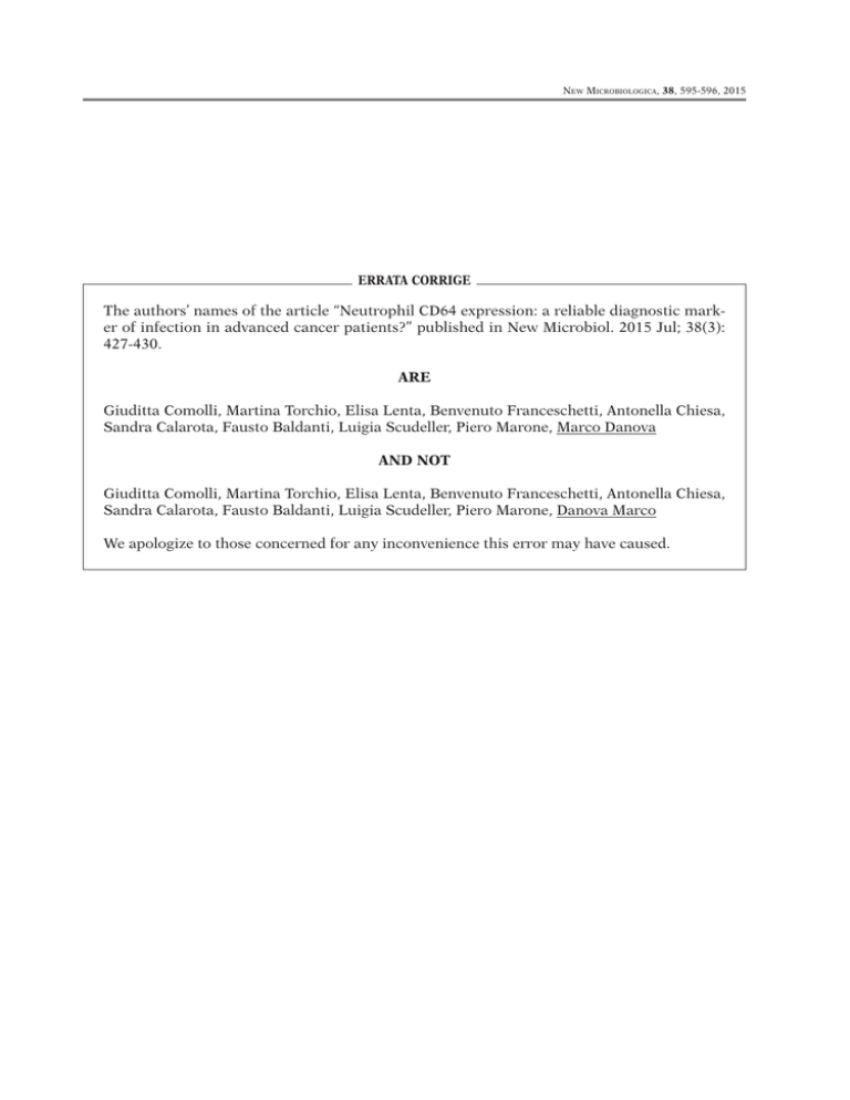 New Microbiologica, 38, 595-596, 2015 errata corrige The authors’ names of the article “Neutrophil CD64 expression: a reliable diagnostic marker of infection in advanced cancer patients?” published in New Microbiol. 2015 Jul; 38(3): 427-430. ARE Giuditta Comolli, Martina Torchio, Elisa Lenta, Benvenuto Franceschetti, Antonella Chiesa, Sandra Calarota, Fausto Baldanti, Luigia Scudeller, Piero Marone, Marco Danova AND NOT Giuditta Comolli, Martina Torchio, Elisa Lenta, Benvenuto Franceschetti, Antonella Chiesa, Sandra Calarota, Fausto Baldanti, Luigia Scudeller, Piero Marone, Danova Marco We apologize to those concerned for any inconvenience this error may have caused.