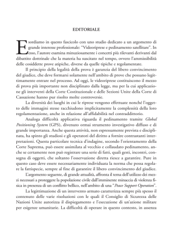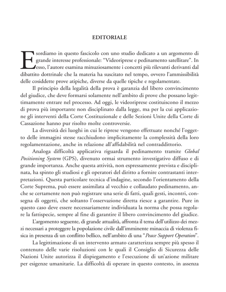 EDITORIALE E sordiamo in questo fascicolo con uno studio dedicato a un argomento di grande interesse professionale: “Videoriprese e pedinamento satellitare”. In esso, l'autore esamina minuziosamente i concetti più rilevanti derivanti dal dibattito dottrinale che la materia ha suscitato nel tempo, ovvero l’ammissibilità delle cosiddette prove atipiche, diverse da quelle tipiche e regolamentate. Il principio della legalità della prova è garanzia del libero convincimento del giudice, che deve formarsi solamente nell’ambito di prove che possano legittimamente entrare nel processo. Ad oggi, le videoriprese costituiscono il mezzo di prova più importante non disciplinato dalla legge, ma per la cui applicazione gli interventi della Corte Costituzionale e delle Sezioni Unite della Corte di Cassazione hanno pur risolto molte controversie. La diversità dei luoghi in cui le riprese vengono effettuate nonché l’oggetto delle immagini stesse racchiudono implicitamente la complessità della loro regolamentazione, anche in relazione all’affidabilità nel contraddittorio. Analoga difficoltà applicativa riguarda il pedinamento tramite Global Positioning System (GPS), divenuto ormai strumento investigativo diffuso e di grande importanza. Anche questa attività, non espressamente prevista e disciplinata, ha spinto gli studiosi e gli operatori del diritto a fornire contrastanti interpretazioni. Questa particolare tecnica d’indagine, secondo l’orientamento della Corte Suprema, può essere assimilata al vecchio e collaudato pedinamento, anche se certamente non può registrare una serie di fatti, quali gesti, incontri, consegna di oggetti, che soltanto l’osservazione diretta riesce a garantire. Pure in questo caso deve essere necessariamente individuata la norma che possa regolare la fattispecie, sempre al fine di garantire il libero convincimento del giudice. L’argomento seguente, di grande attualità, affronta il tema dell’utilizzo dei mezzi necessari a proteggere la popolazione civile dall’imminente minaccia di violenza fisica in presenza di un conflitto bellico, nell’ambito di una “Peace Support Operation”. La legittimazione di un intervento armato caratterizza sempre più spesso il contenuto delle varie risoluzioni con le quali il Consiglio di Sicurezza delle Nazioni Unite autorizza il dispiegamento e l’esecuzione di un’azione militare per esigenze umanitarie. La difficoltà di operare in questo contesto, in assenza di precise linee guida che possano orientare le operazioni, rende complessa la verifica dei principi consuetudinari della necessità e della proporzionalità dell’uso della forza. Tragedie come quelle del Ruanda e dei Balcani negli anni Novanta hanno dimostrato che non sussistevano altre opzioni che quella militare per neutralizzarle o limitarne la portata. Disimpegnarsi ed evitare responsabilità personali, con grave nocumento per la prosecuzione della missione in un determinato contesto internazionale, appaiono ancora l’ostacolo maggiore al raggiungimento dell’obiettivo benefico. Prima dell’intervento è necessario, quindi, tentare di risolvere la crisi con tutti gli altri mezzi diplomatici, politici e economici di cui la comunità internazionale dispone. Concludiamo con il “phishing”, ovvero quella pratica illecita che, sfruttando tecniche di social engineering finalizzate ad acquisire informazioni su indicazioni personali, abitudini, stili di vita, consiste nel furto di dati riservati per l’accesso a servizi bancari e finanziari ai fini del loro successivo indebito utilizzo, assumendosi on-line l’identità del legittimo titolare. Il phishing, riconosciuto ormai come una concreta minaccia criminale, ha rivelato l’esistenza di “strutture delinquenziali consortili” a carattere internazionale, gestrici di un vero e proprio mercato delle credenziali di autenticazione di migliaia di utenti. Con questo numero si conclude il periodo da me trascorso quale Direttore responsabile della Rassegna, che si è rilevato sicuramente come un’esperienza avvincente e stimolante, foriera di ulteriore arricchimento del mio patrimonio professionale. La nostra Rivista, unanimemente riconosciuta quale consolidato strumento e punto di riferimento per coloro che intendano approfondire temi di carattere militare, giuridico e tecnico-professionale, continuerà ad essere, soprattutto per la Scuola Ufficiali, palestra di formazione per i futuri Comandanti, luogo di incontro con la realtà istituzionale per dibattere e confrontarsi sul piano culturale, alla ricerca di equilibrate sintesi tra esperienze pratiche ed elaborazioni dottrinali. Un grato ringraziamento a tutti i nostri collaboratori per i loro autorevoli apporti di pensiero e ai nostri lettori ed estimatori per la loro continua vicinanza e attenzione. Saluto riconoscente tutti i miei autorevoli predecessori, sempre prodighi di consigli, e auguro ogni migliore successo al Gen. Luigi Robusto, collega e amico di lunga data, che mi sostituirà nell’incarico. Gen. D. Giovanni Nistri dell’Arma dei Carabinieri SOMMARIO n. 4 Rassegna ottobre - dicembre 2013 STUDI LEGISLAZIONE E GIURISPRUDENZA Videoriprese e pedinamento satellitare, Giustizia Militare Sergio Bovio 5 Linee Guida per la valutazione della liceità del ricorso all’uso della forza nell’ambito di una Peace Support Operation (PSO), John Napolitano Vita della Scuola INFORMAZIONI 65 E SEGNALAZIONI Attualità e commenti Il phishing: dall’illecita captazione di dati alla truffa, 41 51 Vincenzo di Lembo 67 Libri 72 Riviste 73 Indice generale anno 2013 78 3 VIDEORIPRESE E PEDINAMENTO SATELLITARE Sergio BOVIO Capitano Ufficio Storico - Capo 1ª Sezione Studi Comando Generale dell’Arma dei Carabinieri SOMMARIO: 1. Le prove atipiche nella disciplina del codice. - 2. Le videoriprese. - 3. Il pedinamento satellitare tramite gps. - 4. Conclusioni. 1. Le prove atipiche nella disciplina del codice Un ampio dibattito dottrinale aveva interessato, vige