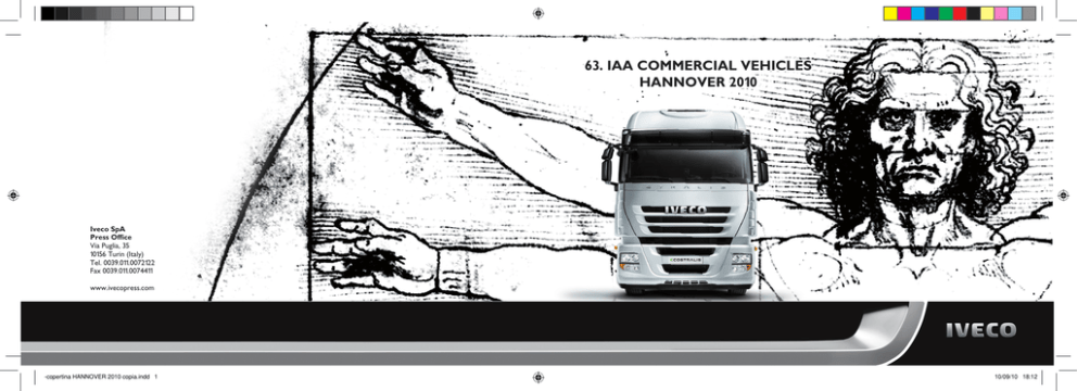 63. IAA COMMERCIAL VEHICLES HANNOVER 2010 Iveco SpA Press Office Via Puglia, 35 10156 Turin (Italy) Tel. 0039.011.0072122 Fax 0039.011.0074411 www.ivecopress.com -copertina HANNOVER 2010 copia.indd 1 10/09/10 18:12 Iveco al Motor Show IAA 2010 di Hannover Driving Innovation to Reality 2 IVECO AL SALONE 5 LE NOVITà DI IVECO 11 LA GAMMA IVECO 31 61 IL VALORE PER IL CLIENTE 66 PHOTO GALLERY Driving Innovation to Reality Iveco partecipa al Salone di Hannover 2010 con un numero significativo di prodotti, servizi e tecnologie innovative. L’idea che caratterizza la presenza dell’azienda al salone è “Driving Innovation to Reality” ovvero “trasformare l’innovazione in realtà”. Nel corso degli ultimi anni, Iveco ha infatti reso disponibili sul mercato alcune delle sue più importanti innovazioni tecnologiche, in particolare nel settore delle trazioni alternative. Tali soluzioni innovative erano state presentate in occasione del Salone IAA di Hannover 2008, in cui l’azienda, attraverso il motto “Moving Change”, aveva posto l’accento sull’importanza dell’innovazione quale elemento di rinnovamento e miglioramento del mondo del trasporto. L’orizzonte temporale di riferimento era quello del medio/lungo periodo e alcune delle soluzioni tecnologiche presentate avevano caratteristiche prototipali. La crisi economica del 2009, la più profonda nel settore dei veicoli commerciali, ha condizionato le aziende auto2 | 3 motive, imponendo piani di ristrutturazione e riorganizzazione dei progetti e investimenti in ricerca e sviluppo. In questo contesto, Iveco ha deciso di concentrare le proprie risorse sulle priorità e di lavorare per rendere disponibili a tutti i clienti alcune delle tecnologie innovative sviluppate negli ultimi anni. Il risultato di questo impegno è la realizzazione di prodotti con un forte contenuto tecnologico a prezzi accessibili, garantendo nel contempo affidabilità, elevate prestazioni, tecnologia d’eccellenza e un rapporto costi-benefici di indubbio vantaggio. all’ambiente: i due principali elementi che hanno ispirato l’azienda in questi anni. Le innumerevoli innovazioni tecnologiche, dai sistemi di trazione ibridi in serie a quelli in parallelo, dai motori a metano a quelli elettrici, si sono oggi trasformate in veicoli disponibili e accessibili ai nostri clienti. Tutti questi sono stati sviluppati con il loro coinvolgimento diretto, per poter indirizzare al meglio le specifiche esigenze di missione e di utilizzo. Si tratta di progetti e prodotti sostenibili, in grado di coniugare bassi costi d’esercizio e attenzione L’azienda sta lavorando concretamente per poter riuscire nel proprio intento: trasformare l’innovazione in realtà a prezzi accessibili. Iveco presenta quindi al Salone importanti soluzioni innovative oggi utilizzate sul campo dai nostri clienti e centrate su alcune specifiche esigenze di missione. Quei veicoli elettrici o ibridi che nel 2008 erano delle proposte innovative e futuribili si sono trasformate in veicoli che vestono le livree dei nostri clienti e che sono da questi utilizzati e testati ogni giorno nelle più diverse condizioni di impiego. 4 | 5 IVECO AL SALONE Lo stand di Iveco al Salone di Hannover 2010, di oltre 2700 mq, si ispira al grande genio italiano Leonardo da Vinci, scienziato, inventore, artista e scultore. Alcuni dei suoi disegni più famosi sono riprodotti fedelmente su tutta l’area espositiva e rappresentano l’origine di alcune delle sue più importanti invenzioni, molte delle quali sono state poi realizzate in epoca moderna. Al centro dello stand è raffigurato l’Uomo di Vitruvio, disegno con cui Leonardo vuole mostrare l’armoniosa perfezione del corpo umano, perfettamente inscritto nelle due forme geometriche regolari per eccellenza: il cerchio ed il quadrato. La centralità dell’uomo è la metafora che descrive compiutamente il parallelismo con la strategia Iveco, che da sempre pone l’uomo, ovvero il cliente, al centro di tutta la propria attività: dalla progettazione del prodotto alla commercializzazione, dall’assistenza alla definizione di specifici servizi finanziari. Sulle pareti dello stand sono raffigurate alcune delle macchine che Leonardo aveva concepito e realizzato in forma sperimentale, come la bicicletta e il deltaplano. La sintesi del lavoro di Leonardo è stata infatti quella di riuscire a unire lo slancio creativo alla possibilità di trasformare in realtà concrete e disponibili le proprie invenzioni ed in quest’ottica si inscrive l’idea che ispira sia la forma sia i contenuti dello stand di Iveco ad Hannover: “Driving Innovation to Reality”. L’area espositiva, in cui sono presenti alcuni dei veicoli più rappresentativi delle diverse gamme di prodotto, è suddivisa in tre sezioni che interpretano le principali missioni dei nostri clienti: urbana, media-lunga distanza e off-road. Nella prima sezione si trovano i veicoli destinati all’utilizzo nelle aree urbane, sia per il trasporto delle persone che delle merci. Sono qui esposti quattro Daily in diverse versioni, tra le quali un furgone elettrico a zero emissioni, in grado di circolare liberamente nei centri storici. Iveco al Salone Una novità assoluta riguarda la disponibilità su tutti gli ECODAILY con motore Diesel del sistema integrato Blue&Me e Tom Tom, nato dalla collaborazione tra la piattaforma Microsoft - Fiat Group di infotainment ed il più famoso sistema di navigazione satellitare, che offre un maggiore comfort di utilizzo ed un’accurata capacità di pianificazione del percorso. Completa la sezione un Citelis ibrido, autobus di 12 metri che utilizza un sistema di trazione ibrido in serie Dieselelettrico in grado di abbattere le emissioni fino al 30%. Nella seconda sezione sono esposti i prodotti per il trasporto stradale su media e lunga distanza. L’Eurocargo ibrido, con propulsione ibrida parallela Diesel-elettrica, rappresenta il miglior punto di equilibrio tra le esigenze di trasporto (c