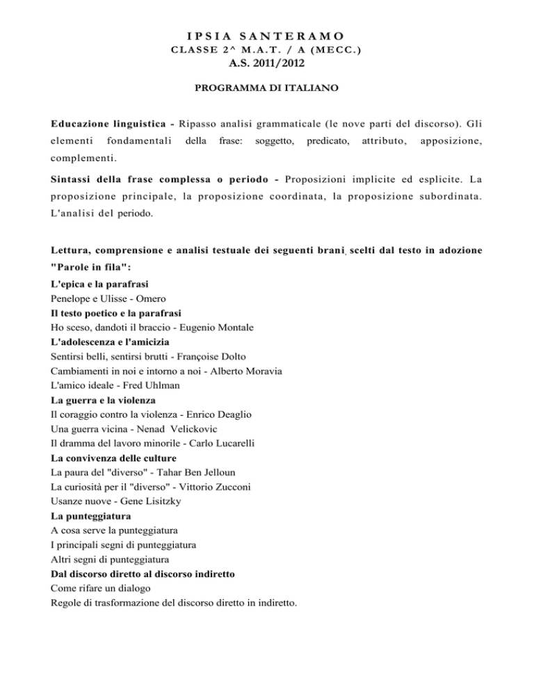 IPSIA SANTERAMO CLASSE 2^ M.A.T. / A (MECC.) A.S. 2011/2012 PROGRAMMA DI ITALIANO Educazione linguistica - Ripasso analisi grammaticale (le nove parti del discorso). Gli elementi fondamentali della frase: soggetto, predicato, attributo, apposizione, complementi. Sintassi della frase complessa o periodo - Proposizioni implicite ed esplicite. La proposizione principale, la proposizione coordinata, la proposizione subordinata. L'analisi del periodo. Lettura, comprensione e analisi testuale dei seguenti brani , scelti dal testo in adozione "Parole in fila": L'epica e la parafrasi Penelope e Ulisse - Omero Il testo poetico e la parafrasi Ho sceso, dandoti il braccio - Eugenio Montale L'adolescenza e l'amicizia Sentirsi belli, sentirsi brutti - Françoise Dolto Cambiamenti in noi e intorno a noi - Alberto Moravia L'amico ideale - Fred Uhlman La guerra e la violenza Il coraggio contro la violenza - Enrico Deaglio Una guerra vicina - Nenad Velickovic Il dramma del lavoro minorile - Carlo Lucarelli La convivenza delle culture La paura del "diverso" - Tahar Ben Jelloun La curiosità per il "diverso" - Vittorio Zucconi Usanze nuove - Gene Lisitzky La punteggiatura A cosa serve la punteggiatura I principali segni di punteggiatura Altri segni di punteggiatura Dal discorso diretto al discorso indiretto Come rifare un dialogo Regole di trasformazione del discorso diretto in indiretto. Il riassunto Che cos'è il riassunto Le fasi di lavoro: lettura e comprensione; scelta e selezione delle informazioni; riscrittura e controllo. Il testo espositivo Caratteristiche strutturali; scelte linguistiche. Il testo argomentativo Caratteristiche strutturali; scelte linguistiche. La lettera La lettera personale; la lettera formale; La email. Il diario Scopo del testo; destinatari; caratteristiche strutturali; scelte linguistiche. Il verbale Scopo del testo; destinatari; caratteristiche strutturali; scelte linguistiche. Il curriculum vitae Scopo del testo; destinatari; caratteristiche strutturali; scelte linguistiche. Modulo interdisciplinare: “Riciclo del materiale per il risparmio energetico” Tecniche di ricerca, raccolta e selezione delle informazioni. Riflessione sui dati, condivisione e elaborazione testi. Il quotidiano in classe Lettura e analisi critica degli articoli di giornale. Santeramo in Colle 29/05/2011 L’insegnante Gli alunni __________________________ __________________________ __________________________