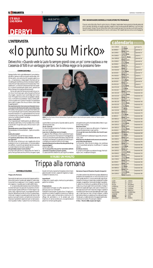 7 DOMENICA 7 NOVEMBRE 2010 C’È SOLO L’AS ROMA PER I BOOKMAKERS BORRIELLO MARCATORE PIÙ PROBABILE Floccari contro Borriello, Rocchi contro Vucinic. All’estero i bookmaker hanno pronta la lista dei potenziali primi marcatori del derby, con quattro giocatori a spartirsi le prime due quote del tabellone. In prima linea i due centravanti: Sergio Floccari e Marco Borriello si fanno avanti per aprire le marcature, entrambi a quota 7, seguiti immediatamente dal duo Rocchi-Vucinic, tutti e due a 7,50. Cassetti decisivo come un anno fa paga 26. DERBY! L’INTERVISTA calendario 2010/2011 «Io punto su Mirko» Delvecchio: «Quando vede la Lazio fa sempre grandi cose, un po’ come capitava a me L’assenza di Totti è un vantaggio per loro. Se la difesa regge ce la possiamo fare» Dom 21/08/10 Sab 28/08/10 Sab 11/09/10 Mer 15/09/10 Dom 19/09/10 Mer 22/09/10 Sab 25/09/10 Mar 28/09/10 Dom 03/10/10 CHIARA ZUCCHELLI Sab 16/10/10 Spiega che Borriello «potrebbe essere l’uomo derby», poi però ci pensa un attimo e quasi cambia idea: «Anche se certo, uno come Vucinic quando vede la Lazio...». E se lo dice lui, c’è da crederci. Perché lui è l’uomo derby per eccellenza, almeno nei tempi moderni, visto che il primato va diviso con Dino Da Costa. Trentasette anni, un titolo di Campione d’Italia nel cassetto, un amore viscerale per questi colori, parlare con Marco Delvecchio è sempre emozionante. Se non altro perché l’emozione la vedi nei suoi occhi che si illuminano ogni volta che parla di Roma e che, magari, racconta i suoi ricordi degli anni romanisti. Prima però l’ex numero 24, ora speaker radiofonico, si concentra sul presente: «Sarà un derby difficile e su questo non ci piove. Pronostici è impossibile farne, però io spero che vinca la Roma. Sono stato troppo banale?». Mar 19/10/10 Dom 24/10/10 Sab 30/10/10 Mer 03/11/10 Dom 07/11/10 Mer 10/11/10 Dom 14/11/10 Dom 21/11/10 Mar 23/11/10 Dom 28/11/10 Dom 05/12/10 No,assolutamente.Così come non è banale ricevere un premio direttamente dalle mani di Da Costa. Mi ha fatto molto piacere, anche perché al Sette Colli l’ho incontrato per la prima volta. Avevo sempre letto le sue dichiarazioni in cui parlava bene di me, ma non ci eravamo mai incrociati. È stato bello conoscere chi, come me, ha fatto sfracelli nei derby. Cosa vi siete detti? L’ho ringraziato per le belle parole, poi abbiamo parlato del più e del meno, mi ha ricordato che lui ha fatto anche altri tre gol alla Lazio, oltre ai nove in campionato. Domanda secca: come finisce il derby? Domanda da un milione di dollari... Spero vinca la Roma. Andrà allo stadio? Sì, certamente. Sarò all’Olimpico a tifare. C’è qualcosa della Roma vista a Basilea che la fa ben sperare? Ho visto un po’ di fortuna in più rispetto alle ultime prestazioni e non mi sembra poco. In Svizzera abbiamo sofferto, ma alla fine gli episodi decisivi sono stati a nostro favore e nel calcio questo conta. Chi potrebbe essere l’uomo derby? Dico Borriello perché è un attaccante che "sente" la porta. Però punterei anche su Mirko che spero ripeta Mer 08/12/10 Dom 12/12/10 Dom 19/12/10 EROI Dino Da Costa e Marco Delvecchio, 21 gol alla Lazio in due. Anche per questo, a loro va l’eterno grazie (Foto Mancini) Gio 06/01/11 Dom 09/01/11 Dom 16/01/11 quanto fatto lo scorso anno. Quando vede la Lazio fa sempre grandi cose. alle spalle tutto quello che è stato detto e fatto in questi due mesi e mezzo. Un po’ come lei. Mancherà Totti. Sì, ma lui è molto più tecnico. Piuttosto, mi preoccupa un po’ la difesa. Per la Lazio è un bene non affrontarlo: il Capitano è sempre fondamentale in ogni partita. Juan non c’è, Burdisso non è al meglio. C’è un gol dei nove che ha fatto che ricord in particolare? Dom 06/02/11 Sono tutti bellissimi (abbassa lo sguardo, emozionato, ndr). Dom 13/02/11 Sì, appunto. Ma c’è Mexes, che è un grandissimo giocatore, quindi anche in formazione rimaneggiata sono sicuro che la Roma potrà fare bene. Devo ammettere però che è davvero un peccato che la Roma arrivi al derby con qualche infortunio di troppo. Quindi la Roma arriva sfavorita alla partita di oggi pomeriggio? Certo (ride, ndr). Se c’è una partita che può far riprendere definitvamente la squadra è proprio questa. Sì, assolutamente. Battere la Lazio significa mettere Molti dicono che Nesta la stia ancora cercando dopo le finte che gli faceva. La finta direi, visto che era la stessa, non cambiava mai. Era piuttosto semplice, ma efficace. Ci cascava sempre. E la Roma vinceva. Sì, proprio come spero succeda anche oggi. Ne ha bisogno, anzi, ne abbiamo bisogno. VI RUBO UN MINUTO Dom 23/01/11 Dom 30/01/11 Mer 02/02/11 Dom 20/02/11 Dom 27/02/11 Dom 06/03/11 Dom 13/03/11 Dom 20/03/11 Dom 03/04/11 Dom 10/04/11 Dom 17/04/11 Trippa alla romana ANTONELLO COLONNA Trippa alla Romana Secondo la tradizione romana la trippa era ed è indiscutibilmente il piatto del sabato e l’odore della sua bollitura segnava il mio risveglio, quando ero ragazzo, in questo giorno della settimana. E’ un secondo piatto sostanzioso che ha sfamato tante famiglie nei periodi di povertà e che forse anche per questo è diffuso in molte regioni italiane. Ogni regione ha poi una preparazione differente, dettata anche da ciò che si trovava disponibile per insaporire questa parte del bovino dal gusto un po’ particolare. La tradizione romana ha reso due ingredienti essenziali per la realizzazione di questa ricetta: il pecorino e la mentuccia. Quest’ultima è una pianta che spesso viene impiegata nei piatti romani, capace di regalare un sapore determinate ed unico. Ingredienti trippa, olio, cipolla, aglio, mentuccia, pomodoro, pecorino romano. Preparazione Lavare bene la trippa: la cuffia, spugnosa, il cordone più duro e il centopelli. Fate bollire anche per un paio d’ore. Si taglia a listarelle e si mette in padella insieme a un battuto d’olio, cipolla, aglio schiacciato e mentuccia. Si affoga nel pomodoro e si fa andare