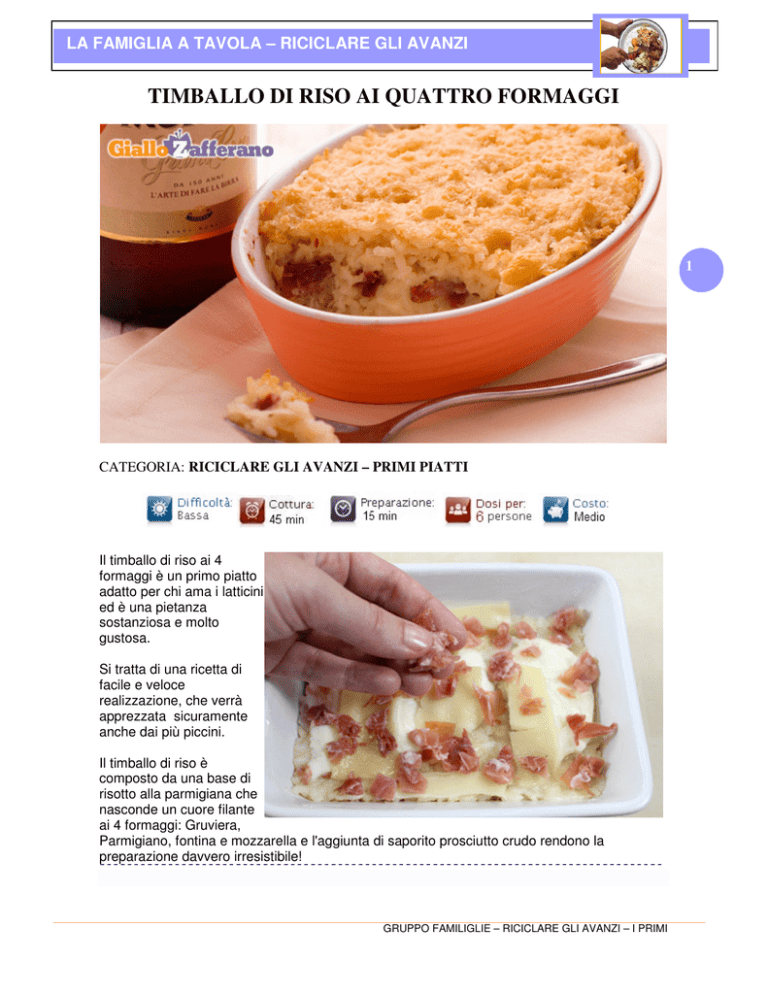 LA FAMIGLIA A TAVOLA – RICICLARE GLI AVANZI TIMBALLO DI RISO AI QUATTRO FORMAGGI 1 CATEGORIA: RICICLARE GLI AVANZI – PRIMI PIATTI Il timballo di riso ai 4 formaggi è un primo piatto adatto per chi ama i latticini ed è una pietanza sostanziosa e molto gustosa. Si tratta di una ricetta di facile e veloce realizzazione, che verrà apprezzata sicuramente anche dai più piccini. Il timballo di riso è composto da una base di risotto alla parmigiana che nasconde un cuore filante ai 4 formaggi: Gruviera, Parmigiano, fontina e mozzarella e l'aggiunta di saporito prosciutto crudo rendono la preparazione davvero irresistibile! GRUPPO FAMILIGLIE – RICICLARE GLI AVANZI – I PRIMI LA FAMIGLIA A TAVOLA – RICICLARE GLI AVANZI Ricette Riso Scopri oltre 50.000 ricette, per Cucinare il Riso come grandi Chef! donnamoderna.com/riso INGREDIENTI FONTINA: 100 gr GROVIERA: 100 gr PARMIGIANO REGGIANO: grattugiato 80 gr PROSCIUTTO: crudo 120 gr NOCE MOSCATA: 1 spolverata PEPE: nero macinato q.b. 2 MOZZARELLA: 2 da 125 gr RISO: carnaroli, 500 gr BURRO: 50 gr SCALOGNO: 1 BRODO: di verdure, 1 lt ■ Preparazione Per preparare il timballo di riso ai 4 formaggi iniziate con la preparazione del risotto: tritate finemente lo scalogno e fatelo imbiondire in 15 gr di burro (1). Aggiungete quindi il riso carnaroli (2), fatelo ben tostare e poi aggiungete un mestolo di brodo che farete sfumare (3). Continuate la cottura del risotto aggiungendo di tanto in tanto un mestolo di brodo. A cottura avvenuta mantecate con 15 gr di burro (4) e 50 gr di parmigiano grattugiato, condite infine con una spolverata di noce moscata e del pepe nero. Tagliate la mozzarella e la fontina a fettine sottili (5). Imburrate una pirofila grande o delle piccole pirofile monoporzione e disponete sul fondo un primo strato di circa 2 cm di risotto (6), GRUPPO FAMILIGLIE – RICICLARE GLI AVANZI – I PRIMI LA FAMIGLIA A TAVOLA – RICICLARE GLI AVANZI che ricoprirete con fettine di mozzarella alternate a fettine di fontina (7), cosparse con il prosciutto crudo ben tritato (8). Fate quindi un altro strato di riso (9) e uno di Gruyere grattugiato (60 gr circa) (10) , e coprite con un altro strato di riso. Irrorate con il rimanente burro fuso (11), spolverizzate con il Gruyere ed il parmigiano rimasti (12), e quindi infornate a 220° per circa 30 minuti, per far fondere i formaggi e lasciare leggermente gratinare la superficie. Quando sarà trascorso il tempo necessario affinché si formi una crosticina dorata, togliete il timballo di riso dal forno e lasciatelo riposare 5-10 minuti; poi preparate le porzioni che disporrete nei singoli piatti da portata, e servite il timballo di riso ai 4 formaggi immediatamente! ■ Consiglio Se volete, potete variare i formaggi a vostro piacimento, o addirittura aggiungerne qualcun altro a quelli già presenti nella ricetta. Se amate i gusti decisi, potete aggiungere del pecorino o comunque del formaggio più saporito (come il taleggio), magari mischiandolo con il Gruyere; date quindi sfogo al vostro gusto o alla vostra fantasia! Al posto del risotto potete utilizzare del riso parboiled bollito e condito con burro, parmigiano, noce moscata e pepe! GRUPPO FAMILIGLIE – RICICLARE GLI AVANZI – I PRIMI 3