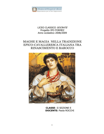 LICEO CLASSICO SOCRATE Progetto IPO FORMEZ Anno scolastico 2008/2009 MAGHE E MAGIA NELLA TRADIZIONE EPICO-CAVALLERESCA ITALIANA TRA RINASCIMENTO E BAROCCO CLASSE: II SEZIONE E DOCENTE: Paola ROCCHI 1 Il modulo didattico, progettato e realizzato all’interno delle attività del Progetto Formez, nasce con l’intento di approfondire un aspetto dello studio dell’immaginario rinascimentalebarocco, coerente con la programmazione didattica del corrente anno scolastico. Nell’ambito della lettura e dello studio della tradizione del poema cavalleresco e delle sue evoluzioni, oggetto d’analisi è stata la definizione dei tratti caratterizzanti e dei ruoli delle maghe (Alcina, Armida e Falsirena rispettivamente nel Furioso di Ariosto, nella Liberata di Tasso e nell’Adone di Marino). Il lavoro di ricerca e approfondimento, scandito in unità tematico-cronologiche, si è sviluppato intorno ad alcune specifiche aree di ricerca (caratterizzazione e individuazione di stereotipi; la sophia delle maghe e la loro funzione nei poemi; il linguaggio e i modelli) ed è confluito nella redazione di un dossier scolastico di ricerca e documentazione corredato da analisi, e iconografia, che ne documenta l’iter. 2 Un salto all’indietro... La strega, figura presente già nell’immaginario antico, conosce nelle epoche successive una duratura e triste fama. Nel lungo periodo medioevale, ad esempio, ma ancora tra Cinque e Seicento, in piena età della Controriforma, le donne accusate di stregoneria furono oggetto di persecuzioni violentissime che spesso culminarono in processi e condanne al rogo. Ma, in realtà, le donne capaci di particolari arti terapeutiche e “magiche” avevano presso le comunità popolari un ruolo riconosciuto, che il potere (sia laico sia religioso) dovette considerare “pericoloso” e quindi da combattere ed estirpare. La stessa fonte di odio contro queste figure oscure era incrementata dal fatto che le presunte streghe costituivano una fonte minacciosa per l’infanzia, facendosi autrici di pratiche abortive e di riti malefici contro i bambini. Ciononostante queste figure hanno continuato a vivere nell’immaginario collettivo grazie al fiorire di materiali vari come racconti popolari, superstizioni locali, mitologia classica, ebraica e nordica, inchieste giudiziarie e verbali di processi. Spesso confusa con la strega, ma in realtà non esattamente sovrapponibile, è l’immagine della 3 maga, che ha caratteri suoi propri e si alimenta di modelli e significati colti e complessi. Tra i suoi archetipi la maga Circe e la figura di Medea, entrambe esperte in filtri e malìe; la maga Morgana, nell’ambito della tradizione arturiana, fino ad arrivare alle maghe protagoniste dei poemi epico-cavallereschi, che nelle età rinascimentale, manierista e infine barocca riportarono in auge l’immagine della donna esperta in magia e dotata di poteri soprannaturali, in genere piegati alla soddisfazione di impulsi erotici e amorosi. L’enorme fortuna di questa figura tra Quattro, Cinque e Seicento è testimoniata dal ricorrere di questo soggetto nella pittura del tempo, che dialoga in modo fitto e significativo con la tradizione letteraria. 4 La Maga Eritto e il Sabba di Streghe nella letteratura latina. Nell’ambito della letteratura latina l’immagine della strega è fissata in particolare in alcuni testi degli scrittori di età augustea Orazio e Virgilio, per poi svilupparsi grazie all’elaborazione letteraria di Lucano nella Pharsalia (VI 452-569) e dell’Apuleio dei Metamorphoseon libri XI (I 719 in particolare). Qui si dà conto della lettura dei testi di Orazio e Lucano, di cui si sono analizzati rispettivamente l’Epodo V, e alcuni versi del VI libro della Pharsalia. Nell’Epodo V Orazio descrive l’incontro di quattro fattucchiere che si apprestano a un tipico rituale di magia nera, il cui scopo era di appropriarsi di un antidoto ricavato da un bambino morto e finalizzato alla preparazione di un filtro d’amore, affinché l’amante della strega Canidia tornasse da lei. Nel VI libro della Pharsalia Lucano narra che l’esercito guidato da Pompeo giunge in Tessaglia, regione nota per gli artifici magici, e lì Sesto Pompeo interpella la più terribile strega di quelle terre, la maga Eritto, preferendola agli oracoli divini, per conoscere prima del tempo l’esito della battaglia che si accingeva a combattere. 5 Tra i due testi abbiamo riscontrato numerose analogie, ma anche qualche differenza. Entrambe le narrazioni si aprono e si svolgono durante la notte, la cui oscurità può essere interpretata come allegoria della figura misteriosa e tetra della strega. Le protagoniste dell’epodo oraziano sono quattro streghe, a differenza di quello di Lucano dove la protagonista è soltanto una. Nonostante Orazio e Lucano non siano contemporanei, la descrizione fisica della strega ricalca il medesimo stereotipo dell’iconografia classica: infatti nel descrivere le loro protagoniste i due autori ce le presentano con sembianze macabre, magre, pallide, con i capelli scompigliati e un aspetto trasandato e terrificante, «con i capelli scarmigliati sul capo intrecciati a corti serpentelli» come scrive Orazio nel descrivere Canidia nei versi 15-16; «ha gli ispidi capelli irsuti come un riccio di mare» sempre Orazio al verso 27. Altro aspetto che accomuna le narrazioni dei poeti, è il metodo con cui le streghe compiono i loro rituali; infatti sia le streghe di Orazio sia quella di Lucano agiscono unicamente di notte e hanno bisogno di ossa umane per realizzare i loro incantesimi: come scrive Orazio nel verso 23 in cui parla di «ossa strappate» e Lucano nei versi 533-534 «trafuga le ceneri fumanti e le 6 ossa ardenti». Inoltre in entrambi i rituali alcune delle vittime prescelte sono i bambini, «perché il fanciullo sotterrato potesse morire alla vista» (Ep. V, vv. 32-34), «un feto da porre sugli altari accesi» (Phars., VI, v.558) oppure «da un corpo giovinetto» (ibidem, v.561