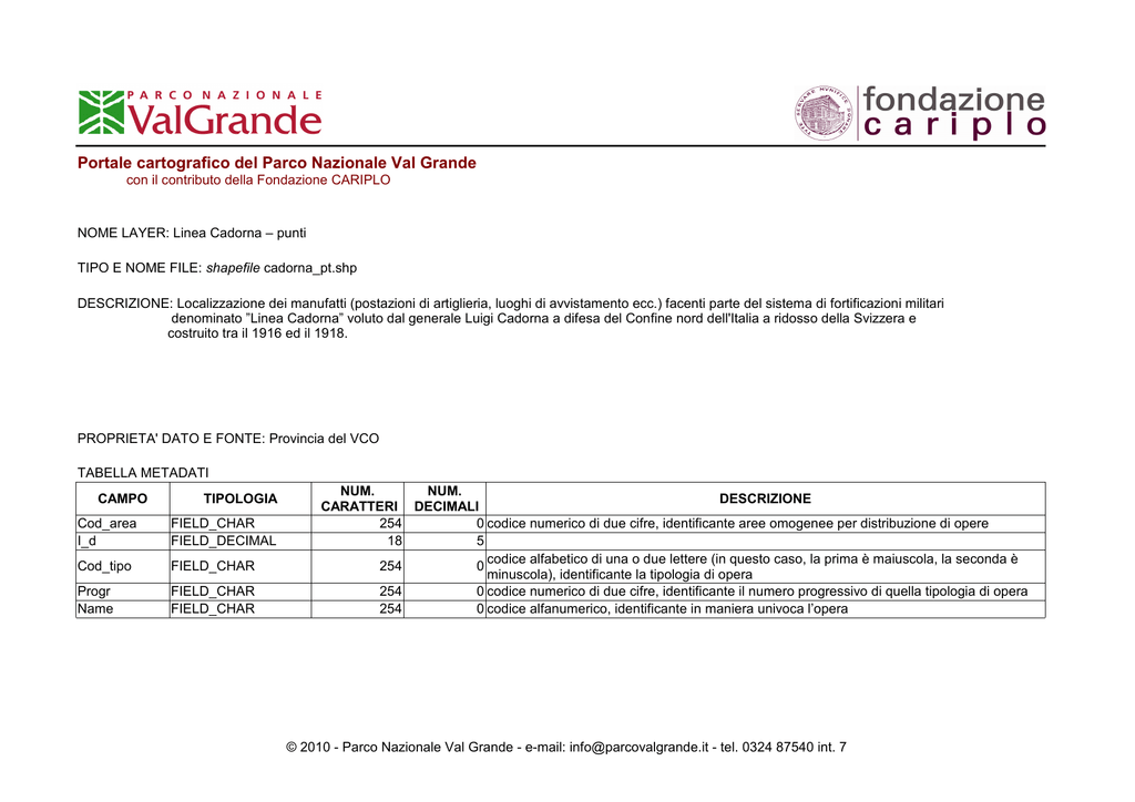 Portale cartografico del Parco Nazionale Val Grande con il contributo della Fondazione CARIPLO NOME LAYER: Linea Cadorna – punti TIPO E NOME FILE: shapefile cadorna_pt.shp DESCRIZIONE: Localizzazione dei manufatti (postazioni di artiglieria, luoghi di avvistamento ecc.) facenti parte del sistema di fortificazioni militari denominato ”Linea Cadorna” voluto dal generale Luigi Cadorna a difesa del Confine nord dell'Italia a ridosso della Svizzera e costruito tra il 1916 ed il 1918. PROPRIETA' DATO E FONTE: Provincia del VCO TABELLA METADATI CAMPO TIPOLOGIA Cod_area I_d FIELD_CHAR FIELD_DECIMAL Cod_tipo FIELD_CHAR Progr Name FIELD_CHAR FIELD_CHAR NUM. NUM. DESCRIZIONE CARATTERI DECIMALI 254 0 codice numerico di due cifre, identificante aree omogenee per distribuzione di opere 18 5 codice alfabetico di una o due lettere (in questo caso, la prima è maiuscola, la seconda è 254 0 minuscola), identificante la tipologia di opera 254 0 codice numerico di due cifre, identificante il numero progressivo di quella tipologia di opera 254 0 codice alfanumerico, identificante in maniera univoca l’opera © 2010 - Parco Nazionale Val Grande - e-mail: [email protected] - tel. 0324 87540 int. 7 Portale cartografico del Parco Nazionale Val Grande con il contributo della Fondazione CARIPLO TABELLA DI CORRISPONDENZA CAMPO CODICE CARATTERISTICA Cod_area Cod_area Cod_area Cod_area Cod_area Cod_area Cod_area 1 2 3 4 5 6 7 Cod_area 8 Cod_area Cod_area Cod_area Cod_area Cod_area Cod_area Cod_area Cod_area Cod_area 9 10 11 12 13 14 15 16 17 Forte di Bara Monte Massone Cima Tre Croci Costa del Gabbio Piana del Toce Sasso Grande di Cuzzago Pizzo Proman Candoglia, Albo, Bettola, Nibbio Montorfano Monte Zeda - Monte Vada' Monte Bavarione Monte Spalavera Monte Morissolo Monte Carza Viggiona Oggiogno Feriolo Cod_tipo Cod_tipo Cod_tipo Cod_tipo Cod_tipo Cod_tipo Cod_tipo Cod_tipo Cod_tipo B K O Oc P Pb Pc R Z batteria caserma osservatorio opera in caverna polveriera postazione in barbetta postazione in casamatta ricovero altro © 2010 - Parco Nazionale Val Grande - e-mail: [email protected] - tel. 0324 87540 int. 7