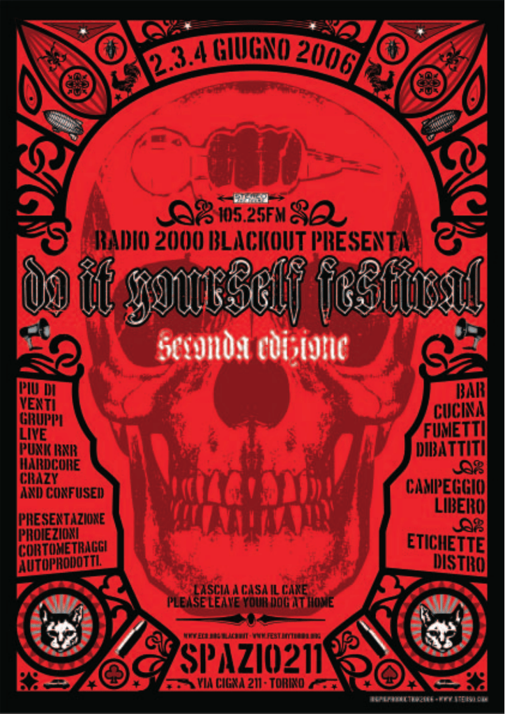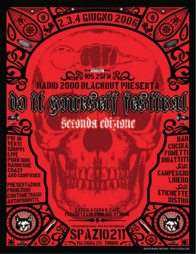 C i sono delle novità a Radio Black Out. Abbiamo rinnovato quasi completamente le nostre attrezzature, le ultime sono state il nuovo finale di potenza e la nuova antenna sul colle della Maddalena, e nello studio il processore audio e il nuovo mixer, per migliorare il segnale e allargare l’area coperta. Ci trasferiremo a fine giugno nella nuova sede di via Antonio Cecchi 21-A. Novità che comportano molti soldi e molto impegno, ma che erano necessarie per continuare a fare comunicazione antagonista oggi a Torino. I media sono stati per alcuni mesi catalizzati da quel grande delirio collettivo denominato Olimpiadi Torino 2006: “lustro e in ordine!” per il grande evento commerciale e mediatico fonte di profitto e pubblicità per tanti affaristi e politicanti, città-cantiere, vetrina sorvegliata da telecamere e guardie giurate. Gli stessi politicanti e affaristi tentano, militarizzando la montagna, di realizzare la famigerata, costosissima Alta Velocità, contro l’opposizione degli abitanti della Valle di Susa. I “burattinai” della metropoli hanno deciso di dare un giro di vite a chi dissente, è diverso, anomalo o irregolare. Prima cercando di trasformare il Balon in una specie di ipermercato a cielo aperto. Poi ci sono stati i rastrellamenti e i controlli di immigrati che hanno portato alla morte di quattro di essi, tra cui una donna caduta dal tetto dove tentava di sfuggire ai poliziotti che la inseguivano. Poi hanno caricato il corteo che portava in strada la rabbia per l’accoltellamento di due abitanti delle case occupate. In quell’occasione, sette partecipanti al corteo sono stati arrestati, due di essi di Radio Black Out. Cinque realtà autogestite (Laboratorio Sociale Occupato, Fenix, Rosalia, Alcova e il più volte sgombrato Osservatorio Ecologico contro le Olimpiadi/Tortuga) sono state chiuse per mano militare. Tutto questo in una metropoli che ha già visto la crisi della Fiat, luogo di sfruttamento ma anche di identità e di lotta per molte generazioni di lavoratori, quasi completamente sostituiti dai tanti giovani che lavorano in formazione lavoro, a chiamata, a progetto, part time, in stage, in nero. Ma ci sono movimenti, gruppi, culture e individui che resistono, che non ci stanno, e che vogliono esprimersi, incontrarsi e comunicare. Certo Radio Black Out non è l’unico strumento, ma anche noi vogliamo fare la nostra parte. Dal 1992 abbiamo trasmesso notiziari, interviste, presentazioni di libri e riviste, dirette da cortei, dibattiti, e naturalmente molta musica. Ai nostri microfoni si sono avvicendati centri sociali, case occupate, col- 2 lettivi studenteschi, sindacati di base, comitati della Val di Susa, Comitato Chiapas, Comitato Palestina, Lega Ambiente, Greenpeace, Rete Antirazzista, Circolo Gay-Lesbico Maurice, Amnesty International, medici, insegnanti, educatori, operai, tramvieri, immigrati, hacker, punk, rom, squatter, femministe, scrittori, fumettisti, musicisti. Poi ci sono state le feste. Ogni anno ne organizziamo una, se ci riusciamo anche due, con musica, spettacoli teatrali, proiezioni cinematografiche, stand con pubblicazioni, dischi e gadget, bar e cucina. Più di 50.000 persone sono intervenute e si sono divertite alle feste e ai concerti di Radio Black Out, ascoltando e ammirando artisti italiani come gli Statuto, MGZ, Fluxus, Amici di Roland, AK47, Kenze Neke, Marlene Kuntz, Africa United, Madasky, Fratelli di Soledad, Lou Dalphin (dall’Occitania), Panico, Xilema, Toni Tammaro, Canzoniere Grecanico Salentino, compagnia teatrale L’Accolita del Trabatello e stranieri come i DOA (dal Canada) gli Olho Seco (dal Brasile), gli Electric Frankenstein (dagli USA), gli Hot Rod Honeys (dal Belgio), gli Skarface (dalla Francia) e molti altri. Leggeteci, ascoltateci, visitate il nostro sito, venite alle nostre serate. Sostieni radio blackout: l'unica emittente autentica, libera e finanziata da chi la vive! Presta attenzione al calendario degli eventi Blackout sul sito oppure passa in banca, il nostro conto è: Radio Black Out Associazione Culturale CIN E ABI 05018 CAB 12100 C/C 00000116386 Banca Etica VIA CECCHI, 21/A TORINO (TURIN) - ITALIA 011/5806888 WWW.ECN.ORG/BLACKOUT WWW.RADIOBLACKOUT.ORG [email protected] 3 Secondo Do It Yourself Festival Festa delle autoproduzioni 2,3.4 Giugno 2006, Torino http://fest.diytorino.org // [email protected] NO. NON SIAMO INDIPENDENTI Indipendente. Ci vorrebbe un’intera guida del telefono per tutti gli elementi, le situazioni, i personaggi che si sbrodolano copiosamente sulla maglia affibbiandosi con spocchia la proprietà di tal termine. Un po’ come la ‘A’ cerchiata di anarchia, marchio registrato Eastpack. Anche MTV è indipendente. Da cosa, di cosa, perchè, è tutto da vedersi. Indipendente, parola ormai vuota, bene di consumo e di prima necessità per pubblicitari, etichéttari, mercanti del tutto e del niente. Siamo quelli che considerano ancora il DIY, il Do It Yourself, un’attitudine, non l’ennesimo baraccone mangia & bevi. Musica non necessariamente e obbligatoriamente per le masse, musica non per l’etichetta, musica perchè ce la viviamo, musica perchè è la nostra attitudine e vorremmo allargarla ad altri modi, quest’attitudine. Unica certezza: questa cosa ci resta, l’attitudine; non la si compra al primo ipermercato nè la si mostra al primo multisala, tantomeno la si trova negli onnipresenti oppiacei per le masse, i mega-gratis-’all-in-onenight’ show.. Unica certezza resta la precarietà Non siamo indipendenti. NO. NON E’ GRATIS Tre intensi giorni più un avvio preparatorio a scaldare le orecchie, un warm-up come in Formula Uno. Ci sarà musica, viva, nuova e molta, ci saranno banchetti e mercatini, ci saranno esposizioni, la cucina, il bar (doppio, interno ed all’aperto), gli aperitivi, un campeggio. Allarghiamo il campo e rilanciamo: ci saranno spazi e modi dedicati a fumettisti e fumetti, disegni e disegnatori, mostre permanenti e creazioni ‘live’ come sul palco