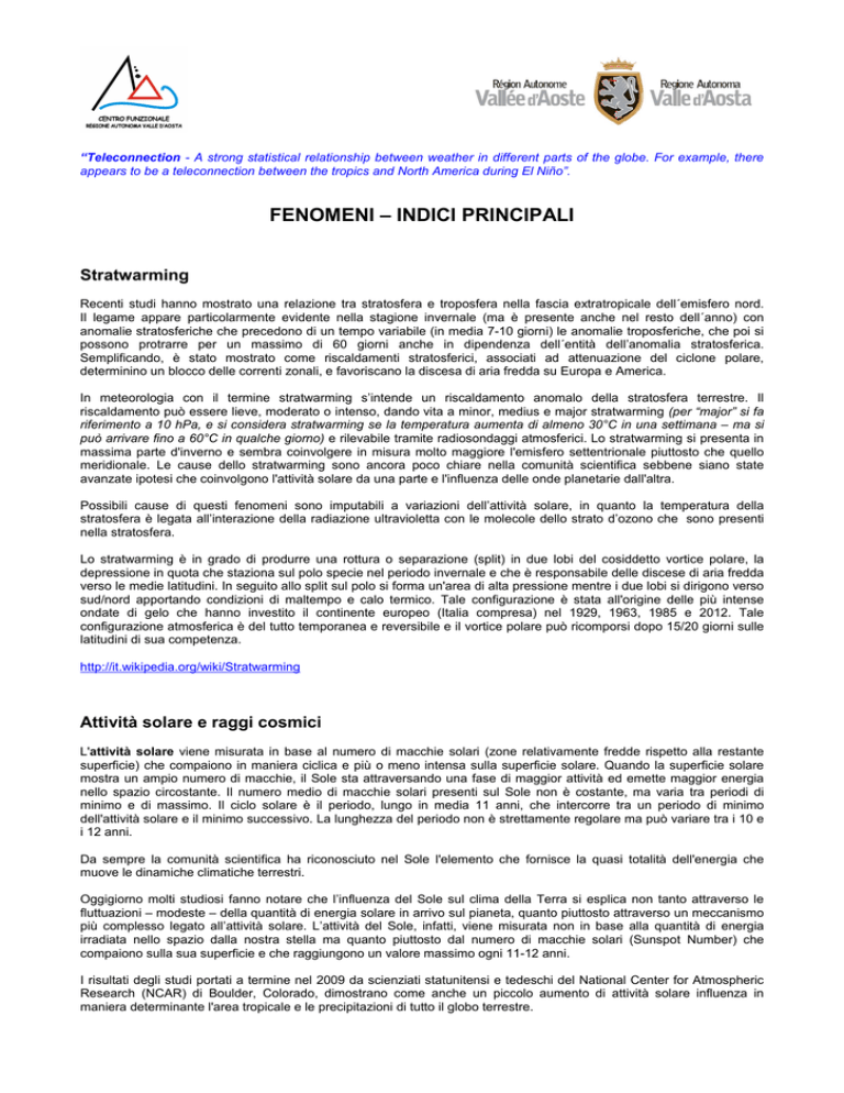 “Teleconnection - A strong statistical relationship between weather in different parts of the globe. For example, there appears to be a teleconnection between the tropics and North America during El Niño”. FENOMENI – INDICI PRINCIPALI Stratwarming Recenti studi hanno mostrato una relazione tra stratosfera e troposfera nella fascia extratropicale dell´emisfero nord. Il legame appare particolarmente evidente nella stagione invernale (ma è presente anche nel resto dell´anno) con anomalie stratosferiche che precedono di un tempo variabile (in media 7-10 giorni) le anomalie troposferiche, che poi si possono protrarre per un massimo di 60 giorni anche in dipendenza dell´entità dell’anomalia stratosferica. Semplificando, è stato mostrato come riscaldamenti stratosferici, associati ad attenuazione del ciclone polare, determinino un blocco delle correnti zonali, e favoriscano la discesa di aria fredda su Europa e America. In meteorologia con il termine stratwarming s’intende un riscaldamento anomalo della stratosfera terrestre. Il riscaldamento può essere lieve, moderato o intenso, dando vita a minor, medius e major stratwarming (per “major” si fa riferimento a 10 hPa, e si considera stratwarming se la temperatura aumenta di almeno 30°C in una settimana – ma si può arrivare fino a 60°C in qualche giorno) e rilevabile tramite radiosondaggi atmosferici. Lo stratwarming si presenta in massima parte d'inverno e sembra coinvolgere in misura molto maggiore l'emisfero settentrionale piuttosto che quello meridionale. Le cause dello stratwarming sono ancora poco chiare nella comunità scientifica sebbene siano state avanzate ipotesi che coinvolgono l'attività solare da una parte e l'influenza delle onde planetarie dall'altra. Possibili cause di questi fenomeni sono imputabili a variazioni dell’attività solare, in quanto la temperatura della stratosfera è legata all’interazione della radiazione ultravioletta con le molecole dello strato d’ozono che sono presenti nella stratosfera. Lo stratwarming è in grado di produrre una rottura o separazione (split) in due lobi del cosiddetto vortice polare, la depressione in quota che staziona sul polo specie nel periodo invernale e che è responsabile delle discese di aria fredda verso le medie latitudini. In seguito allo split sul polo si forma un'area di alta pressione mentre i due lobi si dirigono verso sud/nord apportando condizioni di maltempo e calo termico. Tale configurazione è stata all'origine delle più intense ondate di gelo che hanno investito il continente europeo (Italia compresa) nel 1929, 1963, 1985 e 2012. Tale configurazione atmosferica è del tutto temporanea e reversibile e il vortice polare può ricomporsi dopo 15/20 giorni sulle latitudini di sua competenza. http://it.wikipedia.org/wiki/Stratwarming Attività solare e raggi cosmici L'attività solare viene misurata in base al numero di macchie solari (zone relativamente fredde rispetto alla restante superficie) che compaiono in maniera ciclica e più o meno intensa sulla superficie solare. Quando la superficie solare mostra un ampio numero di macchie, il Sole sta attraversando una fase di maggior attività ed emette maggior energia nello spazio circostante. Il numero medio di macchie solari presenti sul Sole non è costante, ma varia tra periodi di minimo e di massimo. Il ciclo solare è il periodo, lungo in media 11 anni, che intercorre tra un periodo di minimo dell'attività solare e il minimo successivo. La lunghezza del periodo non è strettamente regolare ma può variare tra i 10 e i 12 anni. Da sempre la comunità scientifica ha riconosciuto nel Sole l'elemento che fornisce la quasi totalità dell'energia che muove le dinamiche climatiche terrestri. Oggigiorno molti studiosi fanno notare che l’influenza del Sole sul clima della Terra si esplica non tanto attraverso le fluttuazioni – modeste – della quantità di energia solare in arrivo sul pianeta, quanto piuttosto attraverso un meccanismo più complesso legato all’attività solare. L’attività del Sole, infatti, viene misurata non in base alla quantità di energia irradiata nello spazio dalla nostra stella ma quanto piuttosto dal numero di macchie solari (Sunspot Number) che compaiono sulla sua superficie e che raggiungono un valore massimo ogni 11-12 anni. I risultati degli studi portati a termine nel 2009 da scienziati statunitensi e tedeschi del National Center for Atmospheric Research (NCAR) di Boulder, Colorado, dimostrano come anche un piccolo aumento di attività solare influenza in maniera determinante l'area tropicale e le precipitazioni di tutto il globo terrestre. In particolare, gli effetti di una maggiore attività solare si fanno sentire in maniera forte nel riscaldamento della troposfera tropicale (dove aumenta la quantità di ozono prodotta dai raggi UVA), nell'aumento della forza dei venti alisei, nell'aumento dell'evaporazione nella zona equatoriale e nell'aumento dell'annuvolamento e delle precipitazioni. Lo studio rileva come ci sia un’indubbia associazione fra il periodico picco dell'attività solare e lo schema delle precipitazioni e della temperatura superficiale delle acque del Pacifico. Il modello messo a punto dai ricercatori mostra anche le influenze che i picchi solari hanno con due importanti fenomeni collegati al clima: La Niña e El Niño che sono originati da eventi associati ai cambiamenti nella temperatura delle acque superficiali del Pacifico orientale. In particolare l'attività solare risulta influire su La Niña e El Niño, rafforzandoli o contrastandoli. Un’altra importante relazione è stata osservata tra il flusso dei raggi cosmici che arrivano sulla Terra e l’aumento o diminuzione della copertura nuvolosa terrestre. A sua volta il flusso di particelle cosmiche che giungono sulla Terra varia con il variare dell’attività solare. Quando l’attività solare aumenta, aumenta anche il vento solare, un flusso di particelle cariche che propaga nell