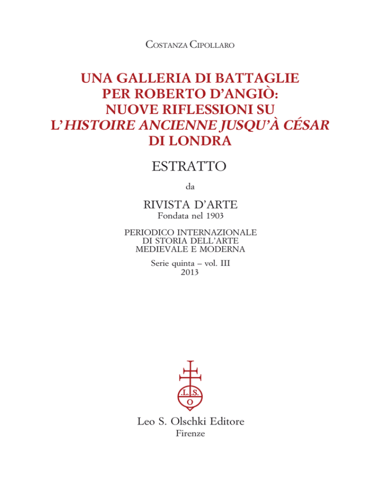 COSTANZA CIPOLLARO UNA GALLERIA DI BATTAGLIE PER ROBERTO D’ANGIÒ: NUOVE RIFLESSIONI SU L’HISTOIRE ANCIENNE JUSQU’À CÉSAR DI LONDRA ESTRATTO da RIVISTA D’ARTE Fondata nel 1903 PERIODICO INTERNAZIONALE DI STORIA DELL’ARTE MEDIEVALE E MODERNA Serie quinta – vol. III 2013 Leo S. Olschki Editore Firenze RIVISTA D’ARTE III - 2013 ISSN 1122-0732 MMXIII RIVISTA D’ARTE Fondata nel 1903 PERIODICO INTERNAZIONALE DI STORIA DELL’ARTE MEDIEVALE E MODERNA Serie quinta – vol. III 2013 MMXIII RIVISTA D’ARTE Fondata nel 1903 PERIODICO INTERNAZIONALE DI STORIA DELL’ARTE MEDIEVALE E MODERNA Annuario Consiglio di redazione Wolfger A. Bulst, Francesca Cappelletti, Giovan Battista Fidanza, Francesco Federico Mancini, Alessandro Tomei, Piera Giovanna Tordella, Ranieri Varese Comitato scientifico Luciano Arcangeli, Irina Artemieva, Maria Giulia Aurigemma, Carmen C. Bambach, Julian Brooks, Jean-Pierre Caillet, Hugo Chapman, Gaetano Curzi, Valter Curzi, Marzia Faietti, Cristina Galassi, Fabienne Joubert, Herbert L. Kessler, Pierluigi Leone de Castris, Catherine Loisel, Marina Maiskaja, Anne Markham Schulz, Vittoria Markova, Luisa Morozzi, Antonio Natali, Alessandro Nova, Marina Righetti, Massimiliano Rossi, Lucia Simonato, Gerhard Wolf Segreteria di redazione Claudia D’Alberto, Marco D’Attanasio, Emanuela Lauro Sede della redazione Dipartimento di Lettere, Arti e Scienze Sociali Università degli Studi ‘‘G. d’Annunzio’’ di Chieti-Pescara Campus Universitario - Via dei Vestini, 31 66100 Chieti (Italia) Rivista d’Arte pubblica articoli nelle seguenti lingue: italiano, inglese, tedesco, francese e spagnolo. È possibile sottoporre i testi per e-mail (testo e immagini in PDF a: [email protected]) oppure per posta (testo e immagini in CD e su supporto cartaceo a: Prof. A. Tomei, Dipartimento di Studi Medievali e Moderni, Università degli Studi ‘‘G. d’Annunzio’’ di Chieti-Pescara, Campus Universitario - Via dei Vestini, 31 - 66100 Chieti, Italia). Tutti i materiali inviati non verranno restituiti. Se l’articolo viene accettato per la pubblicazione, in seguito alla valutazione di almeno due revisori, l’autore riceverà le norme editoriali alle quali dovrà attenersi nella versione definitiva, che dovrà essere trasmessa in formato Word. Gli articoli non devono superare le 9.000 parole (note e appendici documentarie comprese) e le 15 immagini di corredo iconografico. Note relative alle illustrazioni degli articoli approvati: – Le immagini fornite devono essere libere da diritti di riproduzione e gli autori, laddove previsto, dovranno essere in possesso delle relative autorizzazioni alla riproduzione. – Per le immagini sono ammessi i formati .tiff, .jpeg, .eps, con profili sia in RGB, sia in CMYK e con risoluzione minima di 300 dpi in formato 20×28. – Per le immagini ‘‘a tratto’’ (senza mezze tinte) si richiede un formato .tiff con risoluzione di almeno 1200 dpi. Sono accettate con riserva anche fotocopie nitide. – Sono accettati originali per riflessione (stampa fotografica) o trasparenza (fotocolor) purché di buona qualità. – Nel caso in cui si desideri riprodurre particolari delle immagini, si prega di indicare la porzione di figura da riprodurre su un supporto cartaceo o sul retro della stampa fotografica. Rivista d’Arte publishes articles in Italian, English, German, French and Spanish. It is possible to submit the manuscript via e-mail (text and images in PDF version to: rivistadarte@ olschki.it) or via traditional post (text and images on both CD and paper copy to: Prof. A. Tomei, Dipartimento di Studi Medievali e Moderni, Università degli Studi ‘‘G. d’Annunzio’’ di ChietiPescara, Campus Universitario - Via dei Vestini, 31 - 66100 Chieti, Italy). All the materials sent, will not be returned. If the manuscript is accepted for publication, following the evaluations of at least two reviewers, the Author will receive editorial regulations, which he/she must respect in the final version of the article, that must be sent in Word. The articles must not contain more than 9,000 words (including footnotes and documentary appendixes) and 15 images. Amministrazione Casa Editrice Leo S. Olschki Casella postale 66, 50123 Firenze • Viuzzo del Pozzetto 8, 50126 Firenze e-mail: [email protected] • Conto corrente postale 12.707.501 Tel. (+39) 055.65.30.684 • fax (+39) 055.65.30.214 ABBONAMENTO ANNUALE – ANNUAL SUBSCRIPTION 2013 Directions for the illustrations of accepted articles: – The furnished images must be free of reproduction rights and, where this is not the case, the authorization must be obtained by the Authors. – For all images .tiff, .jpeg, .eps, are allowed with profiles in RGB and in CMYK, having a minimum resolution of 300 dpi in 20×28 format. – Regarding line drawing images, the format .tiff is required with a resolution of at least 1200 dpi. Moreover, sharp photocopies can be accepted with reservation. – High resolution prints and color transparencies are accepted too. – In the case where details of images must be reproduced, it is asked that the part of the figure be reproduced on paper or on the back of the printed photograph. ISTITUZIONI – INSTITUTIONS La quota per le istituzioni è comprensiva dell’accesso on-line alla rivista. Indirizzo IP e richieste di informazioni sulla procedura di attivazione dovranno essere inoltrati a [email protected] Subscription rates for institutions include on-line access to the journal. The IP address and requests for information on the activation procedure should be sent to [email protected] Italia € 93,00 • Foreign € 112,00 solo on-line - on-line only € 85,00 Autorizzazione del Tribunale in corso. Direttore responsabile: GRAZIELLA CIRRI Questo volume di Rivista d’Arte è stato realizzato con il contributo di Università degli Studi ‘‘G. d’Annunzio’’ di Chieti-Pescara con il sostegno di Ferrara e in collaborazione con RIVISTA D’ARTE Fondata nel 19
