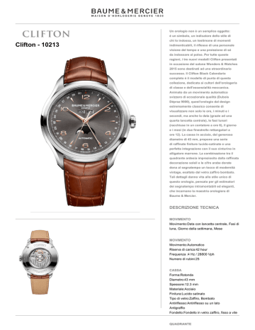Un orologio non è un semplice oggetto: è un simbolo, un indicatore dello stile di chi lo indossa, un testimone di momenti Clifton - 10213 indimenticabili, il riflesso di una personale visione del tempo e una proiezione di sé da indossare al polso. Per tutte queste ragioni, i tre nuovi modelli Clifton presentati in occasione del salone Wonders & Watches 2015 sono destinati ad uno straordinario successo. Il Clifton Black Calendario completo è il modello di punta di questa collezione, dedicata ai cultori dell'orologeria di classe e dell'essenzialità meccanica. Animato da un movimento automatico svizzero di eccezionale qualità (Dubois Dépraz 9000), quest'orologio dal design estremamente classico consente di visualizzare non solo le ore, i minuti e i secondi, ma anche la data (grazie ad una quarta lancetta centrale), le fasi lunari (racchiuse in un contatore a ore 6), il giorno e i mesi (in due finestrelle rettangolari a ore 12). La cassa in acciaio, dal generoso diametro di 43 mm, propone una serie di raffinate finiture lucido-satinate e una perfetta integrazione con il suo cinturino in alligatore marrone. La combinazione tra il quadrante ardesia impreziosito dalla raffinata decorazione soleil e le cifre arabe dorate dona al segnatempo un tocco di modernità vintage, esaltato dal vetro zaffiro bombato. Tali dettagli danno vita allo stile unico di questo orologio, pensato per gli estimatori dei segnatempo intramontabili ed eleganti, che incarnano la maestria orologiera di Baume & Mercier. DESCRIZIONE TECNICA MOVIMENTO Movimento:Data con lancetta centrale, Fasi di luna, Giorno della settimana, Mese MOVIMENTO Movimento:Automatico Riserva di carica:42 hour Frequenza :4 Hz / 28800 Vph Numero di rubini:25 CASSA Forma:Rotonda Diametro:43 mm Spessore:12.3 mm Materiale:Acciaio Finitura:Lucido satinato Tipo di vetro:Zaffiro, Bombato Antiriflesso:Antiriflesso su un lato Antigraffio Fondello:Fondello in vetro zaffiro, fisso a vite QUADRANTE Colore/Finiture:Ardesia/finitura satinata “soleil” Numeri:Cifre arabe, Dorato, Cifre applicate Indici:Dorato CINTURINO Materiale:Pelle di alligatore ALTRO Impermeabilità:5 ATM (circa 50 metri)