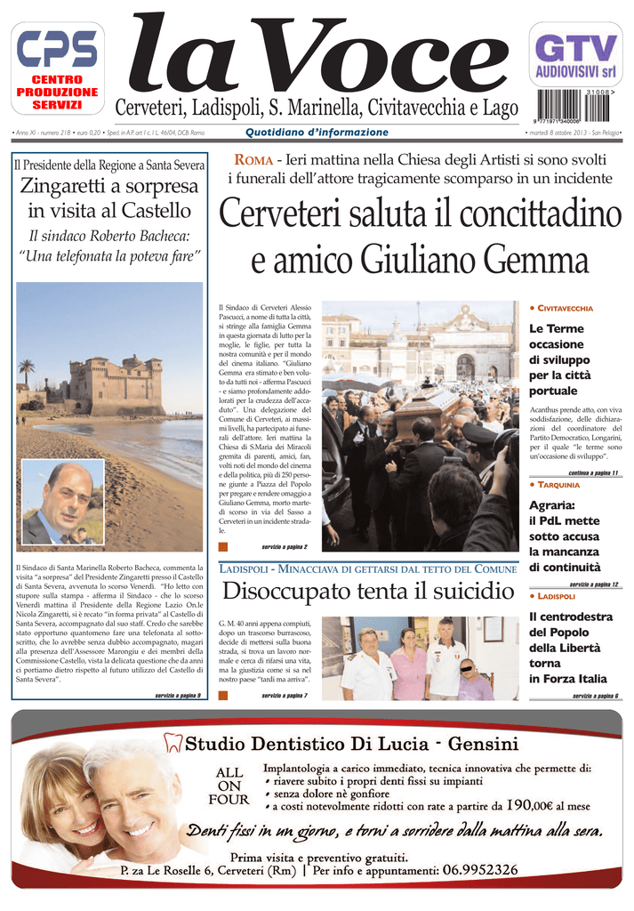 CENTRO PRODUZIONE SERVIZI laVoce Cerveteri, Ladispoli, S. Marinella, Civitavecchia e Lago • Anno XI - numero 218 • euro 0,20 • Sped. in A.P. art I c. I L. 46/04, DCB Roma Il Presidente della Regione a Santa Severa Zingaretti a sorpresa in visita al Castello Il sindaco Roberto Bacheca: “Una telefonata la poteva fare” Quotidiano d’informazione ROMA - Ieri mattina nella Chiesa degli Artisti si sono svolti i funerali dell’attore tragicamente scomparso in un incidente Cerveteri saluta il concittadino e amico Giuliano Gemma Il Sindaco di Cerveteri Alessio Pascucci, a nome di tutta la città, si stringe alla famiglia Gemma in questa giornata di lutto per la moglie, le figlie, per tutta la nostra comunità e per il mondo del cinema italiano. “Giuliano Gemma era stimato e ben voluto da tutti noi - afferma Pascucci - e siamo profondamente addolorati per la crudezza dell’accaduto”. Una delegazione del Comune di Cerveteri, ai massimi livelli, ha partecipato ai funerali dell’attore. Ieri mattina la Chiesa di S.Maria dei Miracoli gremita di parenti, amici, fan, volti noti del mondo del cinema e della politica, più di 250 persone giunte a Piazza del Popolo per pregare e rendere omaggio a Giuliano Gemma, morto martedì scorso in via del Sasso a Cerveteri in un incidente stradale. servizio a pagina 2 Il Sindaco di Santa Marinella Roberto Bacheca, commenta la visita “a sorpresa” del Presidente Zingaretti presso il Castello di Santa Severa, avvenuta lo scorso Venerdì. “Ho letto con stupore sulla stampa - afferma il Sindaco - che lo scorso Venerdì mattina il Presidente della Regione Lazio On.le Nicola Zingaretti, si è recato “in forma privata” al Castello di Santa Severa, accompagnato dal suo staff. Credo che sarebbe stato opportuno quantomeno fare una telefonata al sottoscritto, che lo avrebbe senza dubbio accompagnato, magari alla presenza dell’Assessore Marongiu e dei membri della Commissione Castello, vista la delicata questione che da anni ci portiamo dietro rispetto al futuro utilizzo del Castello di Santa Severa”. servizio a pagina 9 • martedì 8 ottobre 2013 - San Pelagia• Disoccupato tenta il suicidio LADISPOLI - MINACCIAVA DI GETTARSI DAL TETTO DEL COMUNE G. M. 40 anni appena compiuti, dopo un trascorso burrascoso, decide di mettersi sulla buona strada, si trova un lavoro normale e cerca di rifarsi una vita, ma la giustizia come si sa nel nostro paese “tardi ma arriva”. servizio a pagina 7 • CIVITAVECCHIA Le Terme occasione di sviluppo per la città portuale Acanthus prende atto, con viva soddisfazione, delle dichiarazioni del coordinatore del Partito Democratico, Longarini, per il quale “le terme sono un’occasione di sviluppo”. continua a pagina 11 • TARQUINIA Agraria: il PdL mette sotto accusa la mancanza di continuità servizio a pagina 12 • LADISPOLI Il centrodestra del Popolo della Libertà torna in Forza Italia servizio a pagina 6 Cerveteri: Ciao Giuliano! 2 • Cerveteri martedì 8 ottobre 2013 la Voce Piazza del Popolo - Gremita la Chiesa degli Artisti per l’ultimo saluto a Gemma Da anni viveva nella nostra città dove tutti lo conoscevamo e tanti gli volevano bene Il Sindaco di Cerveteri Alessio Pascucci, a nome di tutta la città, si stringe alla famiglia Gemma in questa giornata di lutto per la moglie, le figlie, per tutta la nostra comunità e per il mondo del cinema italiano. “Giuliano Gemma era stimato e ben voluto da tutti noi - afferma Pascucci - e siamo profondamente addolorati per la crudezza dell’accaduto”. Una delegazione del Comune di Cerveteri, ai massimi livelli, ha partecipato ai funerali dell’attore. Ieri mattina la Chiesa di S.Maria dei Miracoli gremita di parenti, amici, fan, volti noti del mondo del cinema e della politica, più di 250 persone giunte a Piazza del Popolo per pregare e rendere omaggio a Giuliano Gemma, morto martedì scorso in via del Sasso a Cerveteri in un incidente stradale, a cui bisogna aggiungere le oltre duecento che, grazie a maxi altoparlanti, hanno potuto seguire la Santa Messa anche dalla piazza, non trovando più posto all’interno della Chiesa. Roma amava Gemma e piange la sua scomparsa: “Adiòs Gringo, il rione Testaccio ti saluta”, si legge su un cuscino di fiori. Lunga e sentita l’omelia di don Walter, sacerdote della Chiesa degli Artisti: “Ci prepariamo al distacco ma non abbiamo la tentazione di pensare che Giuliano non esista più, la sua anima continua a vivere”. Lo ha descritto come “un uomo dal temperamento ironico, sensibile, con uno sguardo e un cuore puro, non era molto praticante ma credeva fortemente nell’esistenza di Dio. Il suo cane Puk è disperato, sembra non darsi pace. Amava la scultura, stava allestendo una mostra e amava molto Papa Francesco perché è un richiamo per le persone e la Chiesa per vivere in modo semplice. Ricordiamo la sua umanità e generosità, di un uomo che non aveva capricci da divo, non si sentiva una star ma era una persona che ha donato tanto amore. Giuliano Gemma lascia il palcoscenico di questo mondo per entrare nella vita eterna”. A dare l’ultimo saluto a Giuliano Gemma, tra gli altri: Walter Veltroni, Francesco Rutelli, l’as- sessore capitolino Flavia Barca, con la fascia tricolore in rappresentanza del sindaco Marino, Alessandro Cochi, ex assessore allo sport della Giunta Alemanno, gli attori Franco Nero, Fabio Testi, Leopoldo Mastelloni, Philip Leroy e il collega Bud Spencer, Fabrizio Frizzi, Incidente in via del Sasso, la moglie di Giuliano Gemma chiede chiarimenti sui soccorsi Non si placano le polemiche attorno alla morte dell’attore Giuliano Gemma. A sollevare ancora gli animi è la moglie del re del western all’italiana, Baba Richerme che chiede chiarimenti su quanto accaduto la sera del primo ottobre in merito alle dinamiche dei soccorsi a Gemma dopo l’incidente stradale avvenuto a Cerveteri all’altezza del bivio di via del Sasso con via di Zambra. La vedova, parlando con i giornalisti fuor