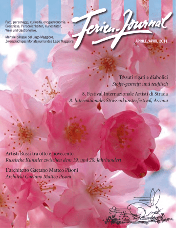 Fatti, personaggi, curiosità, enogastronomia. Ereignisse, Persönlichkeiten, Kuriositäten, Wein und Gastronomie. Mensile bilingue del Lago Maggiore. Zweisprachiges Monatsjournal des Lago Maggiore. APRILE/APRIL 2011 Tessuti rigati e diabolici Stoffe-gestreift und teuflisch 8. Festival Internazionale Artisti di Strada 8. Internationales Strassenkünsterfestival, Ascona Artisti Russi tra otto e novecento Russische Künstler zwischen dem 19. und 20. Jahrhundert L’architetto Gaetano Matteo Pisoni Architekt Gaetano Matteo Pisoni RIVA 27 Iseo Model 27 Iseo Maximum speed 37 knots Engines 1 x Yanmar 8LV 320 Hp Displacement 3,31 t. Propulsion Stern drive duoprop Fuel tank 330 lt. L.o.a. 8,26 m. Water tank 120 lt. Beam 2,50 m. Max people on board 6 Draft 0,87 m. Category C Email: [email protected] Phone: +41.91 - 785 80 30 V i a l e B . Pa p i o 3 , C H - 6 6 1 2 A s c o n a Switzerland 2 FJ | APRILE/APRIL | 2011 FJ | APRILE/APRIL | 2011 “Competency for all your needs” Private, Pleasure and Business flight to any worldwide destination Basi Heli Rezia: Heli Rezia SA Casella Postale 5 CH - 6775 Ambrì Heli Rezia SA Casella Postale 134 CH - 6534 San Vittore Tel. 0041 (0) 91 873 66 66 Fax 0041 (0) 91 873 66 69 [email protected] www.helirezia.ch 3 4 FJ | APRILE/APRIL | 2011 FJ | APRILE/APRIL | 2011 Issate le vele: si naviga verso un nuovo... portale Setzt die Segel – wir segeln zu einem neuen... Portal E H ccoci alla seconda puntata del cammino che faremo assieme a voi in questo 2011. Un cammino dove dietro a ogni angolo ci si potrà imbattere in piacevoli sorprese, scoperte accattivanti. Ne volete un esempio? Basta accendere il vostro computer accedere al sito www.ferienjournal.ch e lo scoprirete in pochi clic: buona navigazione! Il vento delle novità è soffiato anche in internet, con una home-page ancora più accattivante, un autentico molo da cui potete partire per altre… crociere alla scoperta della nostra regione. Volete sapere che tempo fa nella zona? Date un occhio alla webcam. Oppure siete alla ricerca di spunti per una serata diversa? Cercate nel ricco menu che vi proponiamo nel nostro portale e sarete saziati di proposte, e, altra chicca, a disposizione degli utenti c’è pure uno spazio per lasciare i propri commenti, le proprie segnalazioni. Un servizio in più, che va a completare le diverse… portate che vi serviamo e continueremo a servire nella versione cartacea. Buona lettura, o su carta o… su monitor. Andreas Pieroni ier ist die zweite Etappe des Weges, den wir mit Ihnen in diesem Jahr gemeinsam machen. Ein Weg, an dem Sie hinter jeder Ecke auf eine freudige Überraschung stossen oder attraktive Entdeckungen machen. Möchten Sie ein Beispiel? Dann schauen Sie einmal auf unsere Internetseite, www.ferienjournal.ch – es genügen ein paar Klicke. Gute Fahrt! Der neue Wind weht auch im Internet, mit einer Homepage die Ihnen gefallen wird. Ein Anlegeplatz, von dem Sie sich auf Kreuzfahrt begeben können, um unser schönes Tessin kennenzulernen. Möchten Sie über das Wetter Bescheid wissen? Schauen Sie doch mal ins Webcam rein. Oder möchten Sie einen ganz speziellen Abend organisieren? Auch hier können Ihnen die reichhaltigen „Menus“ in unserem Portal behilflich sein. Ein weiteres Kleinod: unseren Lesern ist eine Seite vorbehalten, in der Sie uns schreiben können, Ihre Kommentare, Vorschläge oder anderes. Das ist ein Service, den wir Ihnen in unserer heutigen Internetzeit zur Verfügung stellen möchten. Ein weiterer Gang in unserem Menu, zusätzlich zum gedruckten Ferienjournal. Viel Spass beim lesen, sei es im gedruckten Ferien Journal oder am Monitor. Andreas Pieroni C M Y CM MY CY CMY K 5 6 FJ | APRILE/APRIL | 2011 FJ | APRILE/APRIL | 2011 l’ orologio del pilota Nessun altro orologio è progettato come un Rolex. Il Cosmograph Daytona, presentato nel 1963, è stato creato per i professionisti delle corse automobilistiche ed in breve tempo è diventato un simbolo. Il movimento cronografo brevettato e la lunetta con scala tachimetrica consentono ai piloti l’esatta misurazione di un giro di pista ed il calcolo della velocità media. Il Cosmograph Daytona è qui raffigurato in versione oro Everose, un brevetto Rolex. cosmogr aph day tona 44 6 22 EDITORIALE Issate le vele: si naviga verso un nuovo... portale ............. 4 Setzt die Segel - wir segeln zu einem neuen... Portal Manifestazioni - Veranstaltungen .................................... 56 Tante novità e con un occhio particolare rivolto all‘ecologia . 8 Viele Neuheiten - und ein besonderes Augenmark auf die Oekologie L’architetto Gaetano Matteo Pisoni ................................ 68 Architekt Gaetano Matteo Pisoni Giappone, c‘è la forza per risollevare l‘economia ........... 14 Japan - und die Kraft, die Wirtschaft wieder im Schwung zu bringen Aprile dolce dormire? non per tutti ................................ 78 Süsser Schlaf im April? nicht für Alle... Midnight Ascona chiude alle 23.30 ................................. 18 Midnight Ascona schliesst um 23.15h Tra i banchi della natura .................................................. 82 Die Schulbank drücken - in der Natur Artisti Russi tra otto e novecento .................................... 22 Russische Künstler zwischen dem 19. und 20. Jahrhundert Profughi: e le mani tese dove sono? ................................ 86 Flüchtlinge-und wo bleibt die helfende Hand? Da Mystic Barrito a mister Baritono ............................... 28 Vom Mystic Barrito zum Mister Baritono Escursioni e passeggiate ................................................... 88 Ausflüge und Spaziergänge Ascona, terra di teatri ....................................................... 32 Ascona, ein Stück Theater La nuova Focus................................................................. 94 Der Neue Focus Tessuti rigati e diabolici ................................................... 38 Stoffe-gestreift und teuflisch Intervista con Felix Stiefel.........