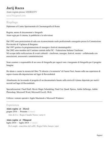 Jurij Razza Aiuto regista presso 3ZERO2TV [email protected] Riepilogo Diplomato al Centro Sperimentale di Cinematografia di Roma Regista, autore di documentari e fotografo Aiuto regia per il cinema, la pubblicità e la televisione Dal 1992 sono proiezionista di sala con riconoscimento ruolo professionale conseguito presso la Commissione Provinciale di Vigilanza di Bergamo Dal 1997 gestisco la programmazione di rassegne e festival cinematografici Dal 2002 sono membro del Comitato centrale della FIC - Federazione Italiana Cineforum Mi occupo della realizzazione di eventi culturali - cineforum, rassegne, festival, mostre - collaborando con associazioni, assessorati e amministrazioni Sono curatore e responsabile di un corso di fotografia per ragazzi rom e insegnante di fotografia per il progetto Imagine Ho ideato e curato la stesura del libro "Il silenzio e la memoria" di Fausta Finzi, basato sulla sua esperienza di sopravvissuta alla deportazione nel lager di Ravensbrück Attualmente sto lavorando al progetto di un documentario basato sulla storia di 6 donne deportate per motivi razziali nel lager di Ravensbrück Specializzazioni: Final Draft, Movie Magic Scheduling, Final Cut, Quark Xpress, Adobe InDesign, Adobe Photoshop, Microsoft Word, Microsoft Excell, iWeb Utilizzo i sistemi operativi Apple Macintosh e Microsoft Windows Esperienza Aiuto regista at 3Zero2 giugno 2014 - Presente (4 mesi) Alex & Co. | Regia Claudio Norza | serie tv Aiuto regista at Filmgood luglio 2014 - luglio 2014 (1 mese) De Longhi - macchine del caffè | Regia Fabio Jansen | spot Pagina1 Aiuto regista at Black Mamba luglio 2014 - luglio 2014 (1 mese) Santal | Regia Federico Cambria | spot Aiuto regista at Black Mamba luglio 2014 - luglio 2014 (1 mese) Wind - Pillole di Vanessa | Regia Federico Cambria | spot | Testimonial Vanessa Incontrada Aiuto regista at Black Mamba giugno 2014 - giugno 2014 (1 mese) Tenuta San Pietro | Regia Jean-Marc Viel | spot Aiuto regista at 3ZERO2TV marzo 2014 - giugno 2014 (4 mesi) Angie e le ricette di Violetta | Regia Giorgio D'Introno | Disney Channel | serie tv Curatore e organizzatore Cinecult at Movie Planet Group ottobre 2013 - giugno 2014 (9 mesi) Cinecult | Organizzatore e curatore rassegna di 31 film d'autore per il cinema Movie Planet di Busnago (MB) Curatore rassegna at The Space Cinema ottobre 2013 - giugno 2014 (9 mesi) Cineforum The Space Cinema | Curatore rassegna di 30 film d'autore per la sala di Vimercate (MB) e curatore comunicazione della rassegna per le sale di Firenze, Genova, Limena (PD), Parma (Barilla Center), Pradamano (UD), Roma (Parco de' Medici), Salerno, Silea (TV) Aiuto regista at Black Mamba maggio 2014 - maggio 2014 (1 mese) Hotpoint Ariston | Regia Fabio Jansen | spot Aiuto regista at Andrea La Greca aprile 2014 - aprile 2014 (1 mese) Andrea La Greca - Combatti col cuore | Regia Didier Tommasi | Videoclip Aiuto regista at Enormous Films marzo 2014 - marzo 2014 (1 mese) PittaRosso | Regia Alessandro D'Alatri | spot | Aiuto regista e casting Fotografo di scena at Zodiak Active - Zodiak Media Company marzo 2014 - marzo 2014 (1 mese) Lina's Hair - Stagione 2 | Fotografo di scena Aiuto regista at Black Mamba marzo 2014 - marzo 2014 (1 mese) Pagina2 Nek - "Hey Dio" - Zenithal | Regia Fabio Jansen | videoclip Aiuto regista at Black Mamba marzo 2014 - marzo 2014 (1 mese) Gatorade - Scatena la scintilla | Regia Fabio Jansen | spot Aiuto regista at Black Mamba febbraio 2014 - febbraio 2014 (1 mese) Kellogg's - Charity CocoPops | Regia Fabio Jansen | spot Aiuto regista at Black Mamba febbraio 2014 - febbraio 2014 (1 mese) Tempur | Regia Jean-Marc Viel | spot Aiuto regista at 3ZERO2TV dicembre 2013 - gennaio 2014 (2 mesi) Disney English | Regia Gianluca Brezza | Disney Channel Aiuto regista at Tapelessfilm dicembre 2013 - dicembre 2013 (1 mese) BCC Banca Credito Commerciale - Ci siamo | Regia Ivana Smodja | spot Aiuto regista at Black Mamba dicembre 2013 - dicembre 2013 (1 mese) Tenuta San Pietro | Regia Fabio Jansen | spot Aiuto regista at 3ZERO2TV dicembre 2013 - dicembre 2013 (1 mese) Disney English | Regia Gianluca Brezza | Disney Channel Aiuto regista at Akita Film novembre 2013 - novembre 2013 (1 mese) Kinder Maxi - I maxi tutorial | Regia Paolo Vari | spot Aiuto regista at Black Mamba ottobre 2013 - ottobre 2013 (1 mese) Vodafone cordless | Regia Fabio Jansen | spot Aiuto regista at Black Mamba ottobre 2013 - ottobre 2013 (1 mese) Telecom tutto | Regia Fabio Jansen | spot Edizione at Ruvido Produzioni ottobre 2013 - ottobre 2013 (1 mese) Pagina3 TVS - Carlo Cracco | Regia Umberto Spinazzola | spot Aiuto regista at AB Comunicazioni settembre 2013 - settembre 2013 (1 mese) Ministero Politiche Europee | Regia Federico Cambria | spot Aiuto regista at 3ZERO2TV agosto 2013 - settembre 2013 (2 mesi) Disney English | Regia Gianluca Brezza | Disney Channel Aiuto regista at Black Mamba luglio 2013 - luglio 2013 (1 mese) TIM - promo tablet | Regia Fabio Jansen | spot Aiuto regista at Black Mamba luglio 2013 - luglio 2013 (1 mese) TIM - promo tutto compreso | Regia Fabio Jansen | spot Aiuto regista at Post Office Reloaded luglio 2013 - luglio 2013 (1 mese) ABB - Io sono energia | Regia Andrea Pecora | spot Aiuto regista at Shortcut Productions luglio 2013 - luglio 2013 (1 mese) BMW Mini - Le quattro stagioni | Regia Paolo Vari | spot Fotografo at Imagine Factory luglio 2013 - luglio 2013 (1 mese) Progetto Imagine Factory | Insegnate di fotografia e video Aiuto regista at 3ZERO2TV giugno 2013 - giugno 2013 (1 mese) Violetta (promo) | Regia Laura Castelli | Disney Channel | con Martina Stoessel, Jorge Blanco, Diego Dominguez, Lodovica Comello, Ruggero Pasquarelli, Clara Alonso Curatore Cineforum at The Space Cinema ottobre 2012 - giugno 2013 (9 mesi) Cineforum The Space Cinema | Organizzatore e curatore rassegna di 30 film d'autore per le sale di Vimercate (MB), Genova, Limena (PD), Parma (Barilla Center), Pradamano (UD), Silea (TV) Aiuto regista at Movie Magic Internationa