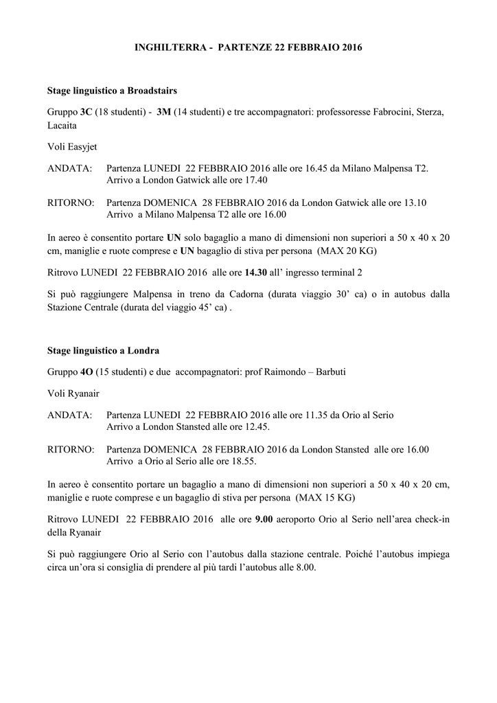 INGHILTERRA - PARTENZE 22 FEBBRAIO 2016 Stage linguistico a Broadstairs Gruppo 3C (18 studenti) - 3M (14 studenti) e tre accompagnatori: professoresse Fabrocini, Sterza, Lacaita Voli Easyjet ANDATA: Partenza LUNEDI 22 FEBBRAIO 2016 alle ore 16.45 da Milano Malpensa T2. Arrivo a London Gatwick alle ore 17.40 RITORNO: Partenza DOMENICA 28 FEBBRAIO 2016 da London Gatwick alle ore 13.10 Arrivo a Milano Malpensa T2 alle ore 16.00 In aereo è consentito portare UN solo bagaglio a mano di dimensioni non superiori a 50 x 40 x 20 cm, maniglie e ruote comprese e UN bagaglio di stiva per persona (MAX 20 KG) Ritrovo LUNEDI 22 FEBBRAIO 2016 alle ore 14.30 all’ ingresso terminal 2 Si può raggiungere Malpensa in treno da Cadorna (durata viaggio 30’ ca) o in autobus dalla Stazione Centrale (durata del viaggio 45’ ca) . Stage linguistico a Londra Gruppo 4O (15 studenti) e due accompagnatori: prof Raimondo – Barbuti Voli Ryanair ANDATA: Partenza LUNEDI 22 FEBBRAIO 2016 alle ore 11.35 da Orio al Serio Arrivo a London Stansted alle ore 12.45. RITORNO: Partenza DOMENICA 28 FEBBRAIO 2016 da London Stansted alle ore 16.00 Arrivo a Orio al Serio alle ore 18.55. In aereo è consentito portare un bagaglio a mano di dimensioni non superiori a 50 x 40 x 20 cm, maniglie e ruote comprese e un bagaglio di stiva per persona (MAX 15 KG) Ritrovo LUNEDI 22 FEBBRAIO 2016 alle ore 9.00 aeroporto Orio al Serio nell’area check-in della Ryanair Si può raggiungere Orio al Serio con l’autobus dalla stazione centrale. Poiché l’autobus impiega circa un’ora si consiglia di prendere al più tardi l’autobus alle 8.00. INGHILTERRA - PARTENZE 28 FEBBRAIO 2016 Stage linguistico a Broadstairs GRUPPO 3G – 3L 44 studenti e 3 accompagnatori: prof. D’Angelone, Balducci, Jankovic Voli Ryanair ANDATA: Partenza DOMENICA 28 FEBBRAIO alle ore 21.45 da Milano Malpensa T1 Arrivo a Londra Stansted alle ore 22.35 RITORNO: Partenza SABATO 12 MARZO alle ore 18.20 da Londra Stansted Arrivo a Malpensa T1 alle ore 21.20 In aereo è consentito portare un bagaglio a mano di dimensioni non superiori a 50 x 40 x 20 cm, maniglie e ruote comprese e UN bagaglio di stiva per persona (MAX 15 KG) L’appuntamento per la partenza dall’Italia è il DOMENICA 28 FEBBRAIO 2016 alle ore 19.30 Milano Malpensa T1 nell’atrio appena entrati nel terminal. Si può raggiungere Malpensa in treno da Cadorna (durata viaggio 30’ ca) o in autobus dalla Stazione Centrale (durata del viaggio ca 45’) . GRUPPO 3H-3I 38 studenti, tre accompagnatori prof Zurlo, Vigo, Pessina, un genitore Voli Easyjet ANDATA: Partenza DOMENICA 28 FEBBRAIO alle ore 19.20 da Milano Linate Arrivo a Londra Gatwick alle ore 20.10 RITORNO: Partenza SABATO 12 MARZO alle ore 19.30 da Londra Gatwick Arrivo a Linate alle ore 22.25 In aereo è consentito portare un bagaglio a mano di dimensioni non superiori a 50 x 40 x 20 cm, maniglie e ruote comprese e UN bagaglio di stiva per persona (MAX 15 KG). L’appuntamento per la partenza dall’Italia è il DOMENICA 28 FEBBRAIO 2016 alle ore 17.00 a Milano Linate nell’area gruppi. Si può raggiungere Linate con l’ autobus n°73 in partenza da San Babila. Tempo di percorrenza 45’ ca FRANCIA - PARTENZA 28 FEBBRAIO 2016 Stage linguistico a Tours Viaggio in treno GRUPPO 4G-4L 38 studenti, tre accompagnatori prof Leonardi, Rambaldi, Pini ANDATA: Partenza DOMENICA 28 FEBBRAIO alle ore 06.00 da Milano Porta Garibaldi Arrivo a Parigi, Gare de Lyon alle ore 13.19 RITORNO: Partenza SABATO 12 MARZO alle ore 14.41 dalla Gare de Lyon Arrivo Milano Porta Garibaldi alle ore 21.50 L’appuntamento per la partenza dall’Italia è il DOMENICA 28 FEBBRAIO 2016 alle ore 05.15 all’ingresso della stazione di Porta Garibaldi. GERMANIA - PARTENZA 28 FEBBRAIO 2016 Stage linguistico a Tűbingen Viaggio in pullman GRUPPO 4H-5H 27 studenti, due accompagnatori prof Di Palma, Pisani ANDATA: Partenza DOMENICA 28 FEBBRAIO alle ore 08.00 in pullman dal Liceo Tenca Arrivo alla scuola di Tűbingen alle ore 15.00 ca RITORNO: Partenza DOMENICA 06 MARZO alle ore 09.00 dalla scuola di Tűbingen Arrivo Milano – Liceo Tenca alle ore 16.00 ca L’appuntamento per la partenza dall’Italia è il DOMENICA 28 FEBBRAIO 2016 alle ore 07.40 davanti al Liceo Tenca SPAGNA - PARTENZA 02 MARZO 2016 Stage linguistico a Siviglia Viaggio in aereo+ pullman GRUPPO 5G-5L 40 studenti, tre accompagnatori prof Boglione, Nicolini, Orlando ANDATA: Partenza MERCOLEDI 02 MARZO alle ore 13.45 in pullman dal Liceo Tenca verso Orio al Serio. L’aereo parte alle ore 16.45. Arrivo a Siviglia alle ore 19.25 RITORNO: Partenza da Siviglia MERCOLEDI 16 MARZO alle ore 19.40 Arrivo a Orio al Serio alle 22.20. Un pullman riporterà tutti davanti al Liceo Tenca verso le 23.40. La mattina del 2 marzo si va a scuola con i bagagli alle oe 11.05, si svolgono due ore di lezione, fino alle 13.05 e poi si parte in pullman.