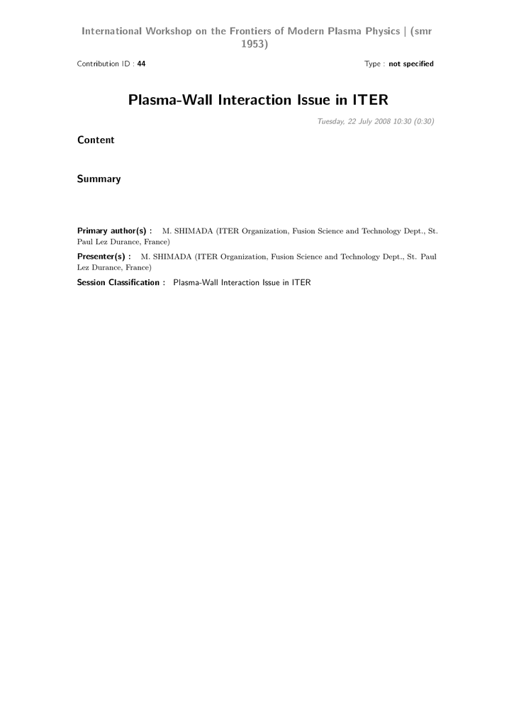 International Workshop on the Frontiers of Modern Plasma Physics | (smr 1953) Contribution ID : 44 Type : not specied Plasma-Wall Interaction Issue in ITER Tuesday, 22 July 2008 10:30 (0:30) Content Summary Primary author(s) : M. SHIMADA (ITER Organization, Fusion Science and Technology Dept., St. Paul Lez Durance, France) Presenter(s) : M. SHIMADA (ITER Organization, Fusion Science and Technology Dept., St. Paul Lez Durance, France) Session Classication : Plasma-Wall Interaction Issue in ITER