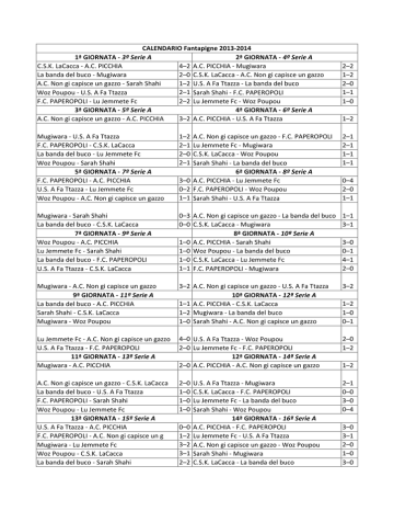 CALENDARIO Fantapigne 2013-2014 1ª GIORNATA - 3ª Serie A 2ª GIORNATA - 4ª Serie A 4–2 A.C. PICCHIA - Mugiwara C.S.K. LaCacca - A.C. PICCHIA 2–0 C.S.K. LaCacca - A.C. Non gi capisce un gazzo La banda del buco - Mugiwara 1–2 U.S. A Fa Ttazza - La banda del buco A.C. Non gi capisce un gazzo - Sarah Shahi 2–1 Sarah Shahi - F.C. PAPEROPOLI Woz Poupou - U.S. A Fa Ttazza 2–2 Lu Jemmete Fc - Woz Poupou F.C. PAPEROPOLI - Lu Jemmete Fc 3ª GIORNATA - 5ª Serie A 4ª GIORNATA - 6ª Serie A 3–2 A.C. PICCHIA - U.S. A Fa Ttazza A.C. Non gi capisce un gazzo - A.C. PICCHIA 2–2 1–2 2–0 1–1 1–0 1–2 Mugiwara - U.S. A Fa Ttazza F.C. PAPEROPOLI - C.S.K. LaCacca La banda del buco - Lu Jemmete Fc Woz Poupou - Sarah Shahi 5ª GIORNATA - 7ª Serie A F.C. PAPEROPOLI - A.C. PICCHIA U.S. A Fa Ttazza - Lu Jemmete Fc Woz Poupou - A.C. Non gi capisce un gazzo 1–2 2–1 2–0 2–1 A.C. Non gi capisce un gazzo - F.C. PAPEROPOLI Lu Jemmete Fc - Mugiwara C.S.K. LaCacca - Woz Poupou Sarah Shahi - La banda del buco 6ª GIORNATA - 8ª Serie A 3–0 A.C. PICCHIA - Lu Jemmete Fc 0–2 F.C. PAPEROPOLI - Woz Poupou 1–1 Sarah Shahi - U.S. A Fa Ttazza 2–1 2–1 1–1 1–1 Mugiwara - Sarah Shahi La banda del buco - C.S.K. LaCacca 7ª GIORNATA - 9ª Serie A Woz Poupou - A.C. PICCHIA Lu Jemmete Fc - Sarah Shahi La banda del buco - F.C. PAPEROPOLI U.S. A Fa Ttazza - C.S.K. LaCacca 0–3 A.C. Non gi capisce un gazzo - La banda del buco 0–0 C.S.K. LaCacca - Mugiwara 8ª GIORNATA - 10ª Serie A 1–0 A.C. PICCHIA - Sarah Shahi 1–0 Woz Poupou - La banda del buco 1–0 C.S.K. LaCacca - Lu Jemmete Fc 1–1 F.C. PAPEROPOLI - Mugiwara 1–1 3–1 Mugiwara - A.C. Non gi capisce un gazzo 9ª GIORNATA - 11ª Serie A La banda del buco - A.C. PICCHIA Sarah Shahi - C.S.K. LaCacca Mugiwara - Woz Poupou 3–2 A.C. Non gi capisce un gazzo - U.S. A Fa Ttazza 10ª GIORNATA - 12ª Serie A 1–1 A.C. PICCHIA - C.S.K. LaCacca 1–2 Mugiwara - La banda del buco 1–0 Sarah Shahi - A.C. Non gi capisce un gazzo 3–2 Lu Jemmete Fc - A.C. Non gi capisce un gazzo U.S. A Fa Ttazza - F.C. PAPEROPOLI 11ª GIORNATA - 13ª Serie A Mugiwara - A.C. PICCHIA 4–0 U.S. A Fa Ttazza - Woz Poupou 2–0 Lu Jemmete Fc - F.C. PAPEROPOLI 12ª GIORNATA - 14ª Serie A 2–0 A.C. PICCHIA - A.C. Non gi capisce un gazzo 2–0 1–2 A.C. Non gi capisce un gazzo - C.S.K. LaCacca La banda del buco - U.S. A Fa Ttazza F.C. PAPEROPOLI - Sarah Shahi Woz Poupou - Lu Jemmete Fc 13ª GIORNATA - 15ª Serie A U.S. A Fa Ttazza - A.C. PICCHIA F.C. PAPEROPOLI - A.C. Non gi capisce un g Mugiwara - Lu Jemmete Fc Woz Poupou - C.S.K. LaCacca La banda del buco - Sarah Shahi 2–0 1–0 1–0 1–0 2–1 0–0 3–0 0–4 0–0 1–2 3–2 3–1 2–2 U.S. A Fa Ttazza - Mugiwara C.S.K. LaCacca - F.C. PAPEROPOLI Lu Jemmete Fc - La banda del buco Sarah Shahi - Woz Poupou 14ª GIORNATA - 16ª Serie A A.C. PICCHIA - F.C. PAPEROPOLI Lu Jemmete Fc - U.S. A Fa Ttazza A.C. Non gi capisce un gazzo - Woz Poupou Sarah Shahi - Mugiwara C.S.K. LaCacca - La banda del buco 0–4 2–0 1–1 3–0 0–1 4–1 2–0 1–2 1–0 0–1 1–2 3–0 3–1 2–0 1–0 3–0 15ª GIORNATA - 17ª Serie A Lu Jemmete Fc - A.C. PICCHIA Woz Poupou - F.C. PAPEROPOLI U.S. A Fa Ttazza - Sarah Shahi La banda del buco - A.C. Non gi capisce un gazzo Mugiwara - C.S.K. LaCacca 17ª GIORNATA - 19ª Serie A Sarah Shahi - A.C. PICCHIA La banda del buco - Woz Poupou Lu Jemmete Fc - C.S.K. LaCacca Mugiwara - F.C. PAPEROPOLI 16ª GIORNATA - 18ª Serie A 3–1 A.C. PICCHIA - Woz Poupou 2–2 Sarah Shahi - Lu Jemmete Fc 1–1 F.C. PAPEROPOLI - La banda del buco 2–1 C.S.K. LaCacca - U.S. A Fa Ttazza 3–2 A.C. Non gi capisce un gazzo - Mugiwara 18ª GIORNATA - 20ª Serie A 2–0 A.C. PICCHIA - La banda del buco 3–1 C.S.K. LaCacca - Sarah Shahi 2–3 Woz Poupou - Mugiwara 3–0 A.C. Non gi capisce un gazzo - Lu Jemmete Fc 3–0 2–1 U.S. A Fa Ttazza - A.C. Non gi capisce un gazzo 19ª GIORNATA - 21ª Serie A C.S.K. LaCacca - A.C. PICCHIA La banda del buco - Mugiwara A.C. Non gi capisce un gazzo - Sarah Shahi Woz Poupou - U.S. A Fa Ttazza F.C. PAPEROPOLI - Lu Jemmete Fc 21ª GIORNATA - 23ª Serie A A.C. Non gi capisce un gazzo - A.C. PICCHIA 1–0 F.C. PAPEROPOLI - U.S. A Fa Ttazza 20ª GIORNATA - 22ª Serie A 3–1 A.C. PICCHIA - Mugiwara 1–1 C.S.K. LaCacca - A.C. Non gi capisce un gazzo 2–0 U.S. A Fa Ttazza - La banda del buco 0–2 Sarah Shahi - F.C. PAPEROPOLI 1–1 Lu Jemmete Fc - Woz Poupou 22ª GIORNATA - 24ª Serie A 2–2 A.C. PICCHIA - U.S. A Fa Ttazza 3–1 1–0 3–1 0–1 1–3 4–0 Mugiwara - U.S. A Fa Ttazza F.C. PAPEROPOLI - C.S.K. LaCacca La banda del buco - Lu Jemmete Fc Woz Poupou - Sarah Shahi 23ª GIORNATA - 25ª Serie A F.C. PAPEROPOLI - A.C. PICCHIA U.S. A Fa Ttazza - Lu Jemmete Fc Woz Poupou - A.C. Non gi capisce un gazzo 1–0 2–0 0–1 1–0 A.C. Non gi capisce un gazzo - F.C. PAPEROPOLI Lu Jemmete Fc - Mugiwara C.S.K. LaCacca - Woz Poupou Sarah Shahi - La banda del buco 24ª GIORNATA - 26ª Serie A 2–2 A.C. PICCHIA - Lu Jemmete Fc 1–0 F.C. PAPEROPOLI - Woz Poupou 2–2 Sarah Shahi - U.S. A Fa Ttazza 2–2 0–2 2–1 2–1 Mugiwara - Sarah Shahi La banda del buco - C.S.K. LaCacca 25ª GIORNATA - 27ª Serie A Woz Poupou - A.C. PICCHIA Lu Jemmete Fc - Sarah Shahi La banda del buco - F.C. PAPEROPOLI U.S. A Fa Ttazza - C.S.K. LaCacca 0–0 A.C. Non gi capisce un gazzo - La banda del buco 0–2 C.S.K. LaCacca - Mugiwara 26ª GIORNATA - 28ª Serie A 1–0 A.C. PICCHIA - Sarah Shahi 3–0 Woz Poupou - La banda del buco 0–1 C.S.K. LaCacca - Lu Jemmete Fc 1–0 F.C. PAPEROPOLI - Mugiwara 2–0 1–1 Mugiwara - A.C. Non gi capisce un gazzo 27ª GIORNATA - 29ª Serie A La banda del buco - A.C. PICCHIA Sarah Shahi - C.S.K. LaCacca Mugiwara - Woz Poupou 1–1 A.C. Non gi capisce un gazzo - U.S. A Fa Ttazza 28ª GIORNATA - 30ª Serie A 0–1 A.C. PICCHIA - C.S.K. LaCacca 2–2 Mugiwara - La banda del buco 1–0 Sarah Shahi - A.C. Non gi capisce un gazzo 2–2 0–0 1–0 1–2 